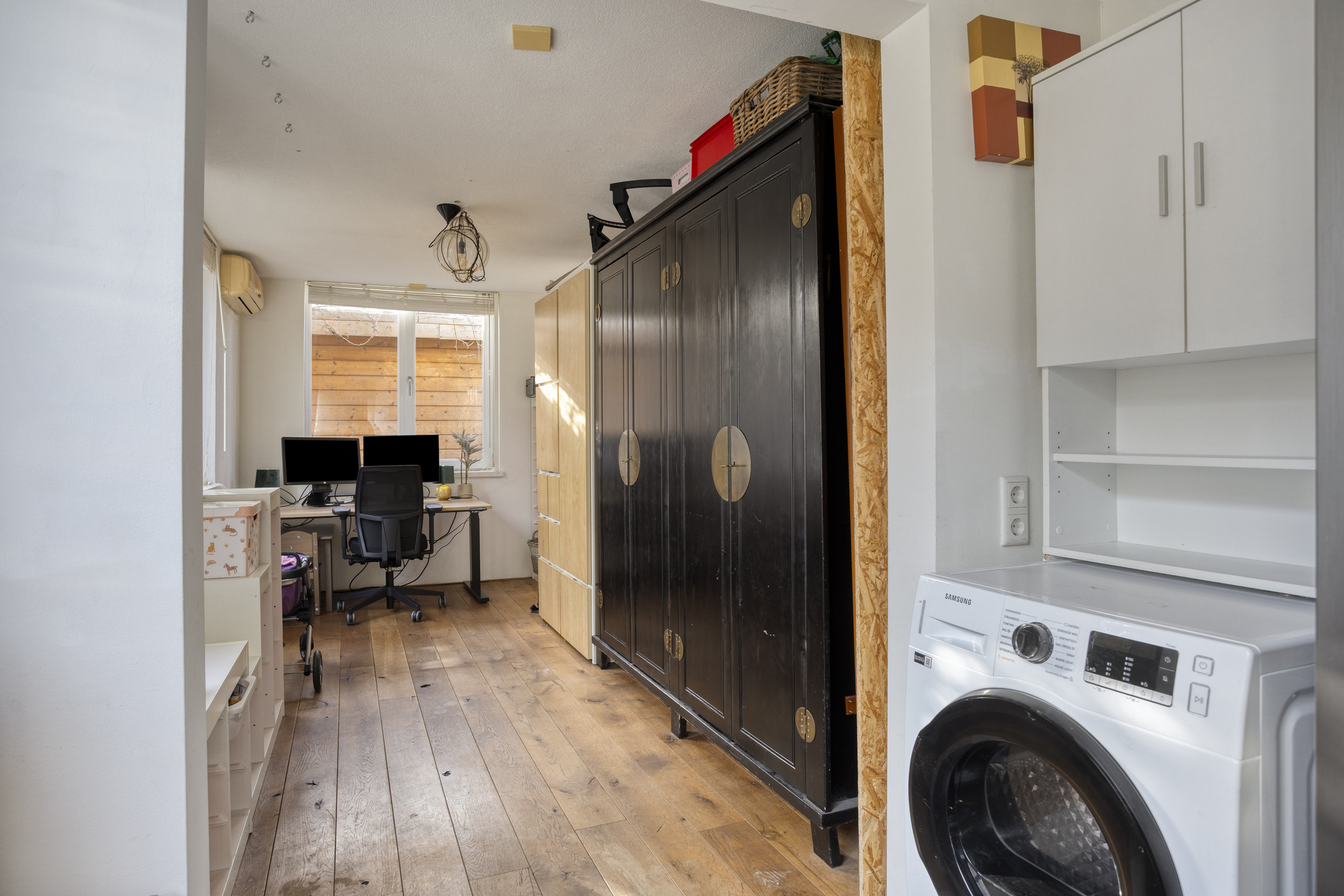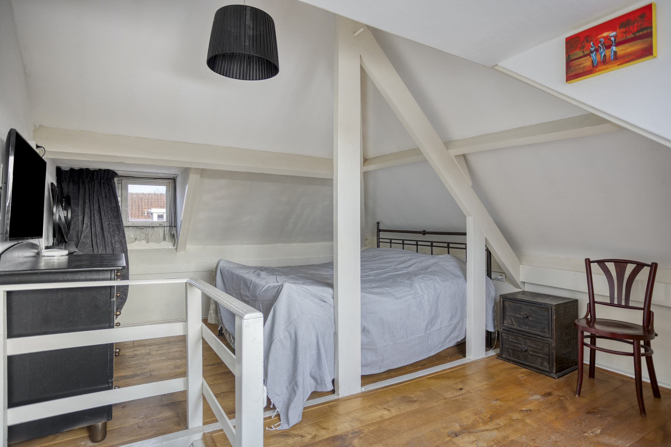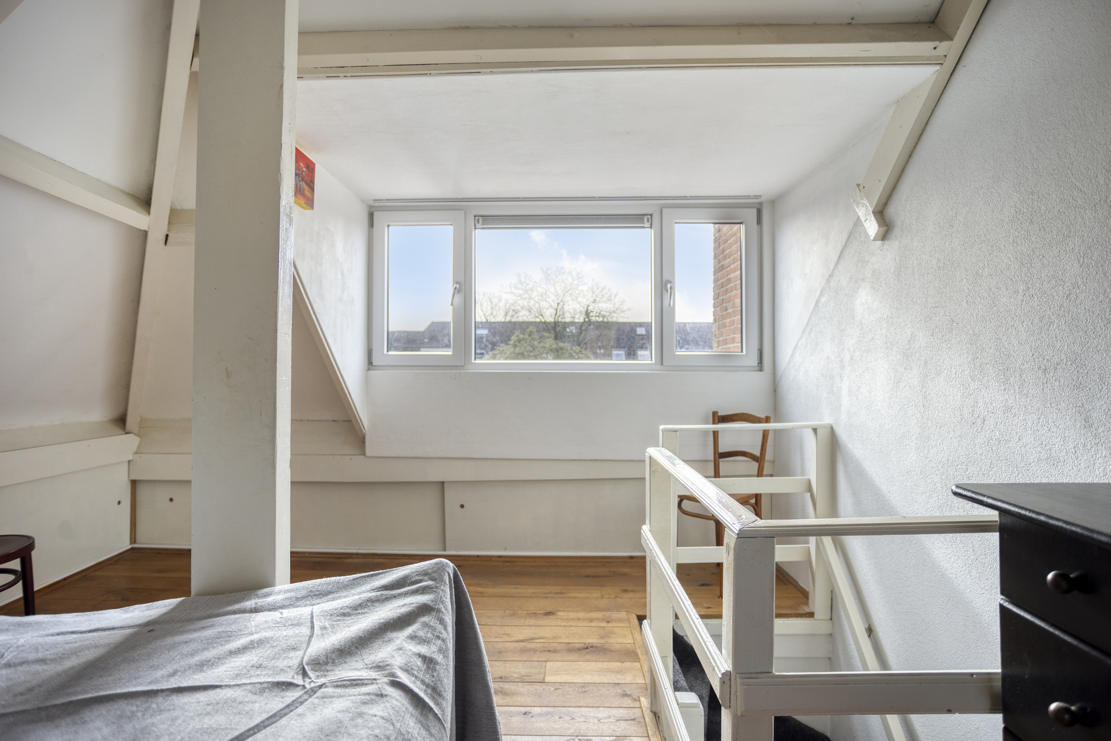 Een vaste trap brengt u naar de tweede verdieping. Dankzij de dakkapel aan de voorzijde en het raam aan de achterzijde is dit een fijne, open en lichte ruimte die zich uitstekend leent als volwaardige slaap-, werk- of tienerkamer. Onder de schuine kap is praktische opbergruimte aanwezig.