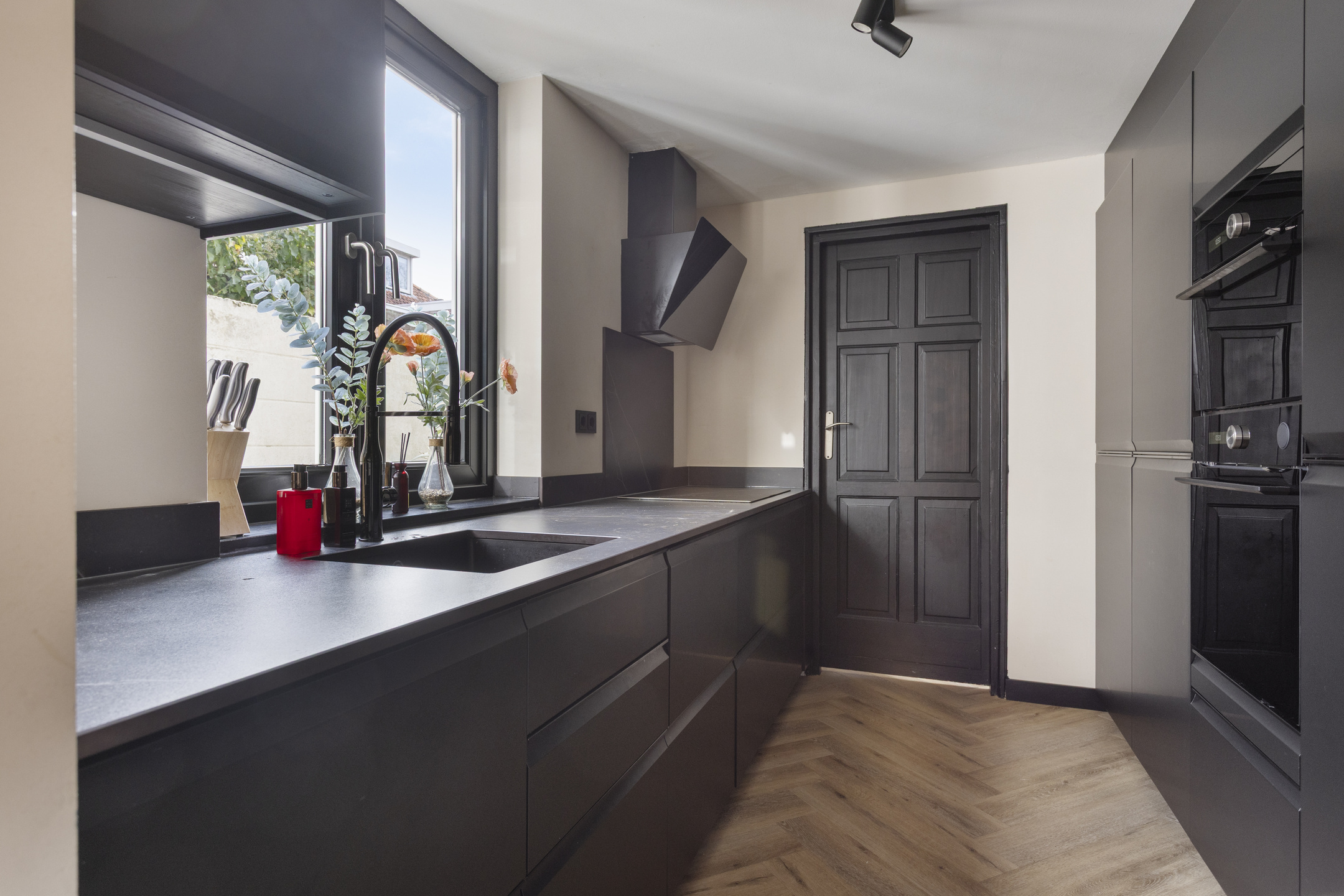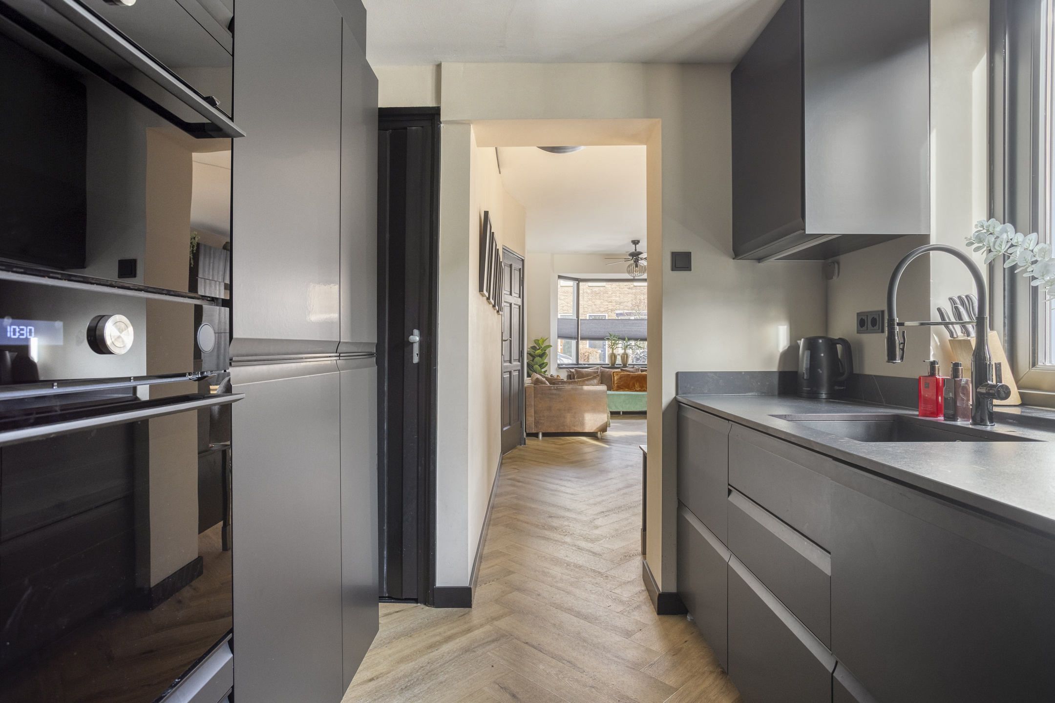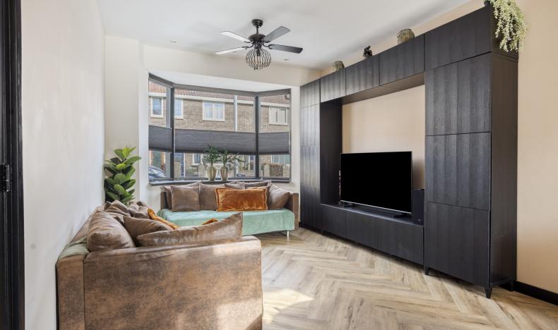De indeling Via de nette entree betreedt u de hal met trapopgang en toegang tot de woonkamer. Direct valt de doorlopende visgraatvloer op, die het leefgedeelte een warme en eigentijdse uitstraling geeft. Aan de voorzijde zorgt de erker voor een prettige lichtinval in het sfeervolle zitgedeelte. Aan de achterzijde beschikt de leefruimte over een fijn eetgedeelte waar openslaande tuindeuren zorgen voor een directe verbinding met buiten. Direct grenzend aan de woonkamer treft u de keuken aan. Hier is het interieur strak uitgevoerd en praktisch ingedeeld, met een inductiekookplaat, afzuigkap, dubbele combi-oven, koel-/vrieskast, vaatwasser en voldoende werkruimte. Achter de keuken bevindt zich een tussenhal met toegang tot het toilet, een berging met witgoedaansluitingen en de bijkeuken. Vanuit de bijkeuken bereikt u tevens de extra, multifunctionele kamer met directe toegang tot de tuin. Ideaal als thuiswerkplek, speelkamer of hobbyruimte.