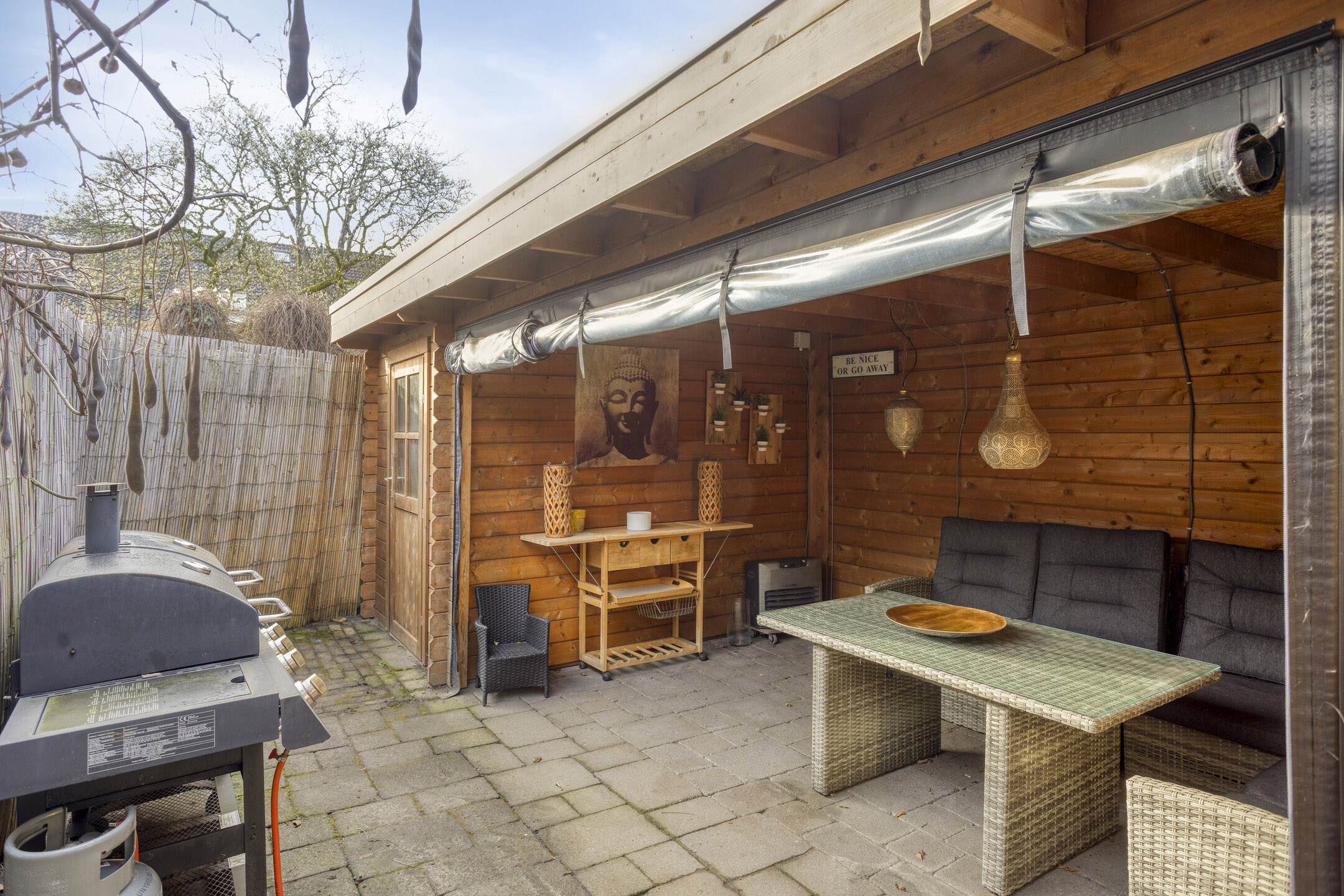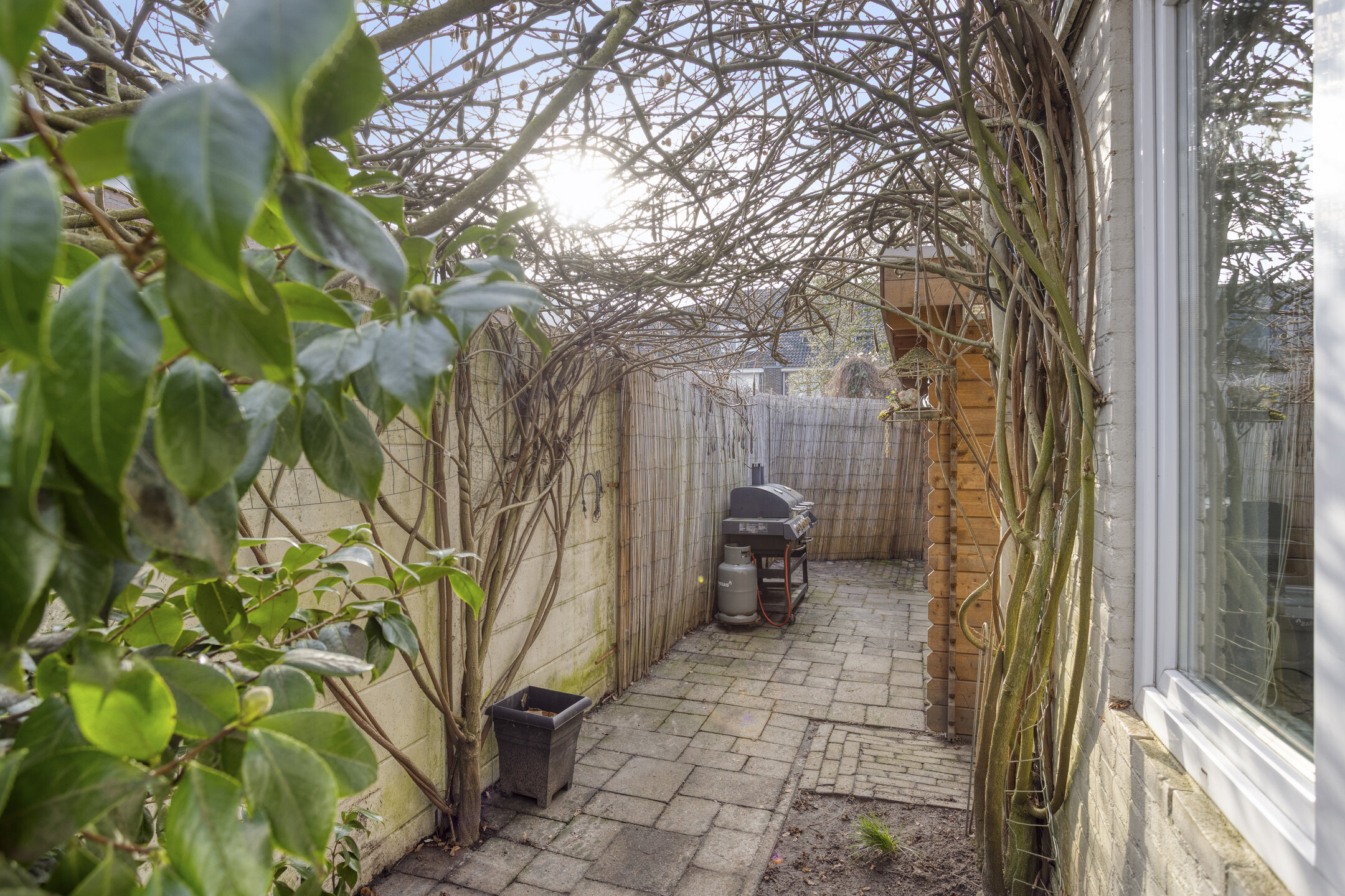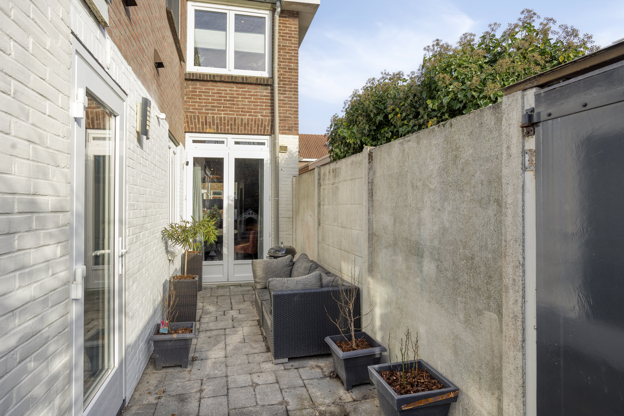 Buitenruimte De achtertuin is onderhoudsvriendelijk aangelegd en biedt volop privacy. Achter in de geheel betegelde tuin kunt u van lange avonden buiten genieten onder de houten overkapping met aangrenzende berging voor fietsen en/of tuingereedschap.