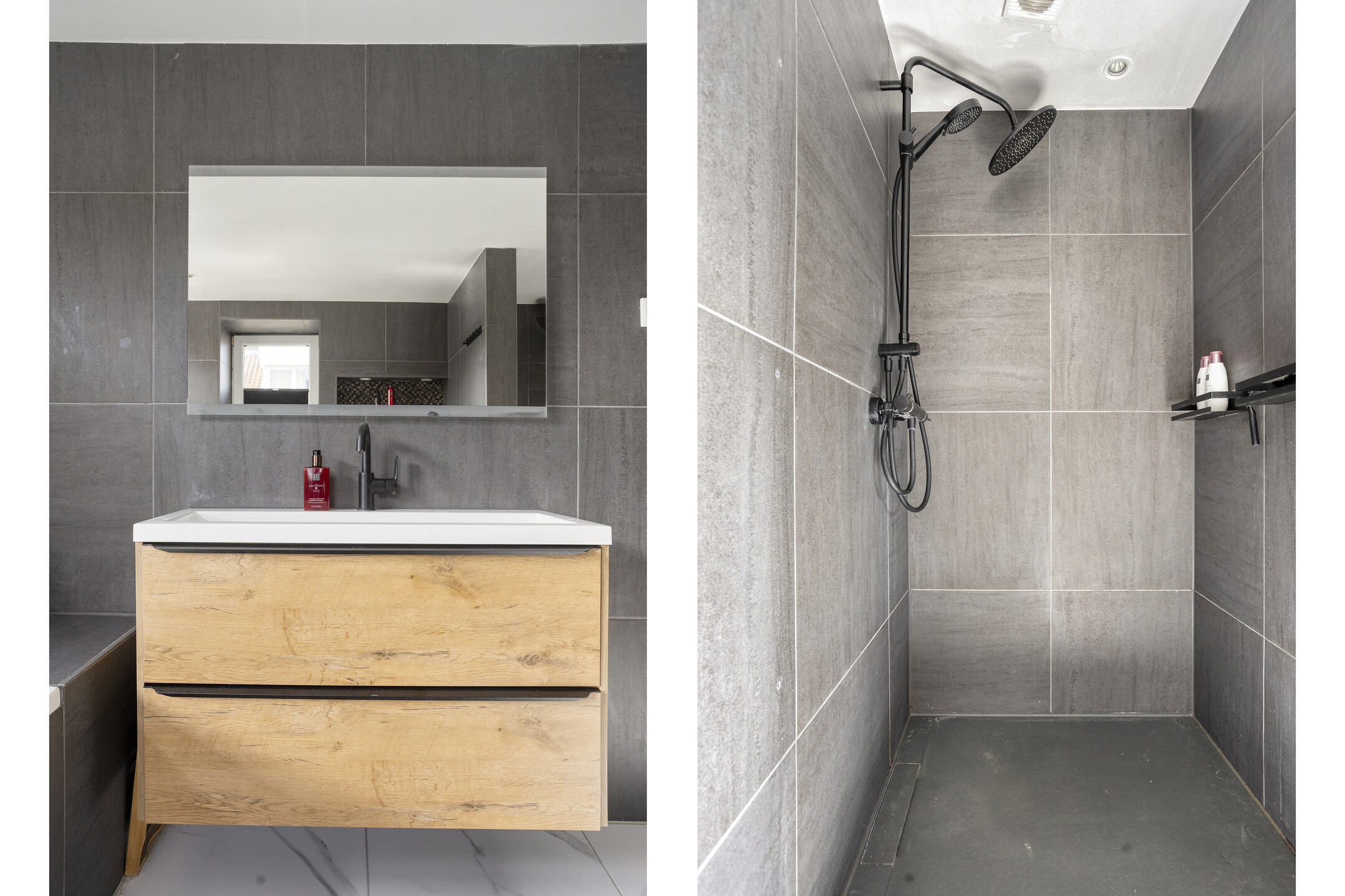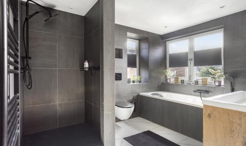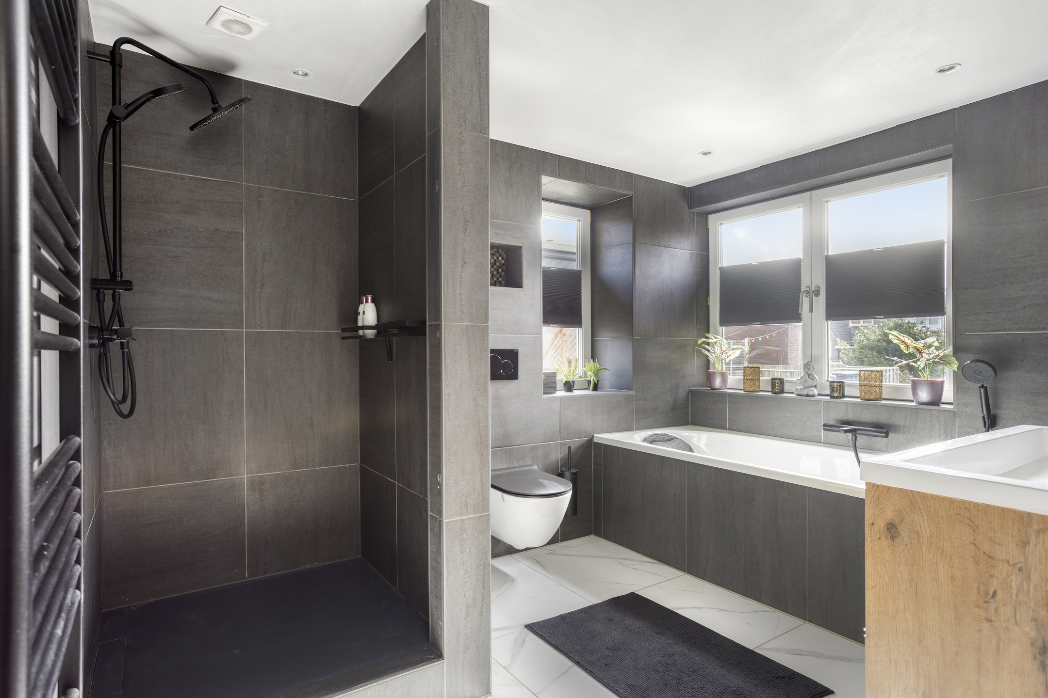 De eerste verdieping biedt twee slaapkamers, een walk-in-closet en een royale badkamer. De kamers zijn allen netjes afgewerkt, profiteren van veel daglicht en zijn comfortabel van formaat. De badkamer is modern en luxe uitgevoerd met een inloopdouche, een ligbad, een praktisch wastafelmeubel en een wandcloset. De donkere tegels en strakke afwerking geven deze ruimte een rustige uitstraling.