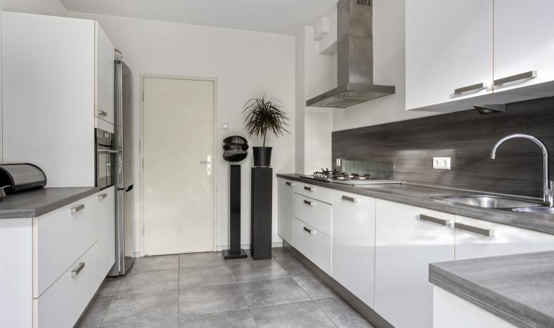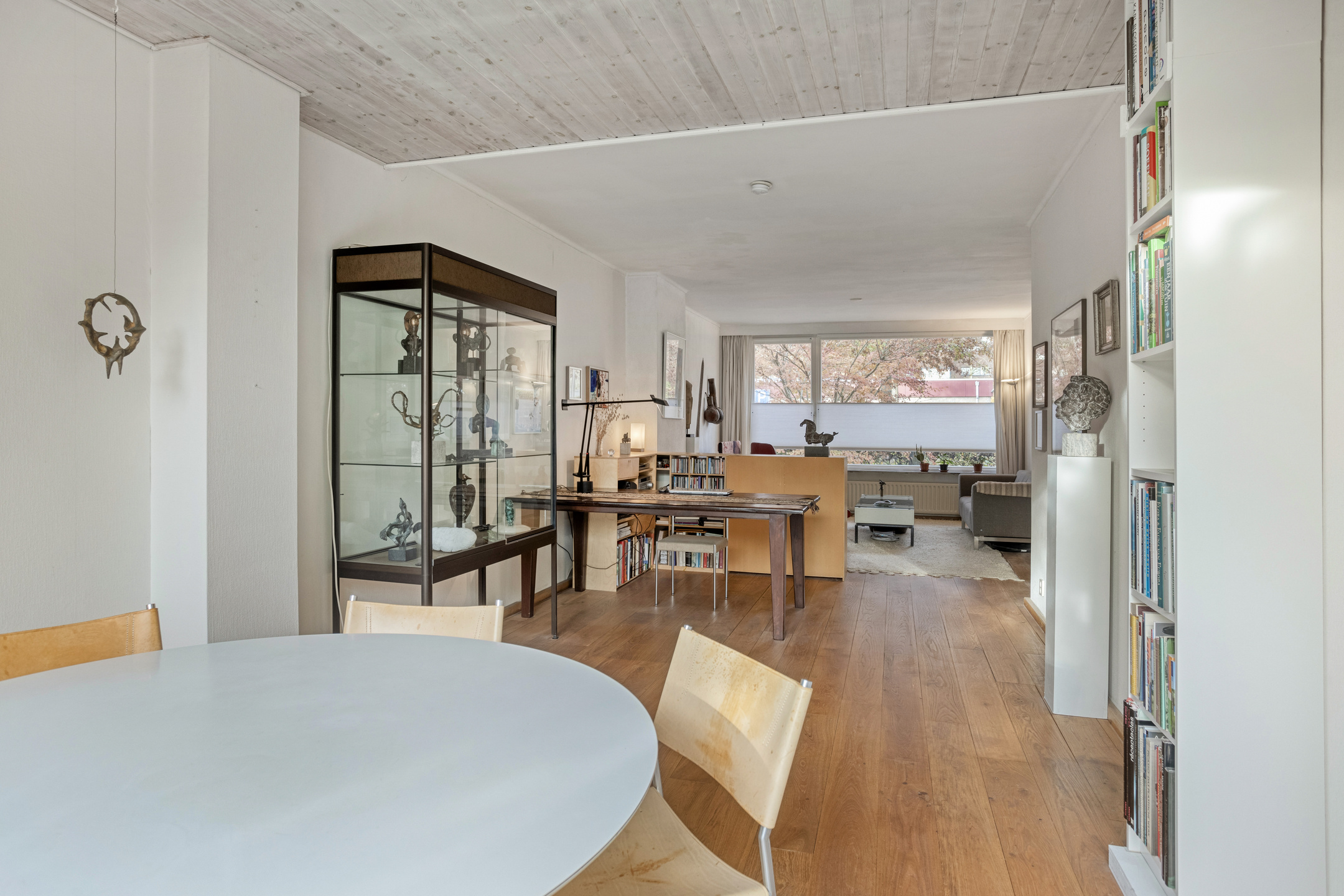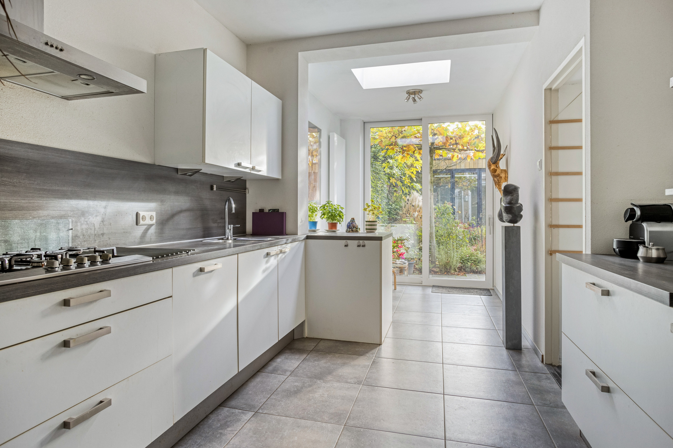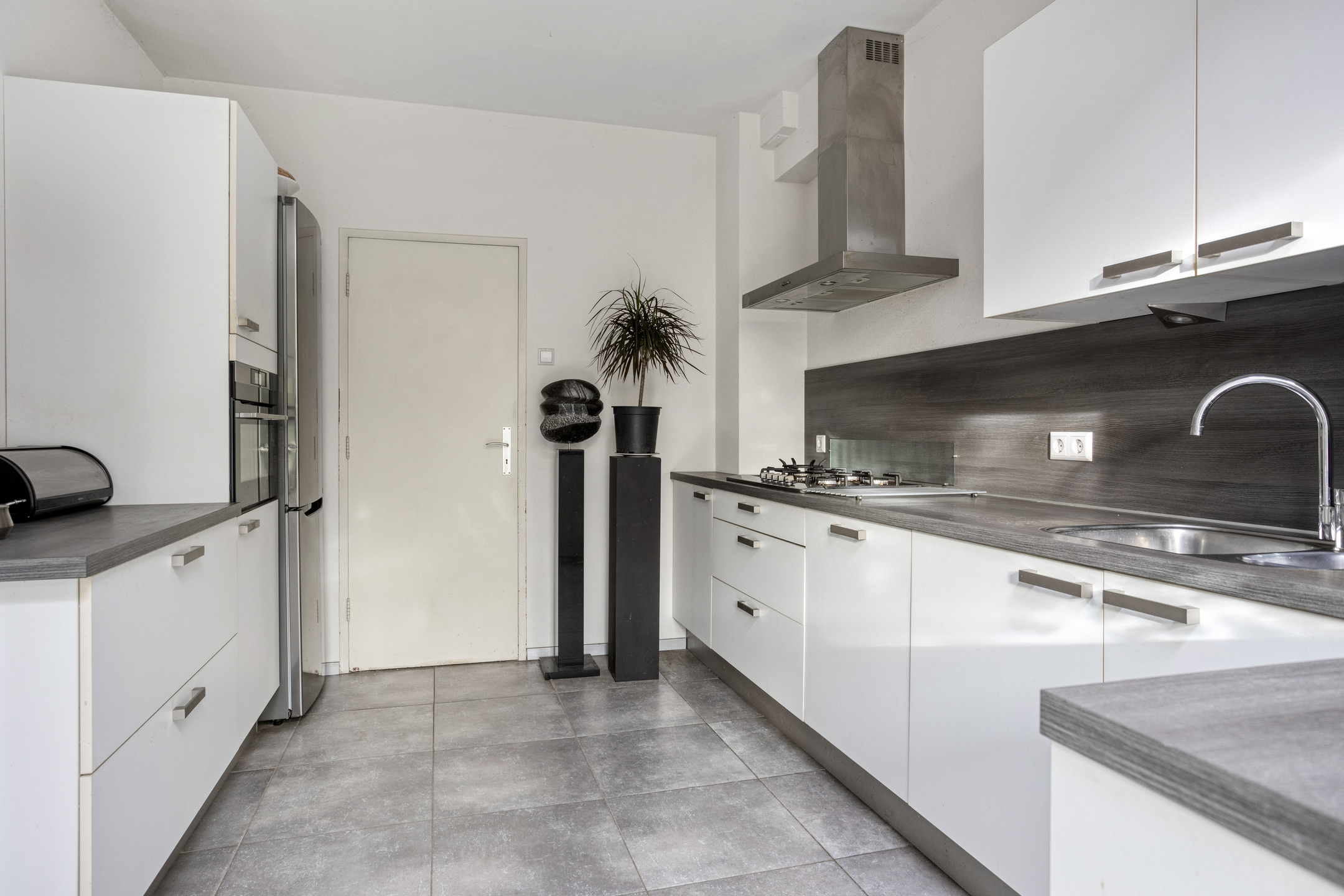 Binnenkomen – en meteen snappen dat het groter is dan je dacht De voordeur geeft nog niet alles prijs. Maar eenmaal binnen voelt het meteen ruim en licht. De doorzonwoonkamer heeft grote raampartijen en een schuifpui naar de tuin, waardoor het daglicht rijkelijk binnenvalt. De houten vloer en neutrale afwerking zorgen voor een fijne basis. Er is volop plek voor een royale zithoek en een grote eettafel. De keuken ligt aan de achterzijde en is modern uitgevoerd met witte fronten, een donker werkblad en diverse inbouwapparatuur zoals een gaskookplaat, afzuigkap, combi-oven en vaatwasser.