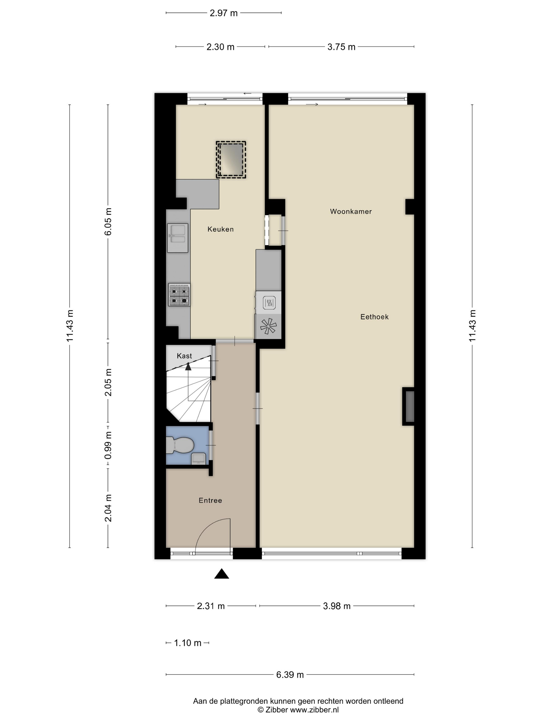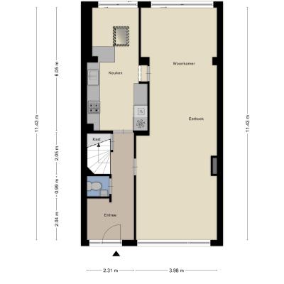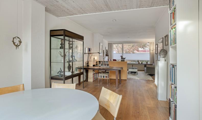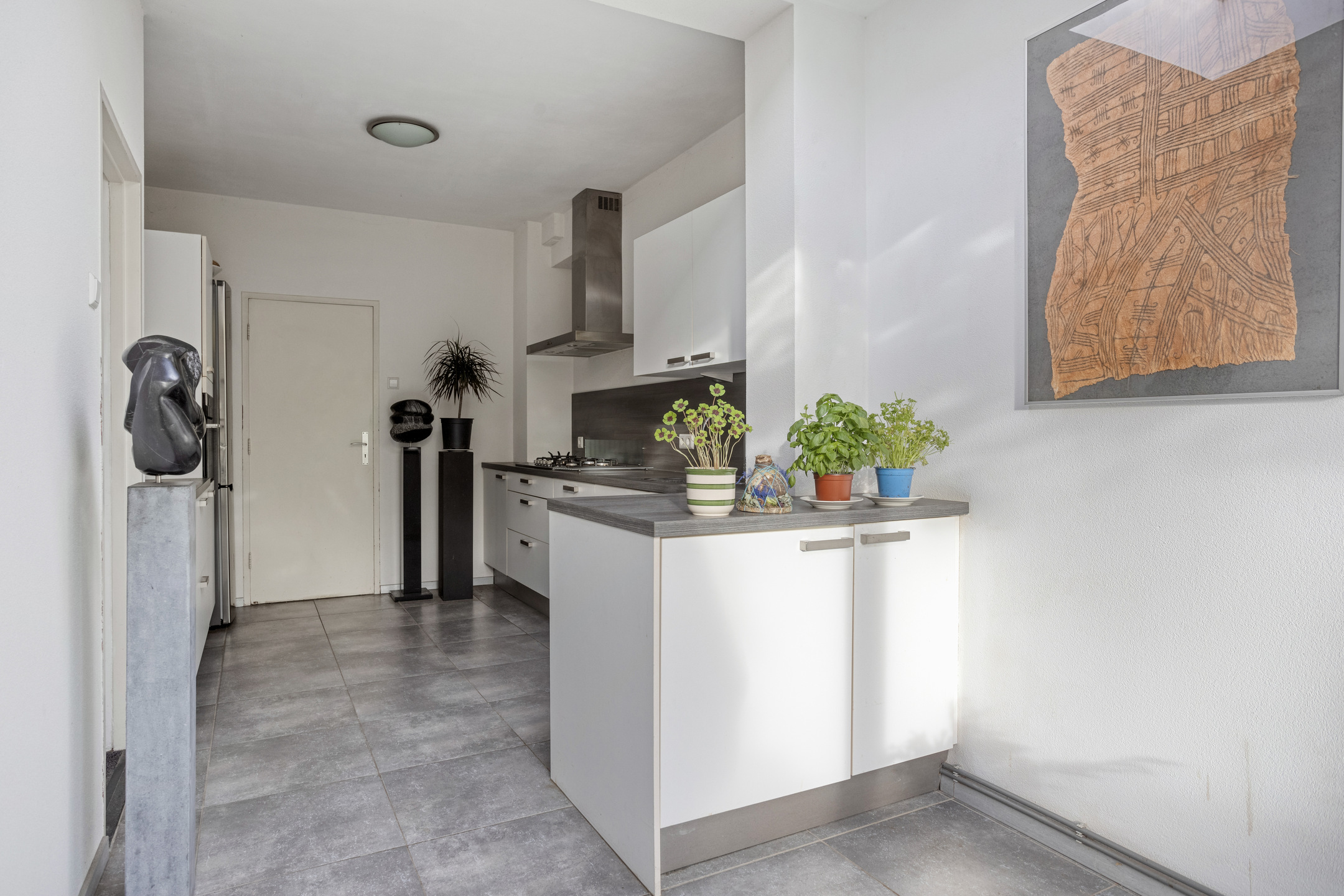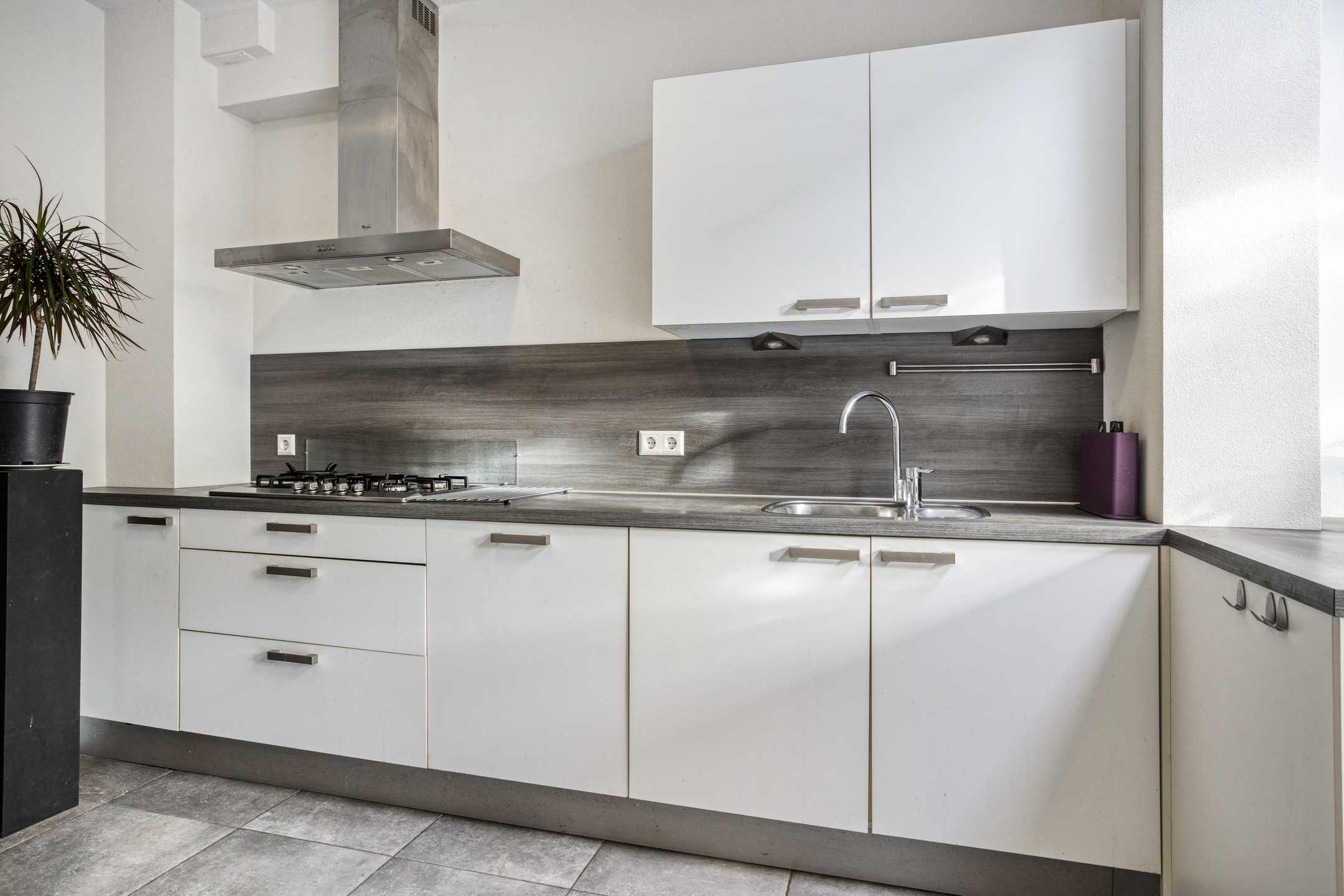 Binnenkomen – en meteen snappen dat het groter is dan je dacht De voordeur geeft nog niet alles prijs. Maar eenmaal binnen voelt het meteen ruim en licht. De doorzonwoonkamer heeft grote raampartijen en een schuifpui naar de tuin, waardoor het daglicht rijkelijk binnenvalt. De houten vloer en neutrale afwerking zorgen voor een fijne basis. Er is volop plek voor een royale zithoek en een grote eettafel. De keuken ligt aan de achterzijde en is modern uitgevoerd met witte fronten, een donker werkblad en diverse inbouwapparatuur zoals een gaskookplaat, afzuigkap, combi-oven en vaatwasser.