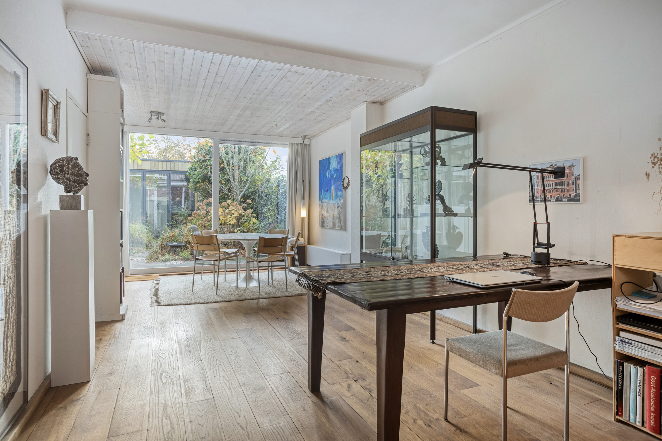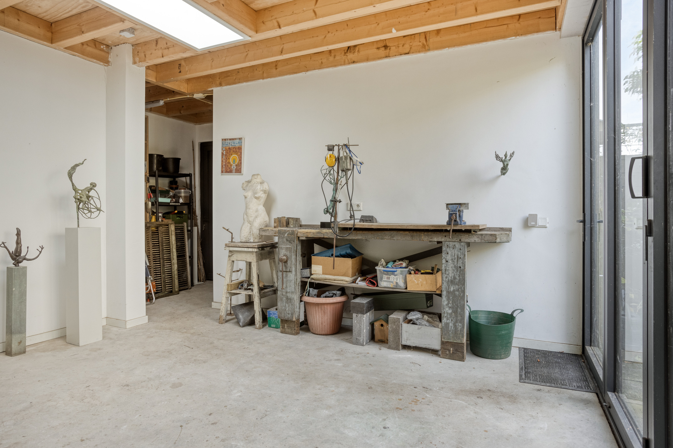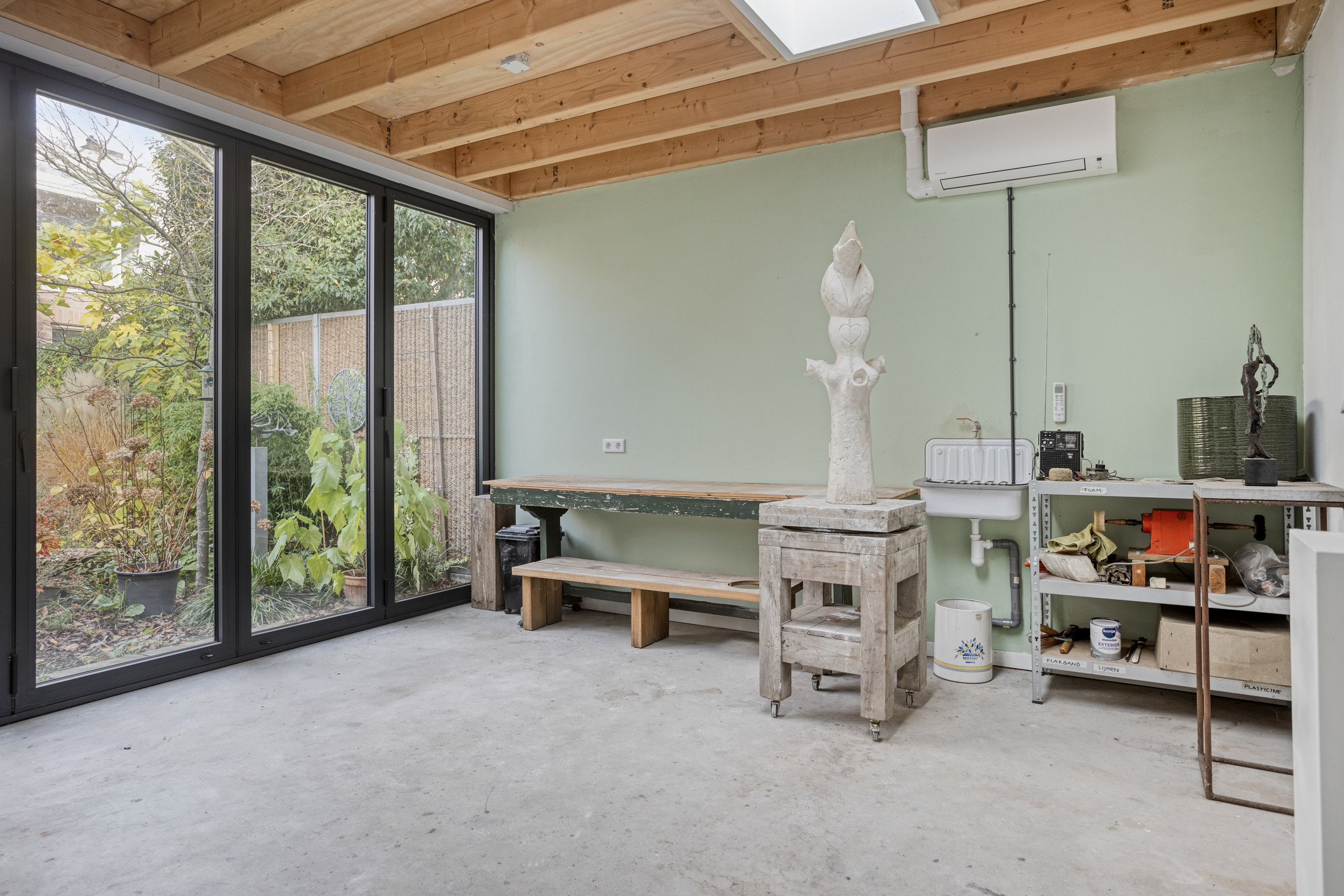 Vrijstaand atelier – een volwaardige extra ruimte Achterin de tuin staat een volledig geïsoleerd tuinhuis dat echt als extra leef- of werkruimte functioneert. Met grote glazen schuifdeuren, een lichtstraat, betonnen vloer, wateraansluiting en airconditioning is dit een plek waar je serieus iets mee kunt. Werkruimte, atelier, praktijk/kantoor aan huis of gastenverblijf – het kan hier allemaal, los van de woning zelf.