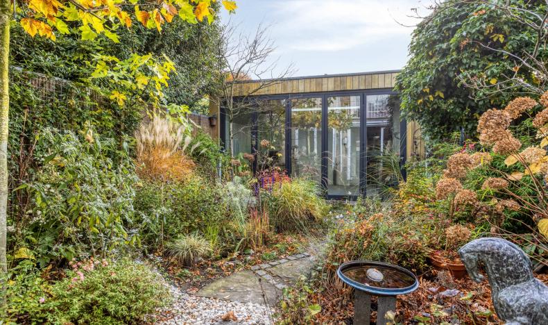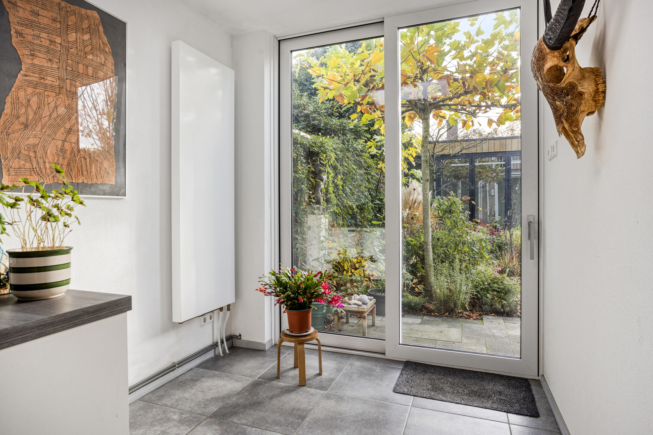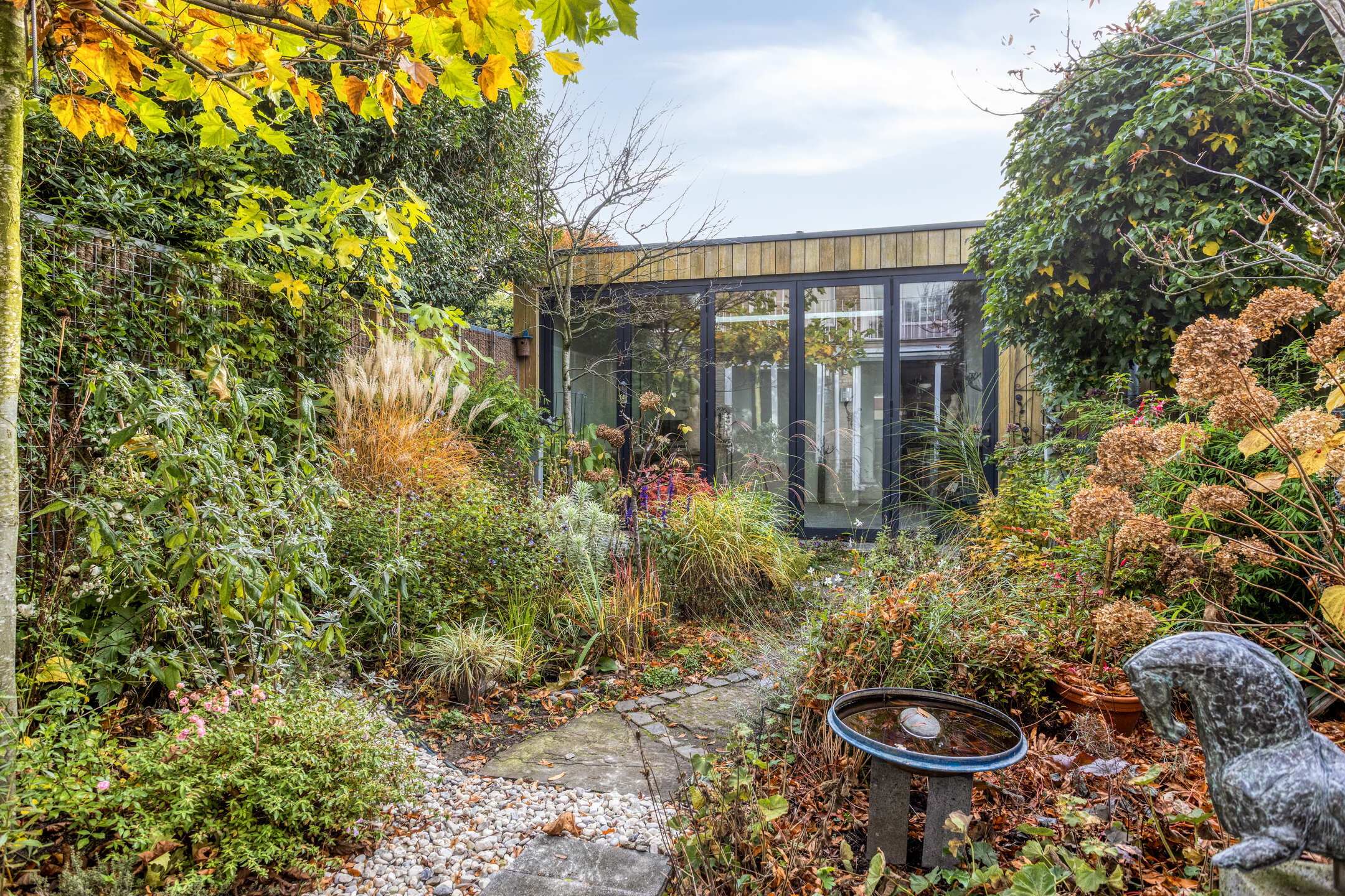 Vrijstaand atelier – een volwaardige extra ruimte Achterin de tuin staat een volledig geïsoleerd tuinhuis dat echt als extra leef- of werkruimte functioneert. Met grote glazen schuifdeuren, een lichtstraat, betonnen vloer, wateraansluiting en airconditioning is dit een plek waar je serieus iets mee kunt. Werkruimte, atelier, praktijk/kantoor aan huis of gastenverblijf – het kan hier allemaal, los van de woning zelf.
