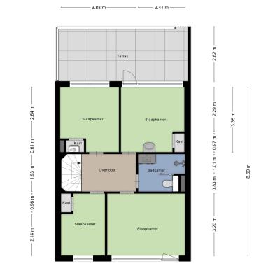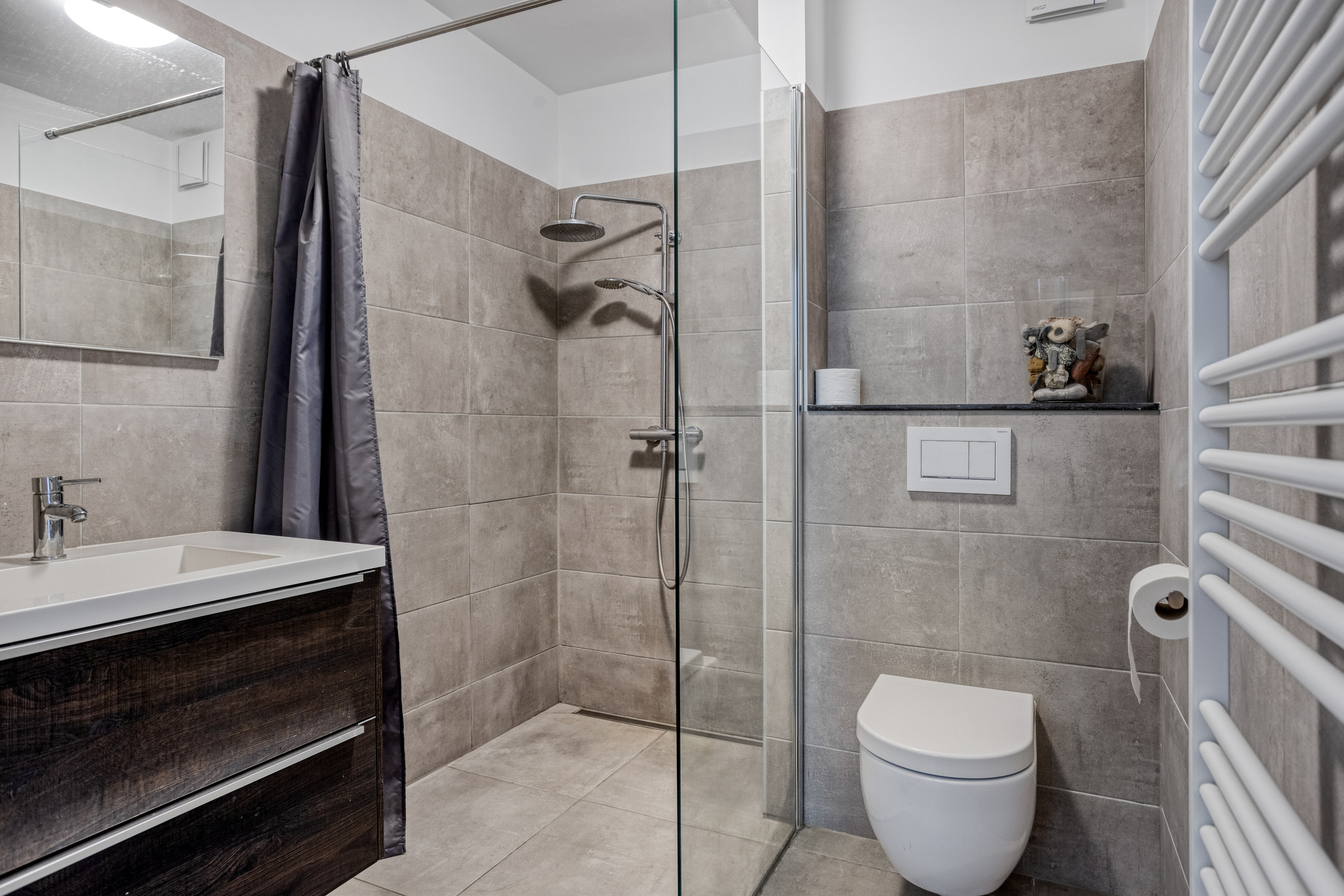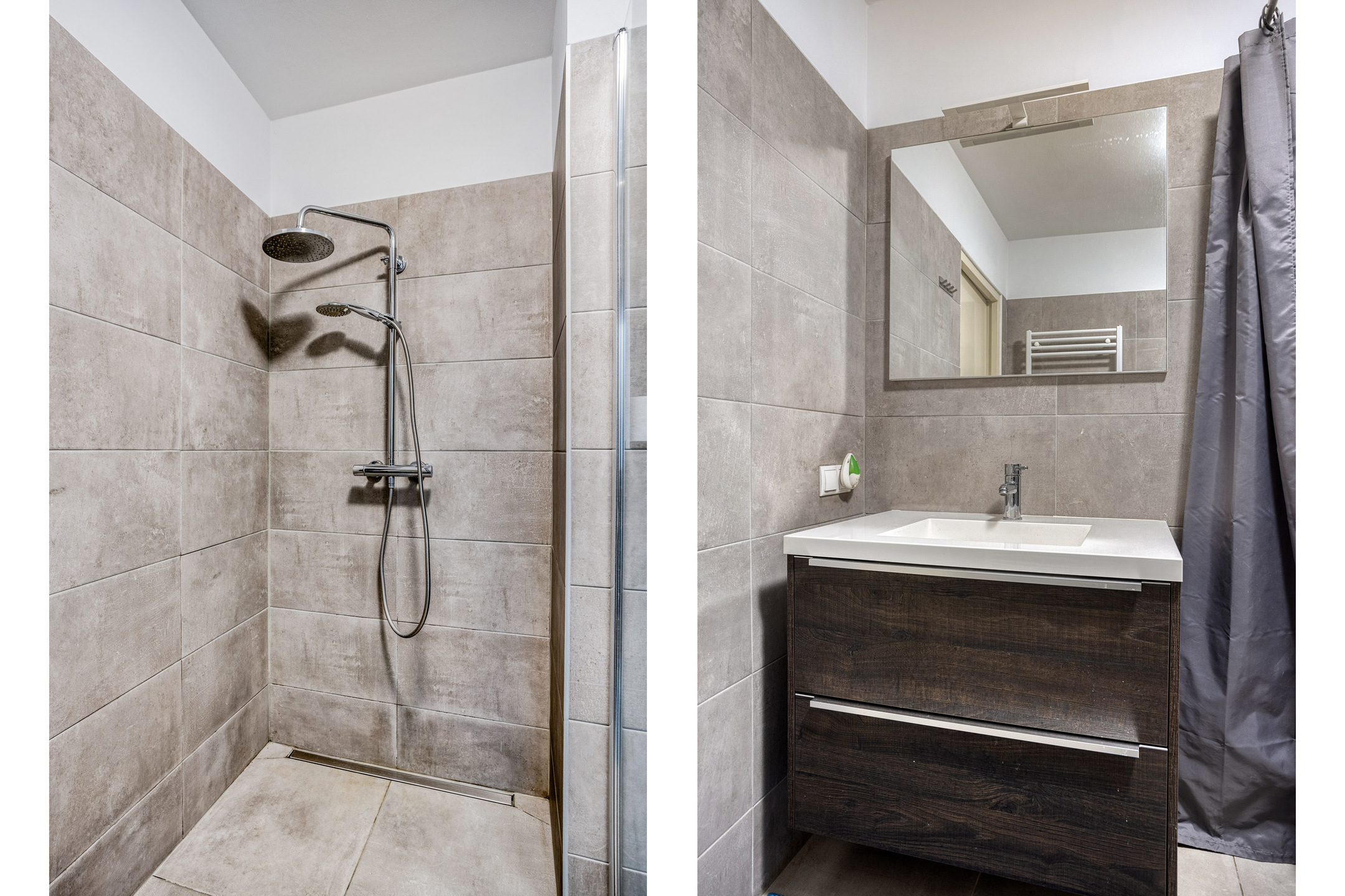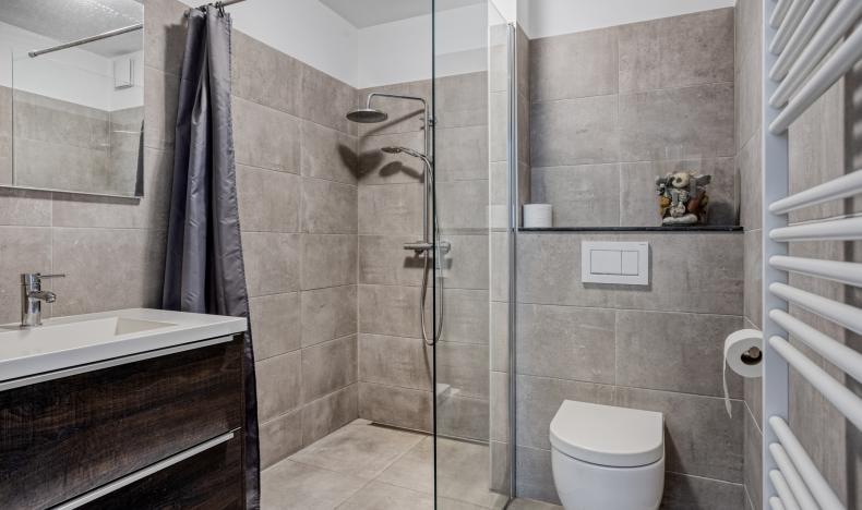 Eerste verdieping – iedereen z’n eigen plek Boven gaat het net zo overtuigend door. Vier slaapkamers op de eerste verdieping, allemaal met prettig licht, waarvan drie met vaste kastruimte. Vanuit één van de kamers stap je zo het brede dakterras op, dat over de volle breedte van de woning loopt. De badkamer is modern en strak, met een regendouche, wastafelmeubel en toilet.