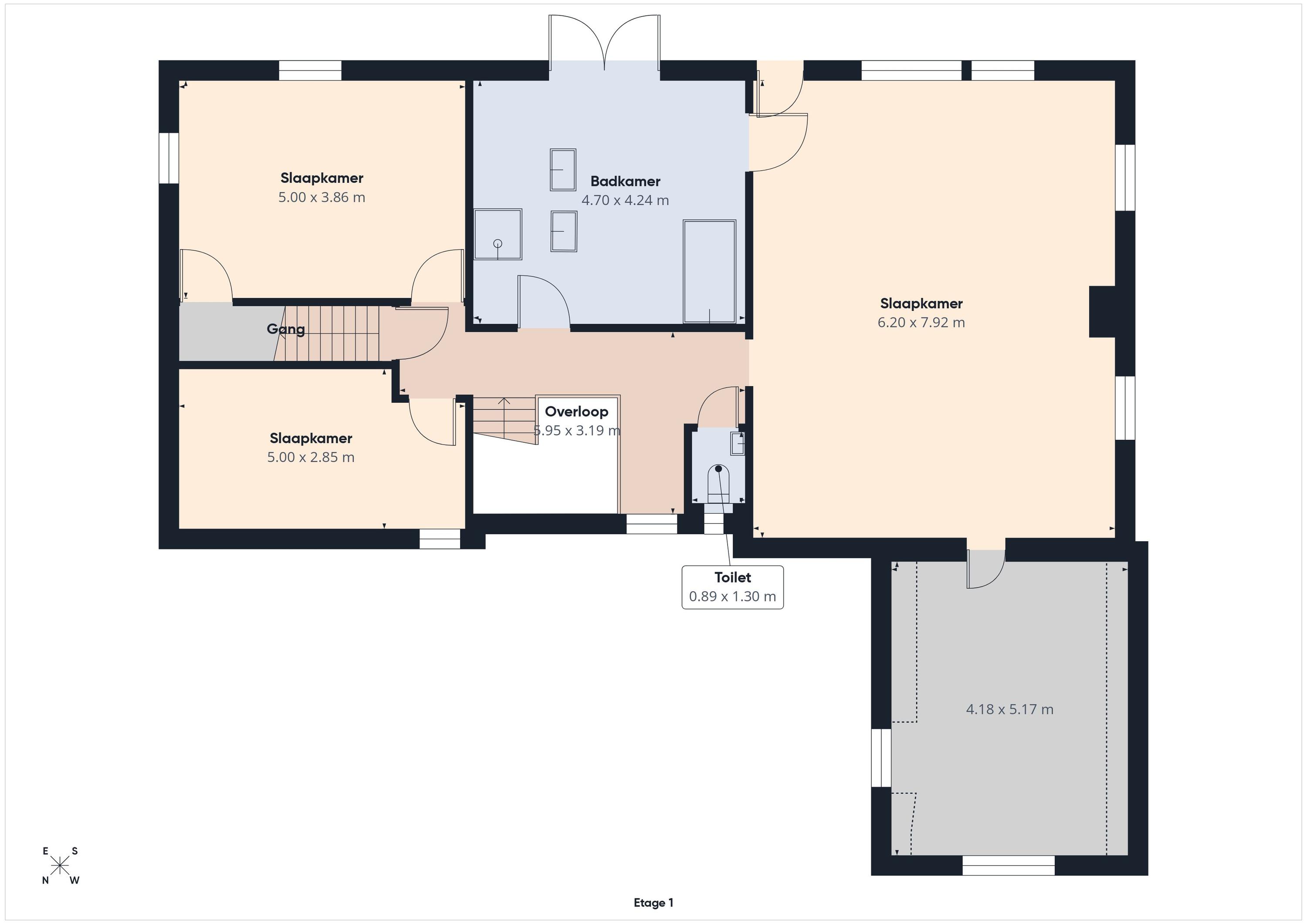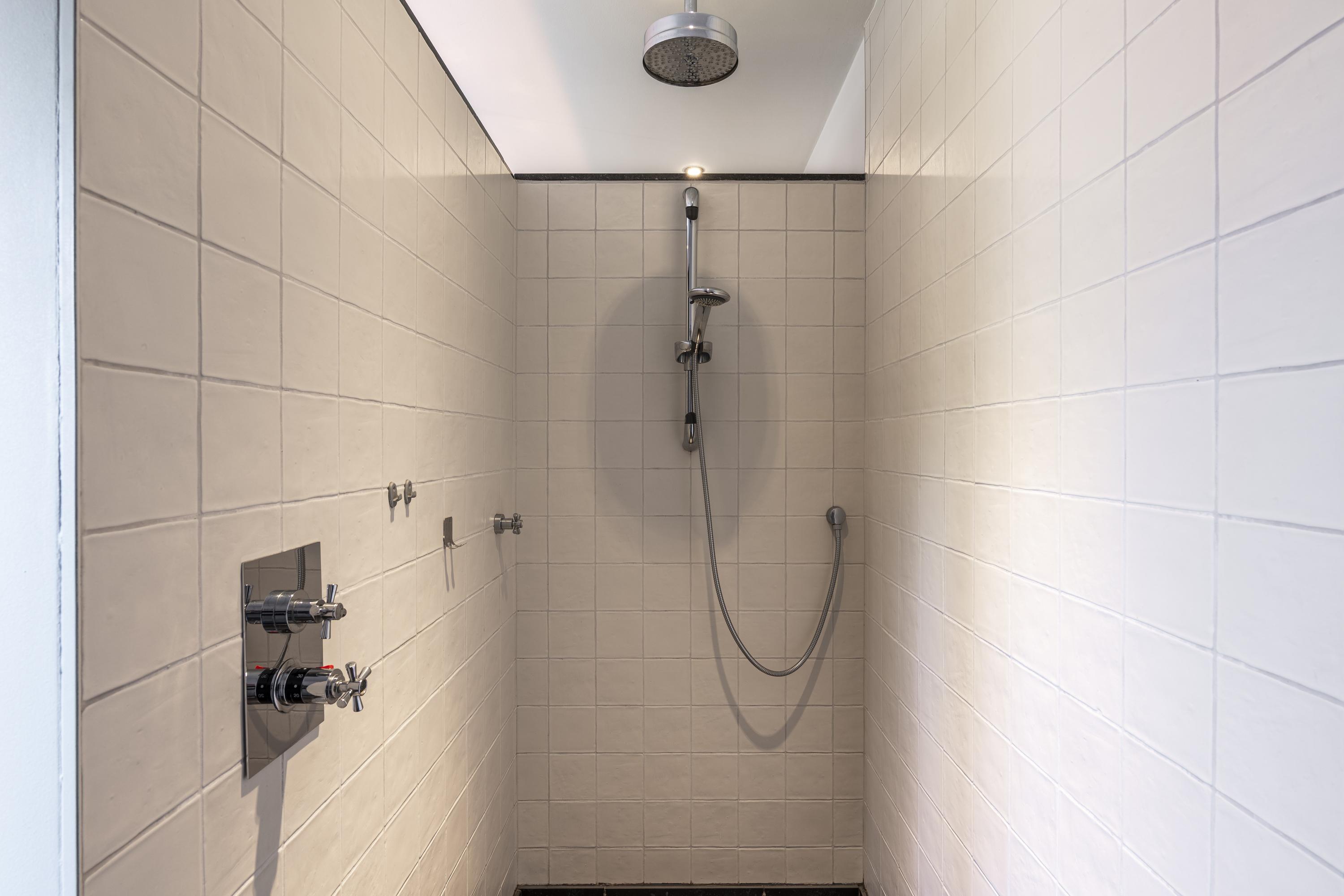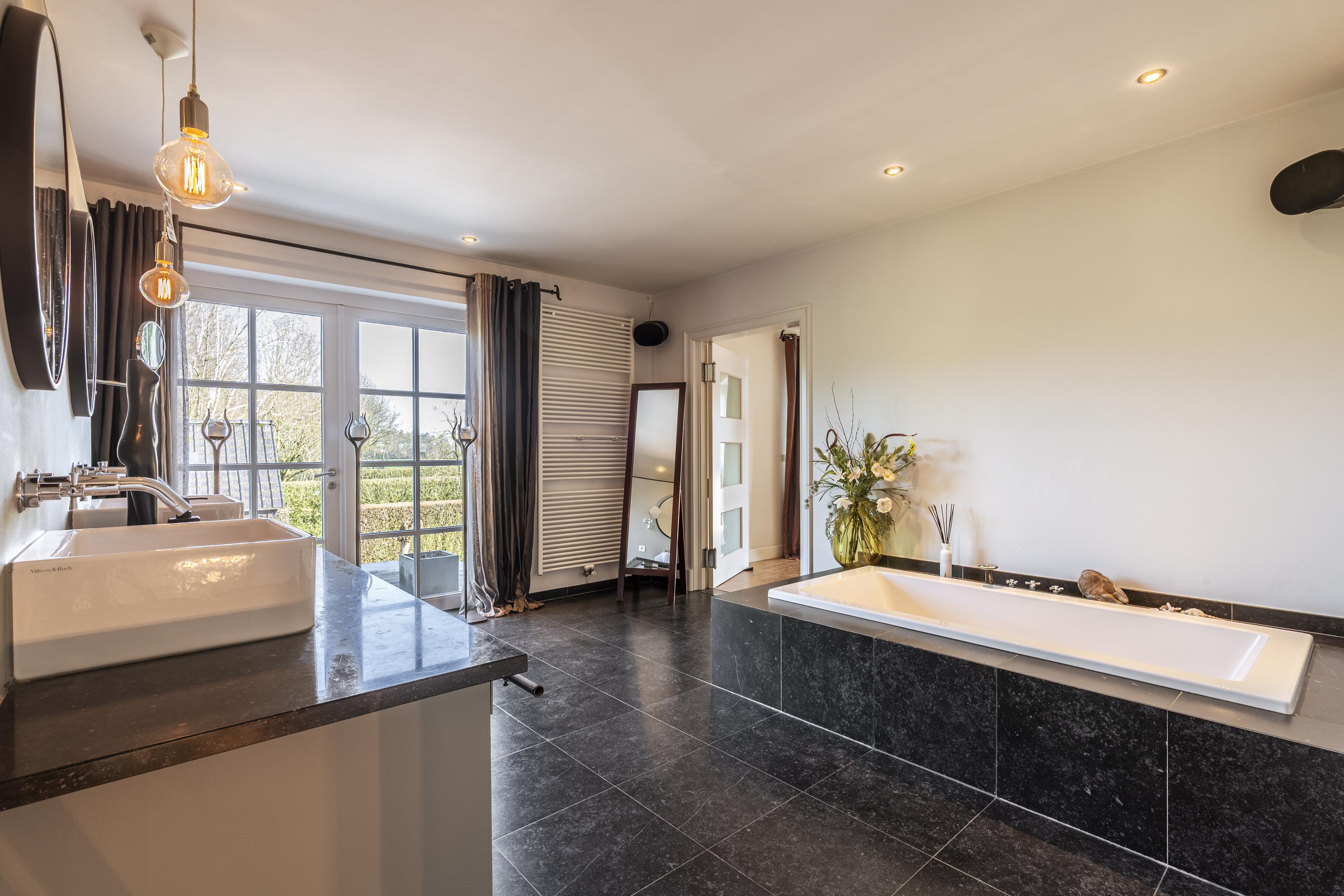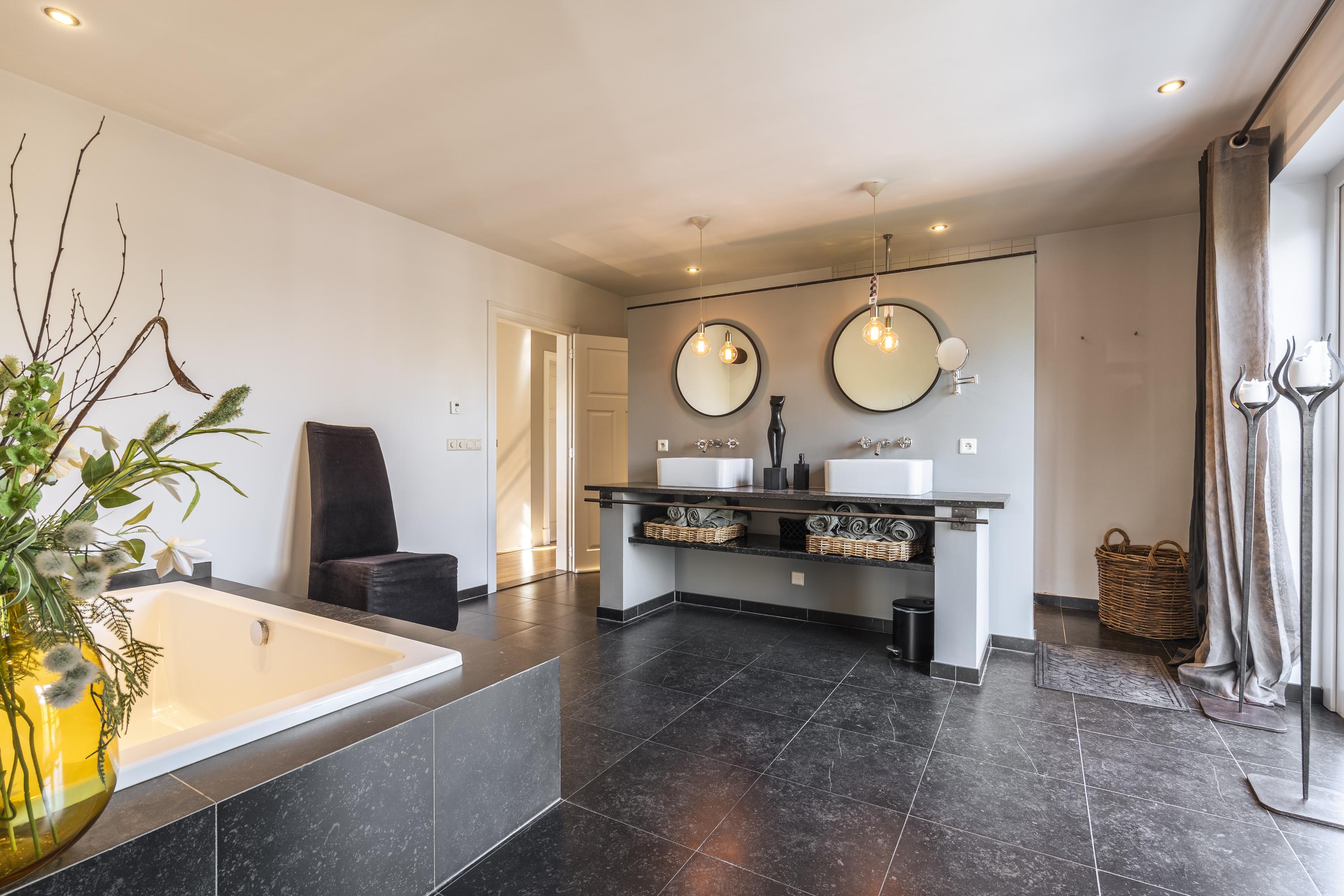 De luxe badkamer is compleet uitgerust met een dubbele wastafel met meubel, een ligbad en een comfortabele inloopdouche. Daarnaast is er op de overloop een separaat toilet aanwezig. Via een vaste trap bereikt u de tweede verdieping.