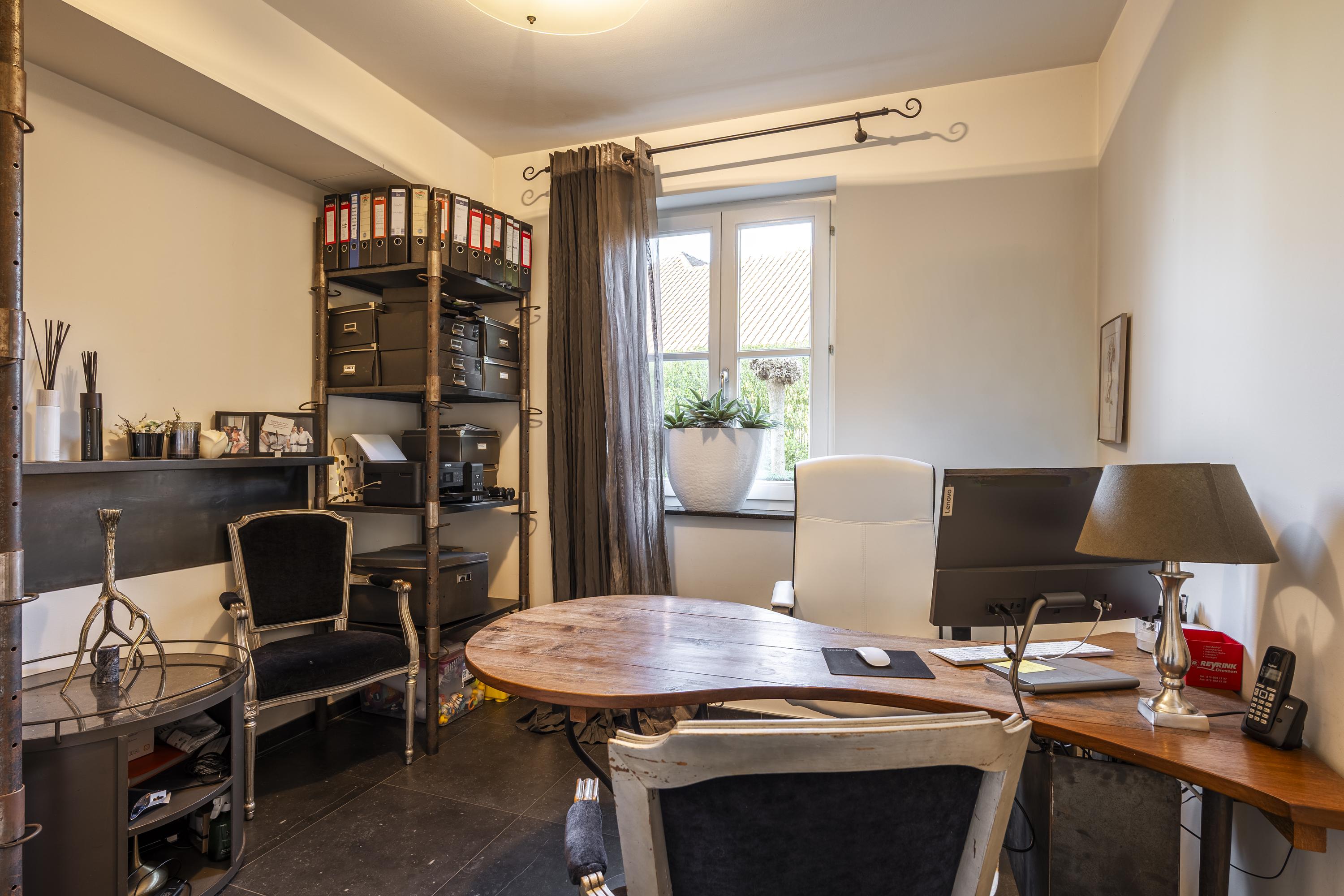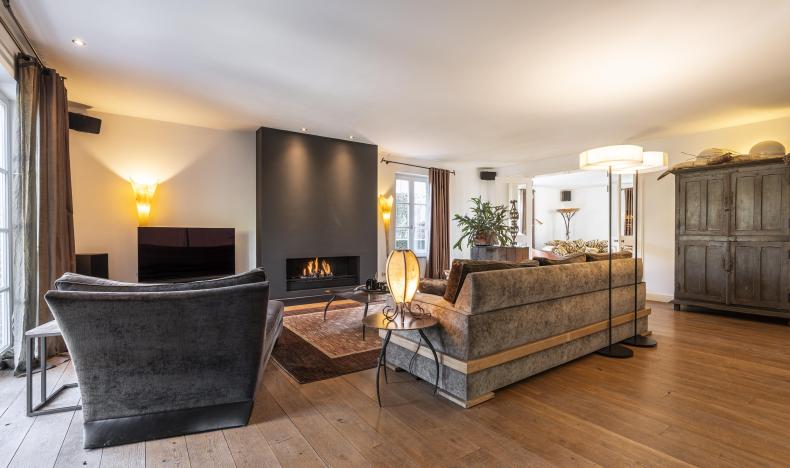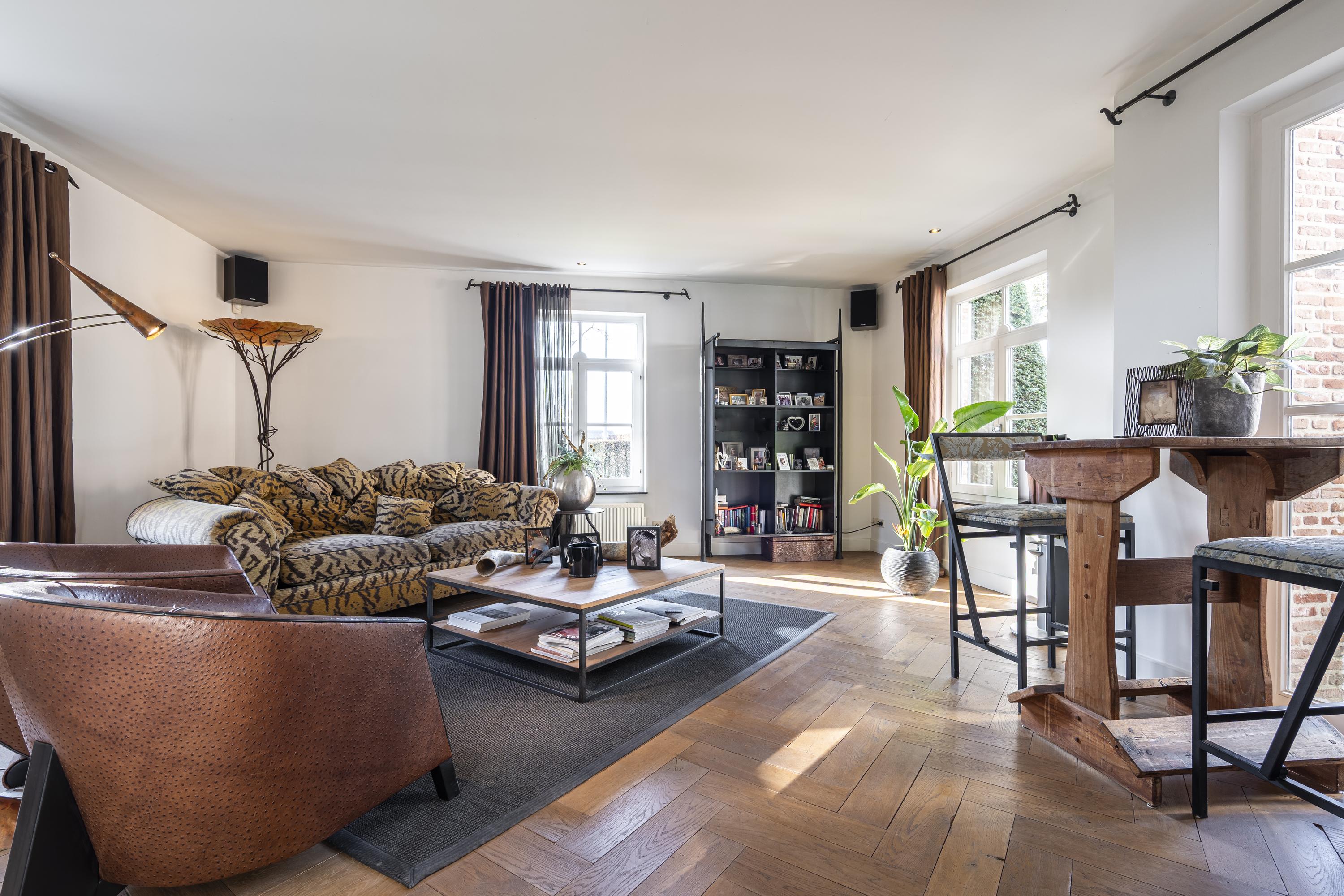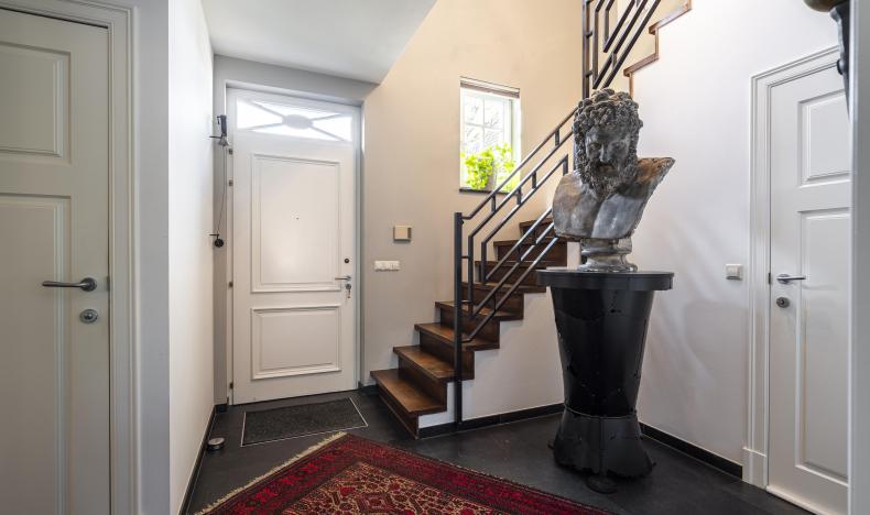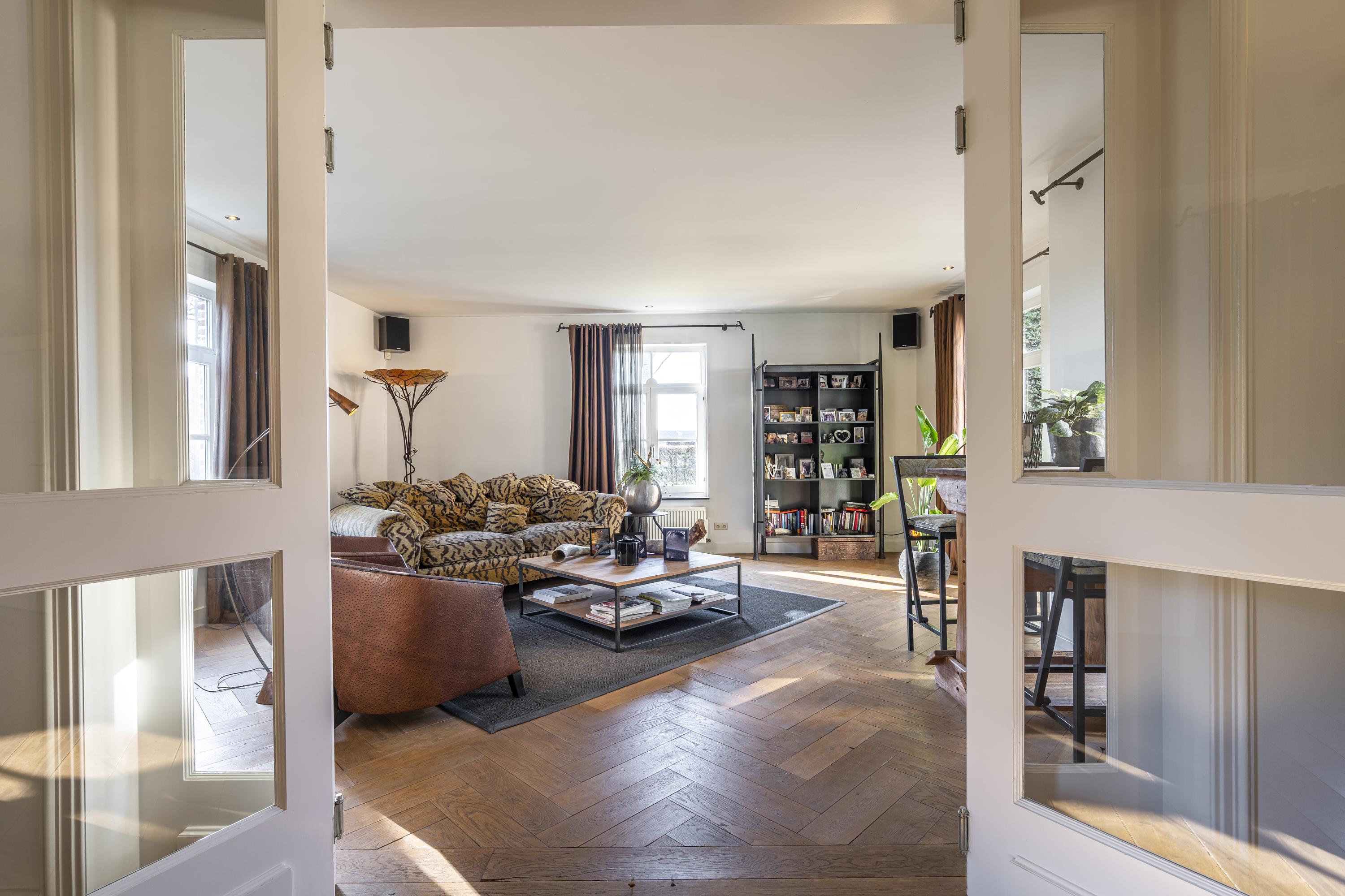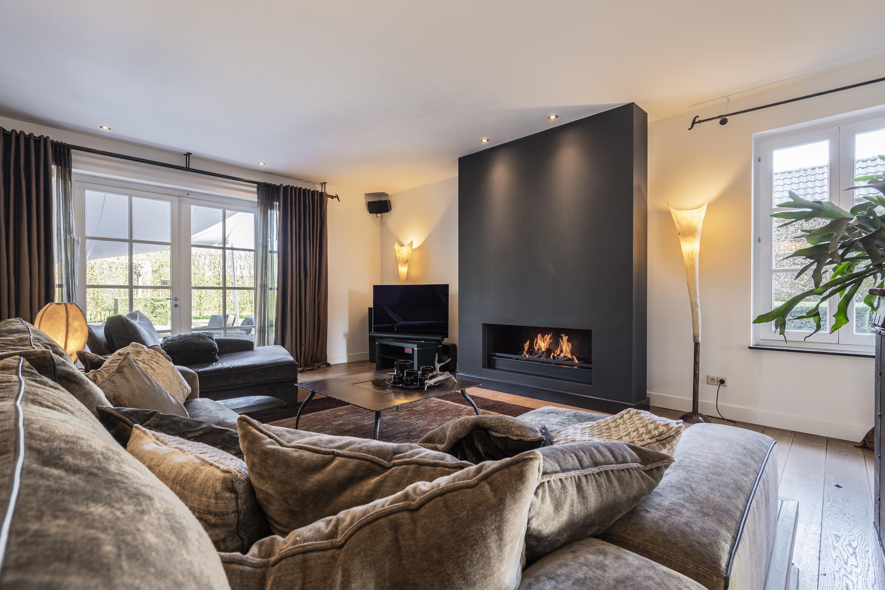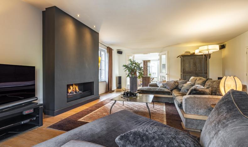 Via de imposante inkomhal met gastentoilet betreedt u de woning. Hier ervaart u direct de ruimte en het hoogwaardige afwerkingsniveau. De sfeervolle woonkamer met gashaard vormt het warme hart van de woning en biedt een prachtig zicht op de tuin. Aansluitend bevindt zich een afsluitbare tv-kamer of bureau – ideaal voor thuiswerken of ontspanning.