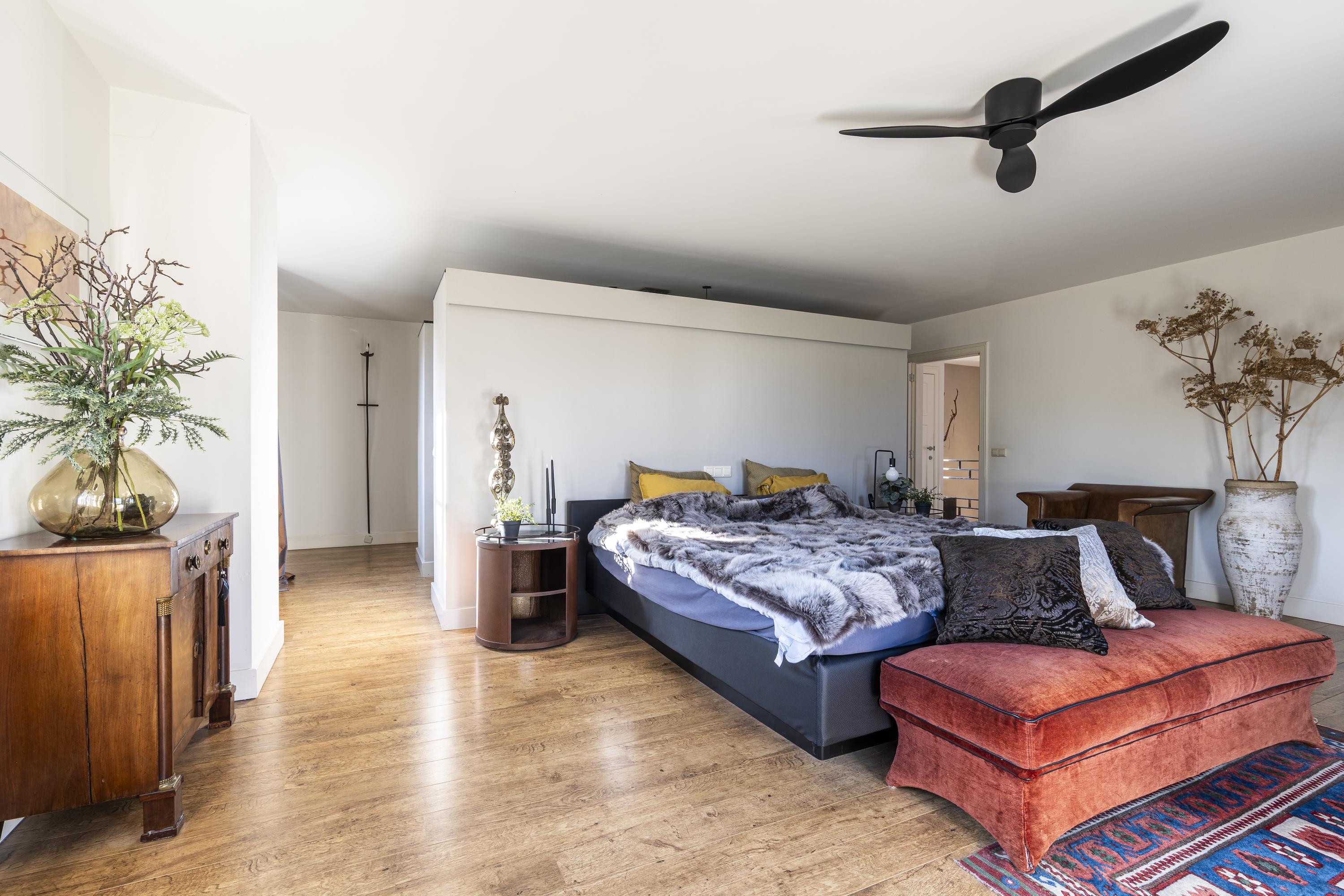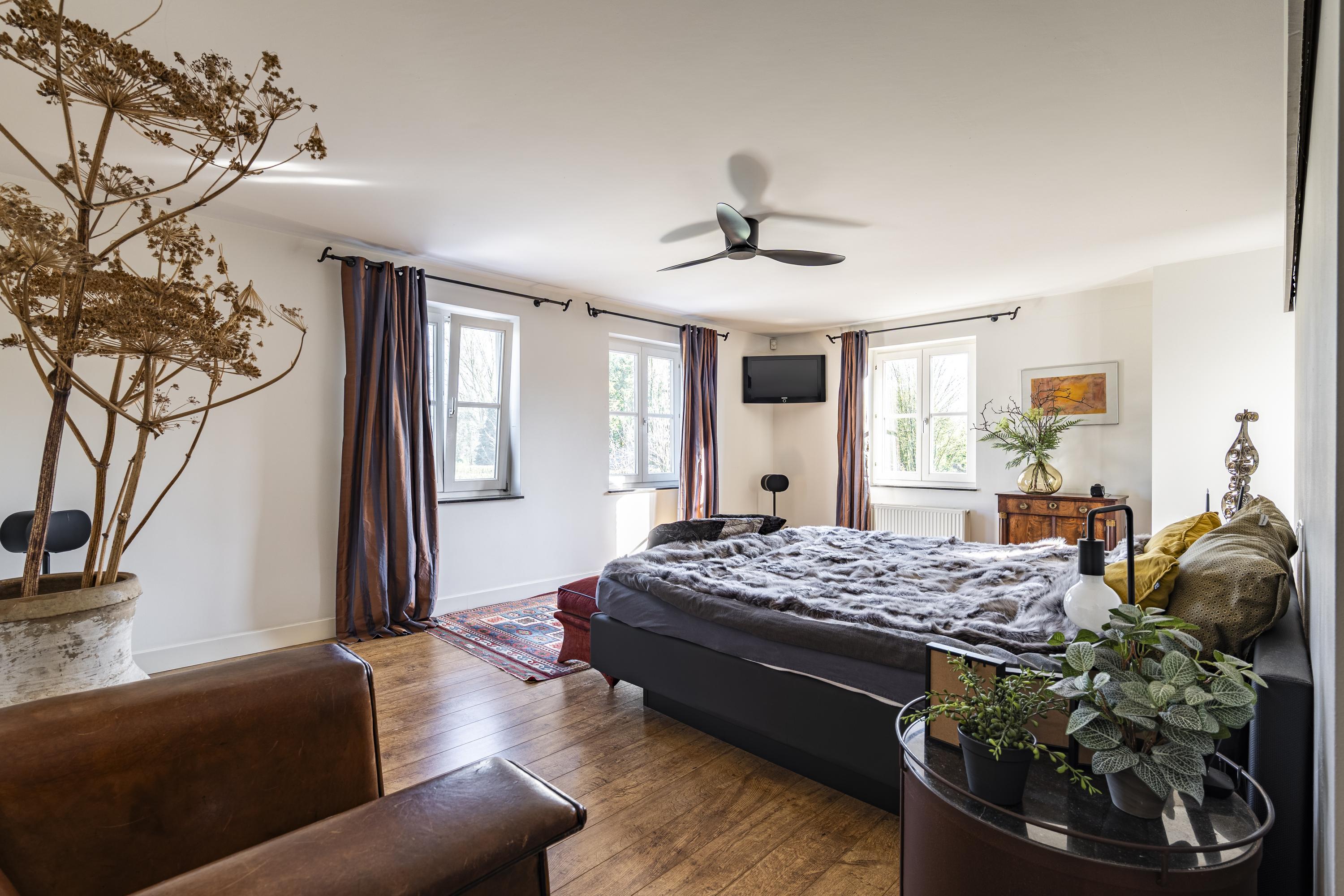 Op de eerste verdieping bevinden zich drie ruime slaapkamers. De indrukwekkende masterbedroom (ca. 45 m²) beschikt over een eigen inloopkast en aangrenzende dressing – een ware privé suite.