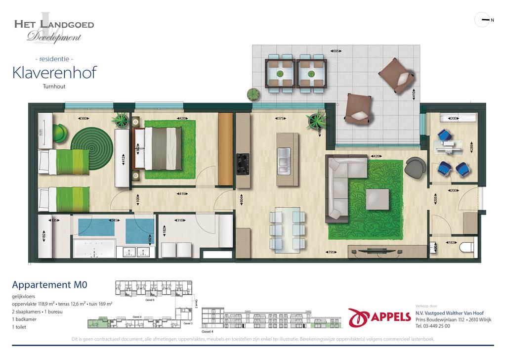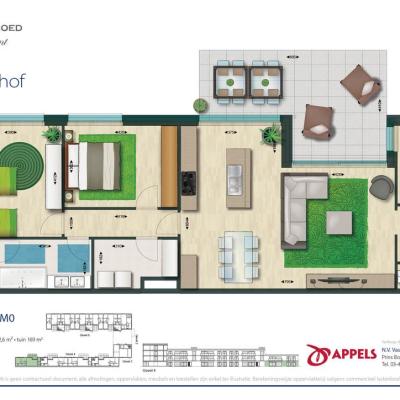 Ieder appartement wordt met zorg afgewerkt en bestaat uit een inkomhal, een living, een eethoek, een volledig ingerichte (open) keuken, een handige berging met aansluiting voor een wasmachine, een badkamer voorzien van douche en/of bad, badkamermeubel, (afzonderlijk) toilet en 1 tot 3 slaapkamers. Ieder appartement heeft een gezellig terras of tuintje. Kies hier uw lievelingsstekje!