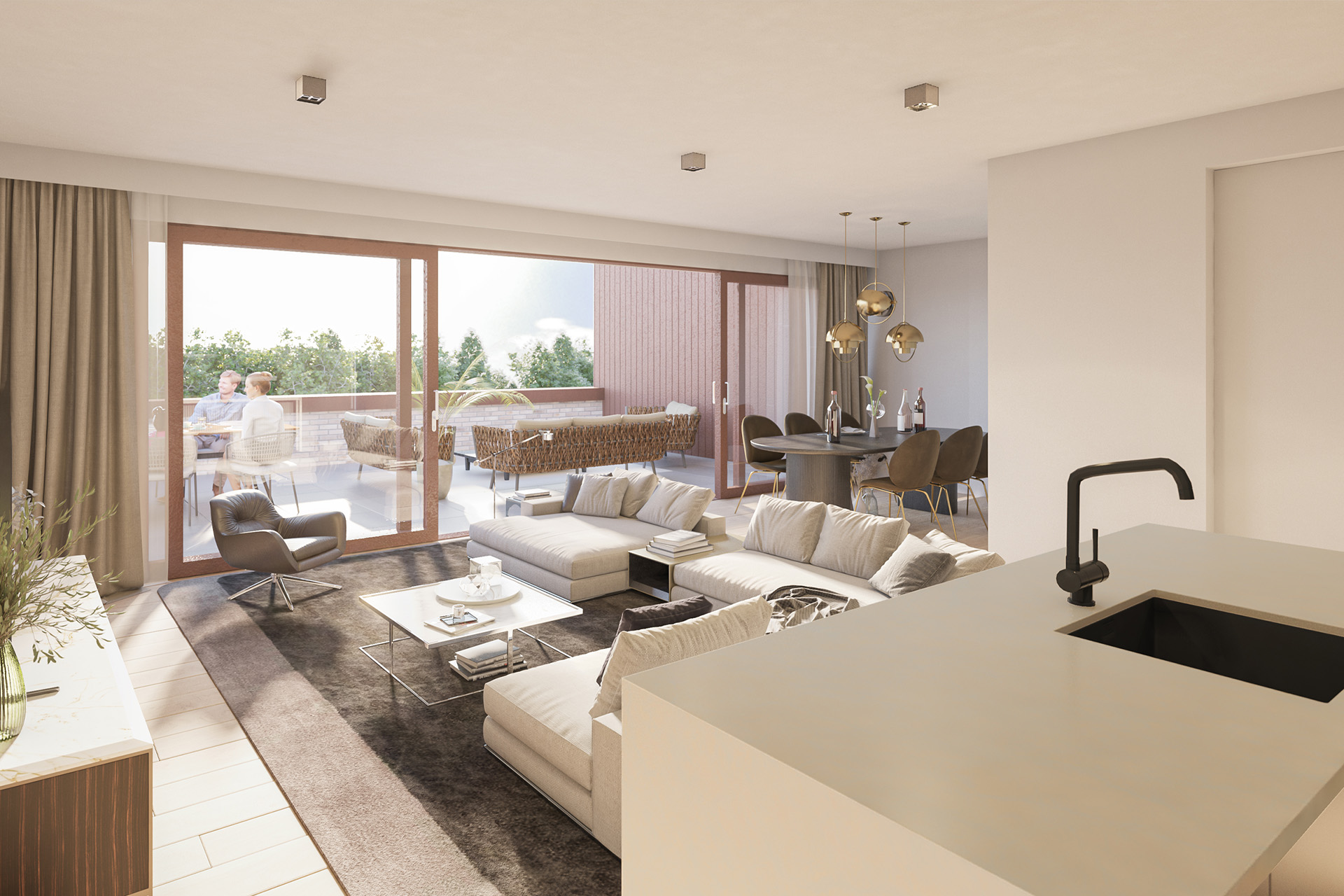 Onze onderaannemer Verlo Keukens tekende alvast een keuken voor je uit, deze is trouwens inbegrepen in de aankoop van het appartement of woning. Alle toestellen, de afwerking en het kraanwerk kan je bekijken in een toonzaal van Verlo Keukens. Samen met de ontwerpers kan je nog aanpassingen doen, zodat jouw keuken helemaal aansluit op jouw specifieke wensen en gezinssituatie.