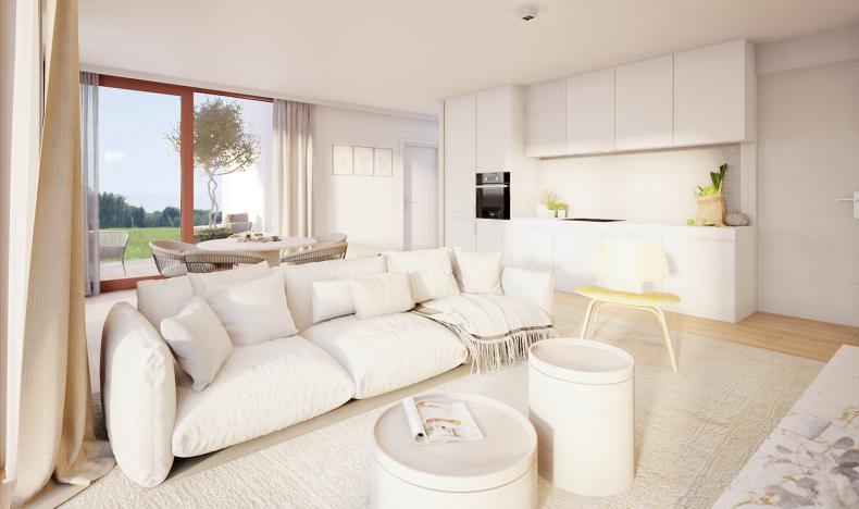 Deze luxe appartementen hebben alles in zich om comfortabel te wonen en zijn geschikt voor jong en oud. We komen binnen via de inkomhal met vestiare en het aparte toilet. Daarna vinden we de ruime leefruimte met volledig ingerichte open keuken met zicht/toegang tot uw terras.