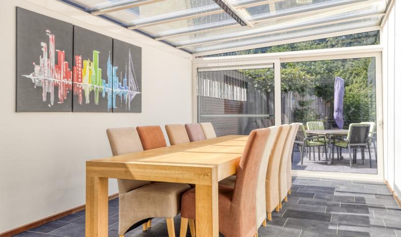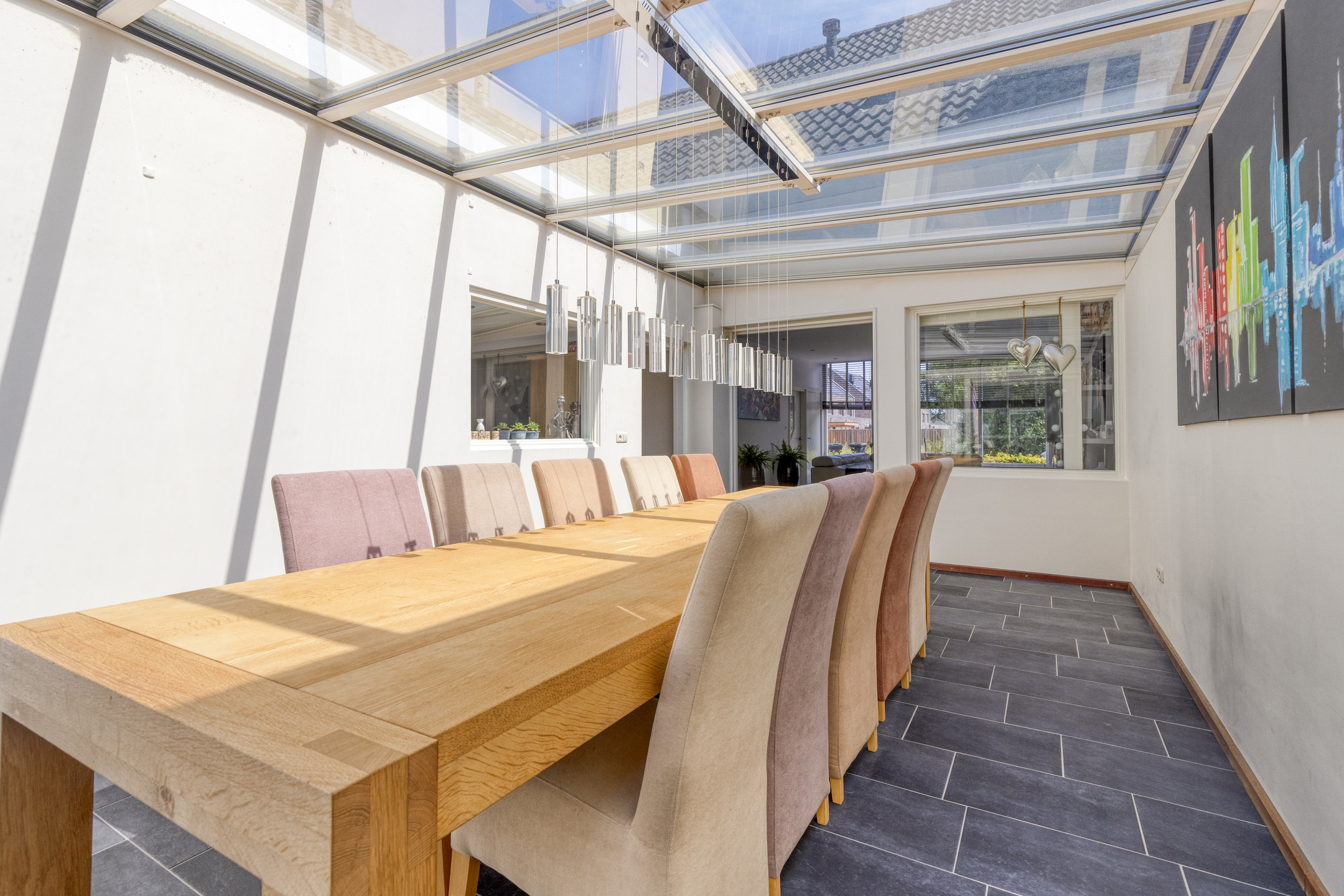 Woonkamer: Een sfeervolle woonkamer vormt het hart van de begane grond. Dankzij de open indeling en grote raampartijen is deze ruimte bijzonder licht en voelt het geheel ruimtelijk aan. De haard is een echte eyecatcher en zorgt voor een warme uitstraling. Aan de achterzijde van de woonkamer bevindt zich de eetkamer, welke af te sluiten is met een glazen schuifpui. Deze is gesitueerd in een serre met glazen dak en schuifdeur naar de tuin. Hier kunt u gemakkelijk een grote eettafel plaatsen en heerlijk tafelen met familie en vrienden.
