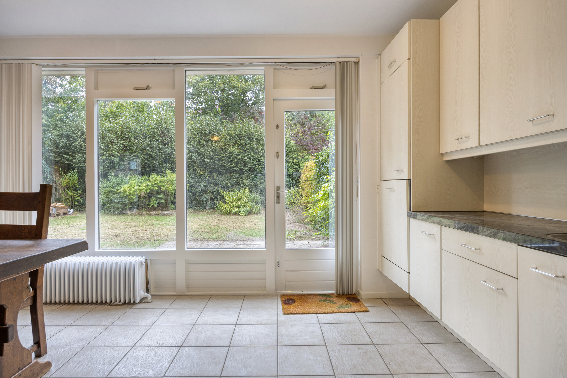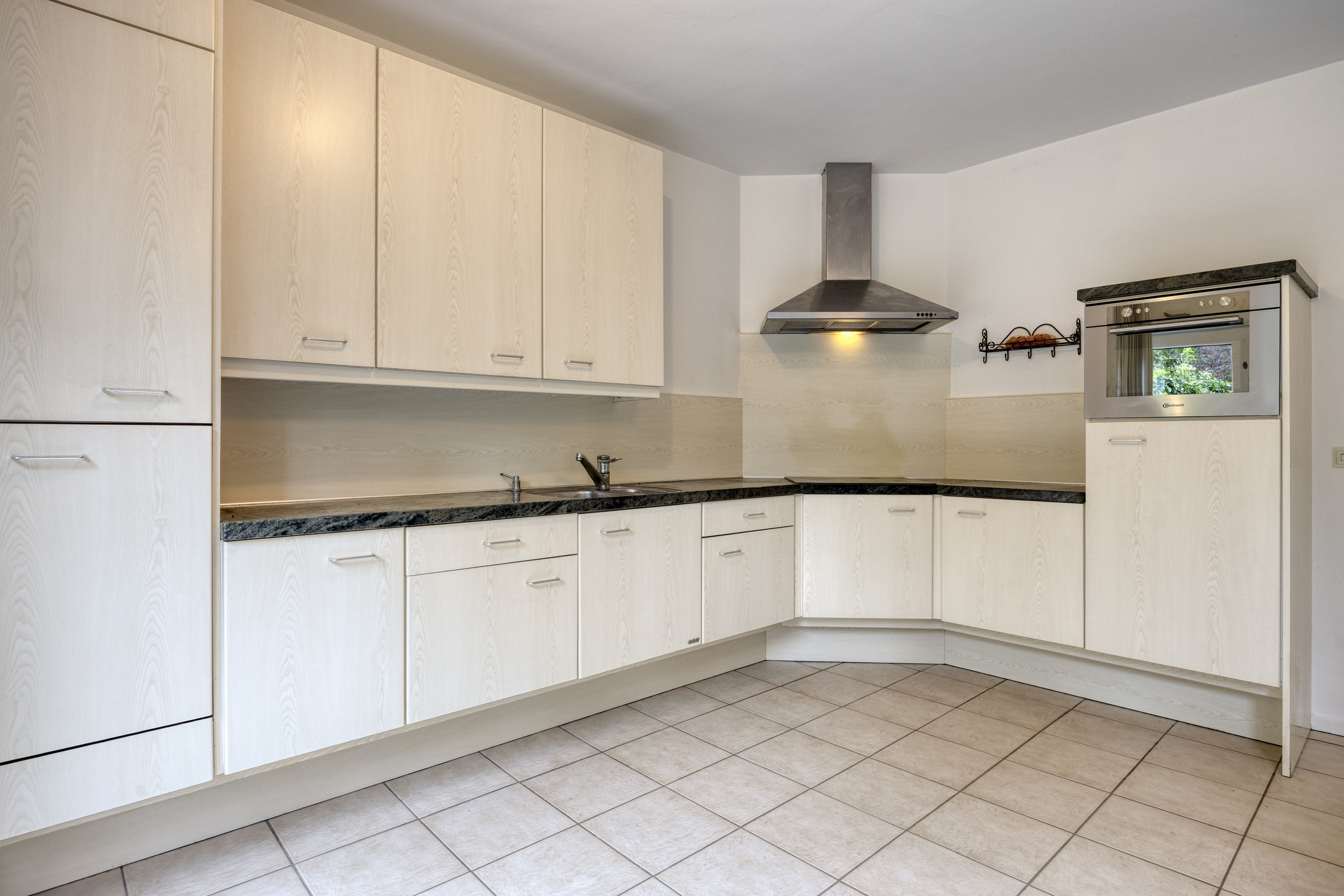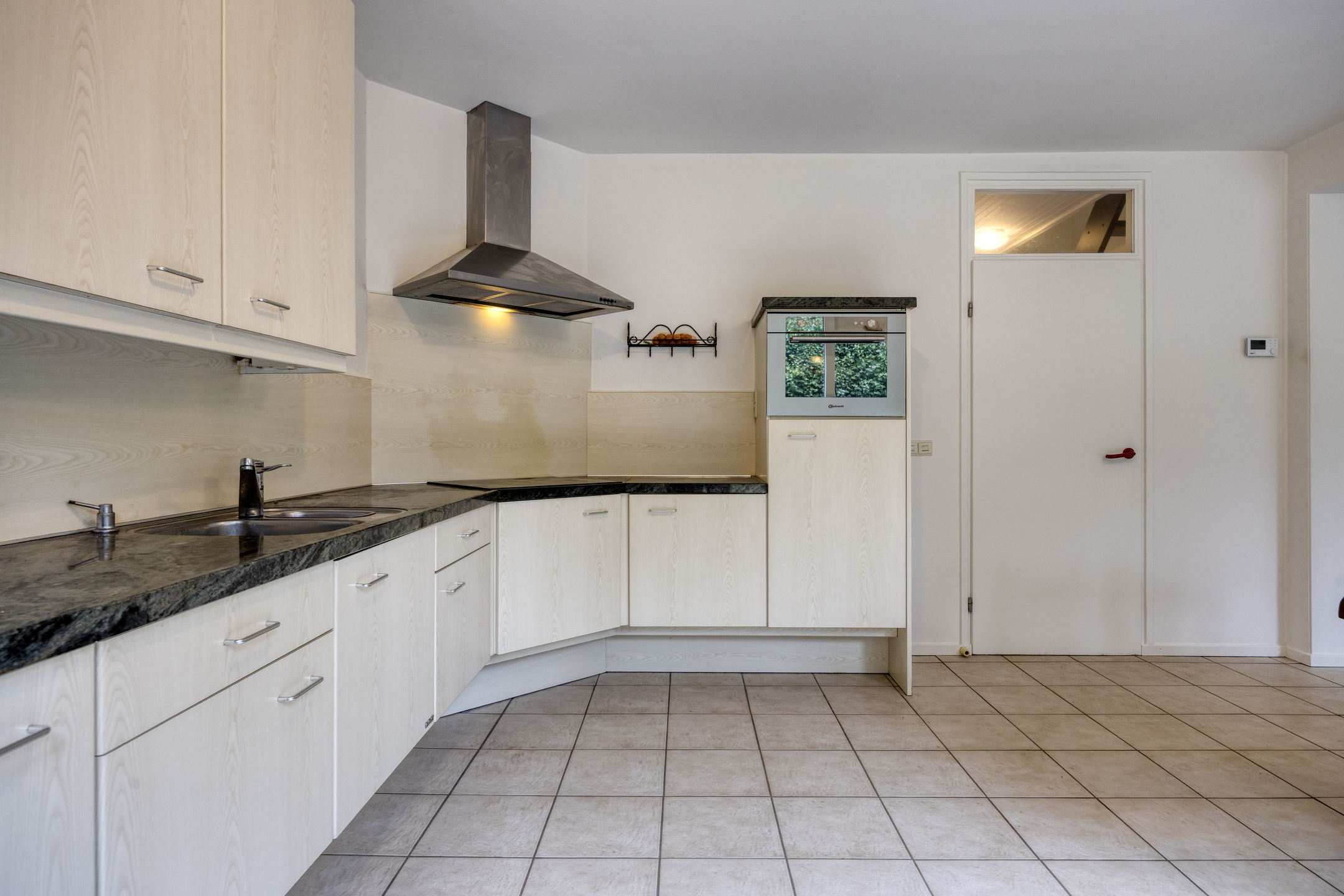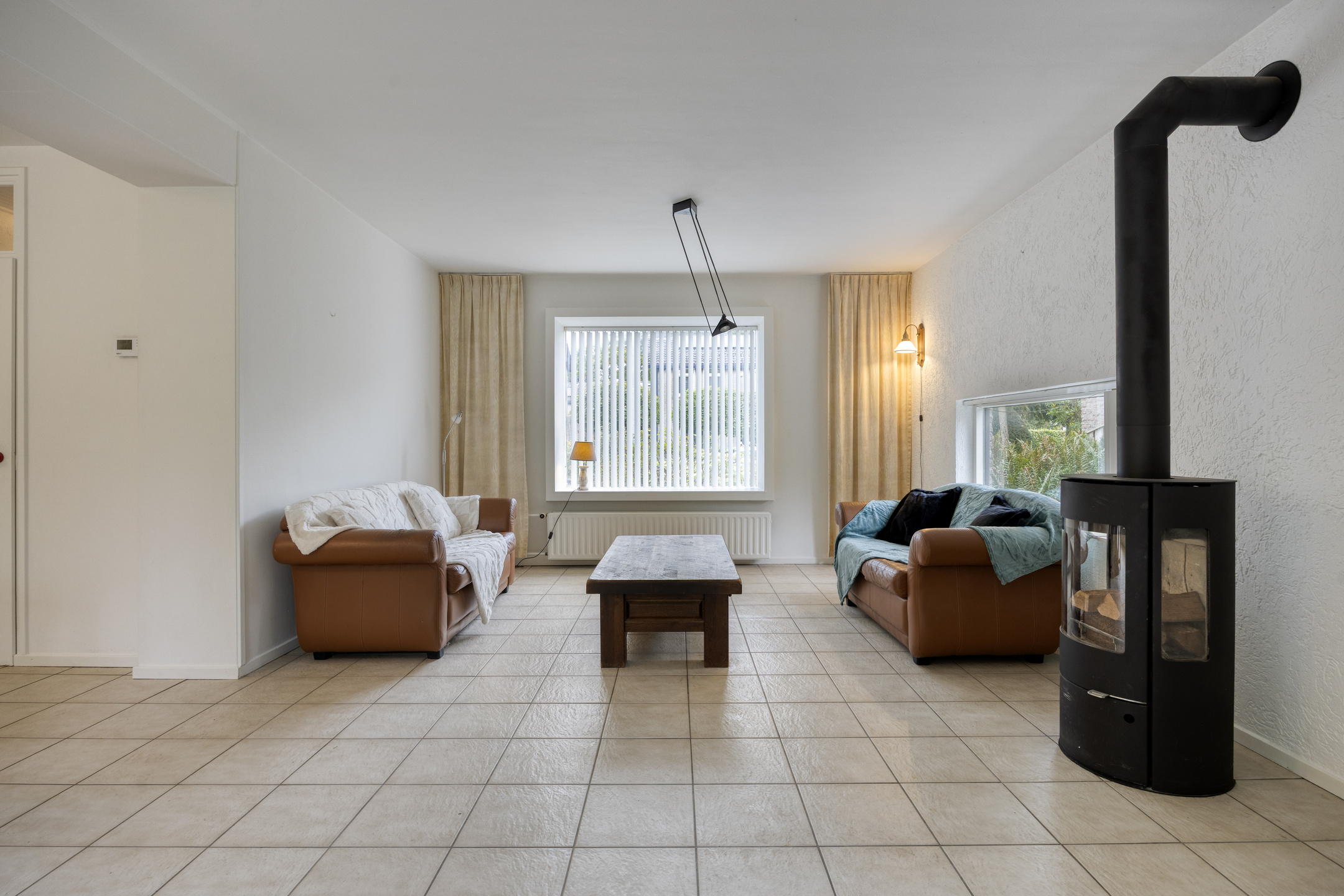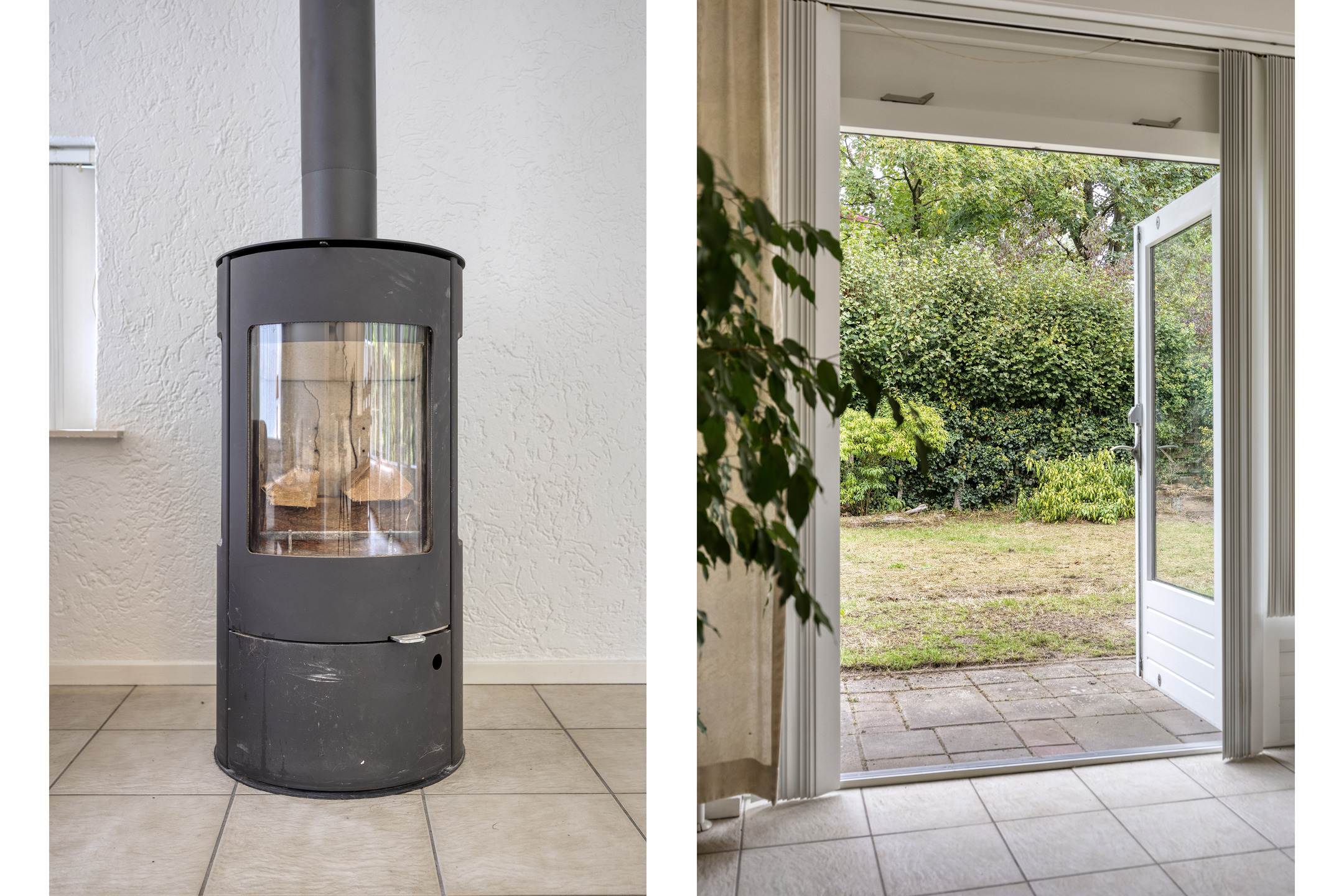 Begane grond U komt binnen via de overdekte entree in een lichte hal met toegang tot het toilet, de trapopgang, garage en de royale woonkamer. De woonkamer is verrassend breed en licht dankzij de grote raampartijen aan drie zijden en de openslaande deuren richting de achtertuin. De houtkachel vormt een sfeervol middelpunt op koude dagen, terwijl de neutrale tegelvloer zorgt voor een praktische en rustige basis. Aan de achterzijde bevindt zich genoeg ruimte voor een royale eethoek, waar u een mooi zicht heeft op het groen buiten. De leefkeuken is eveneens ruim van opzet, ingericht met een hoekmeubel en voorzien van diverse apparatuur, waaronder een combi-oven, inductiekookplaat, afzuigkap koelkast en voldoende kastruimte.