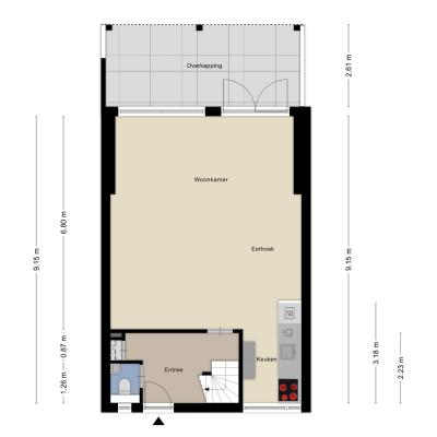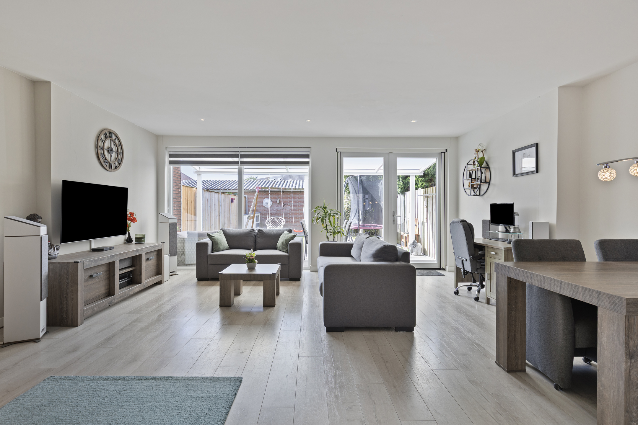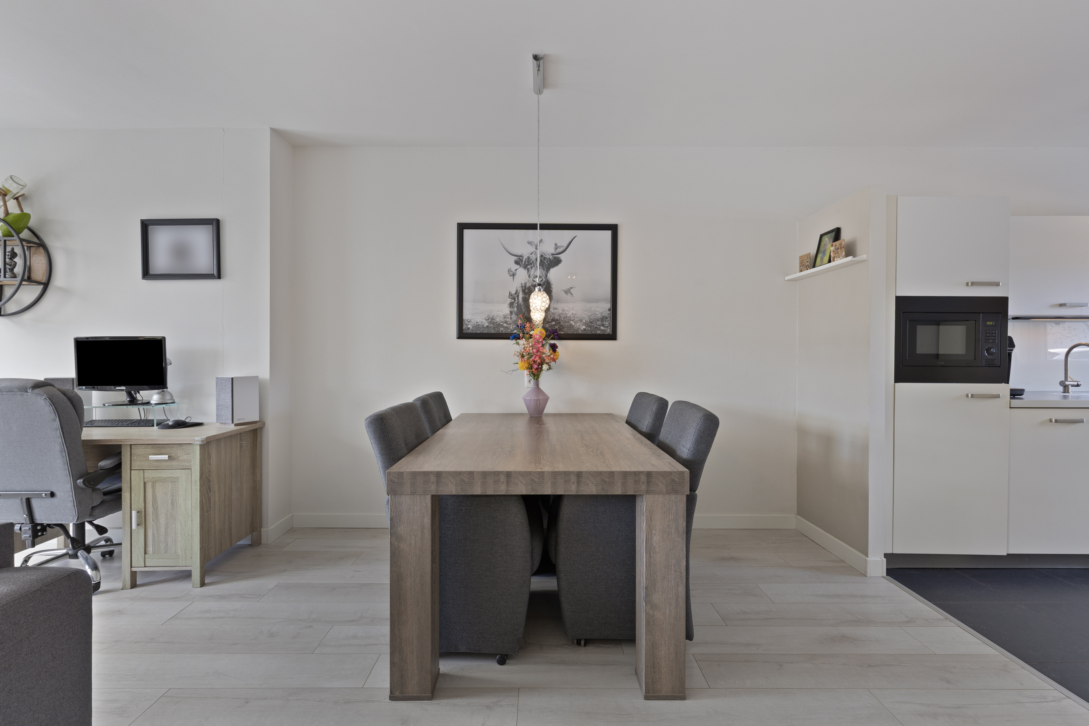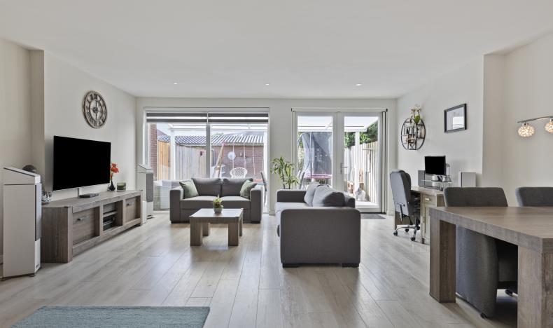 Woonkamer: Centraal in de woning vindt u de lichte en ruime woonkamer. Dankzij de grote raampartijen geniet u hier de hele dag door van natuurlijk licht. De indeling maakt het mogelijk een gezellige zithoek en een sfeervolle eethoek te creëren. Via de openslaande deuren staat de woonkamer in directe verbinding met de tuin, waardoor binnen en buiten moeiteloos in elkaar overlopen.