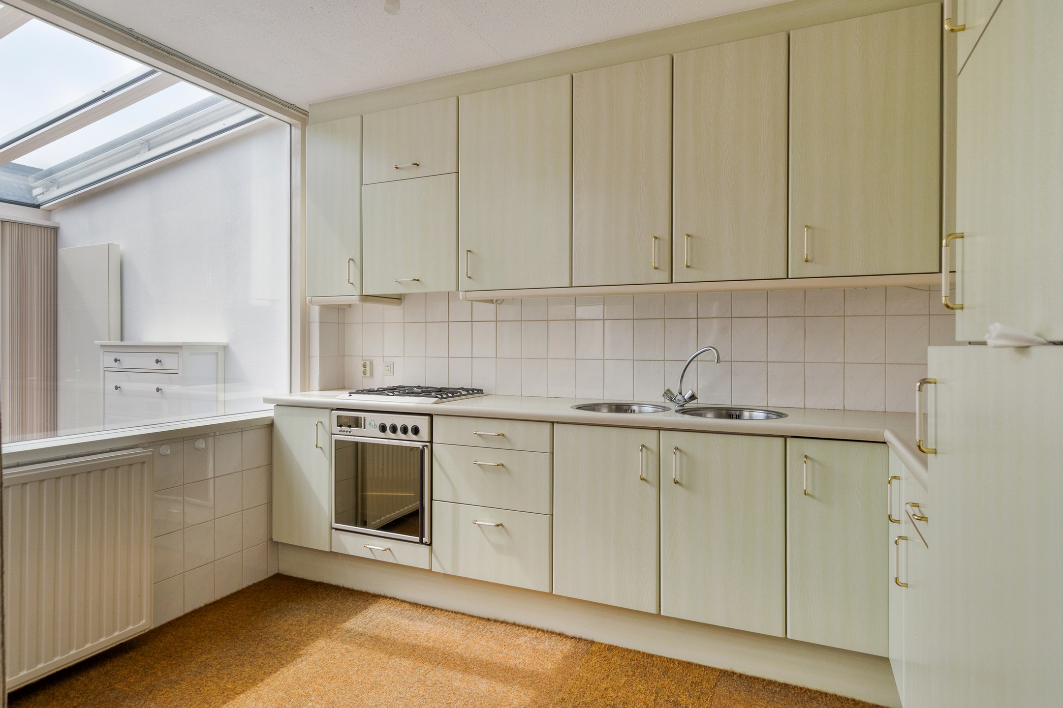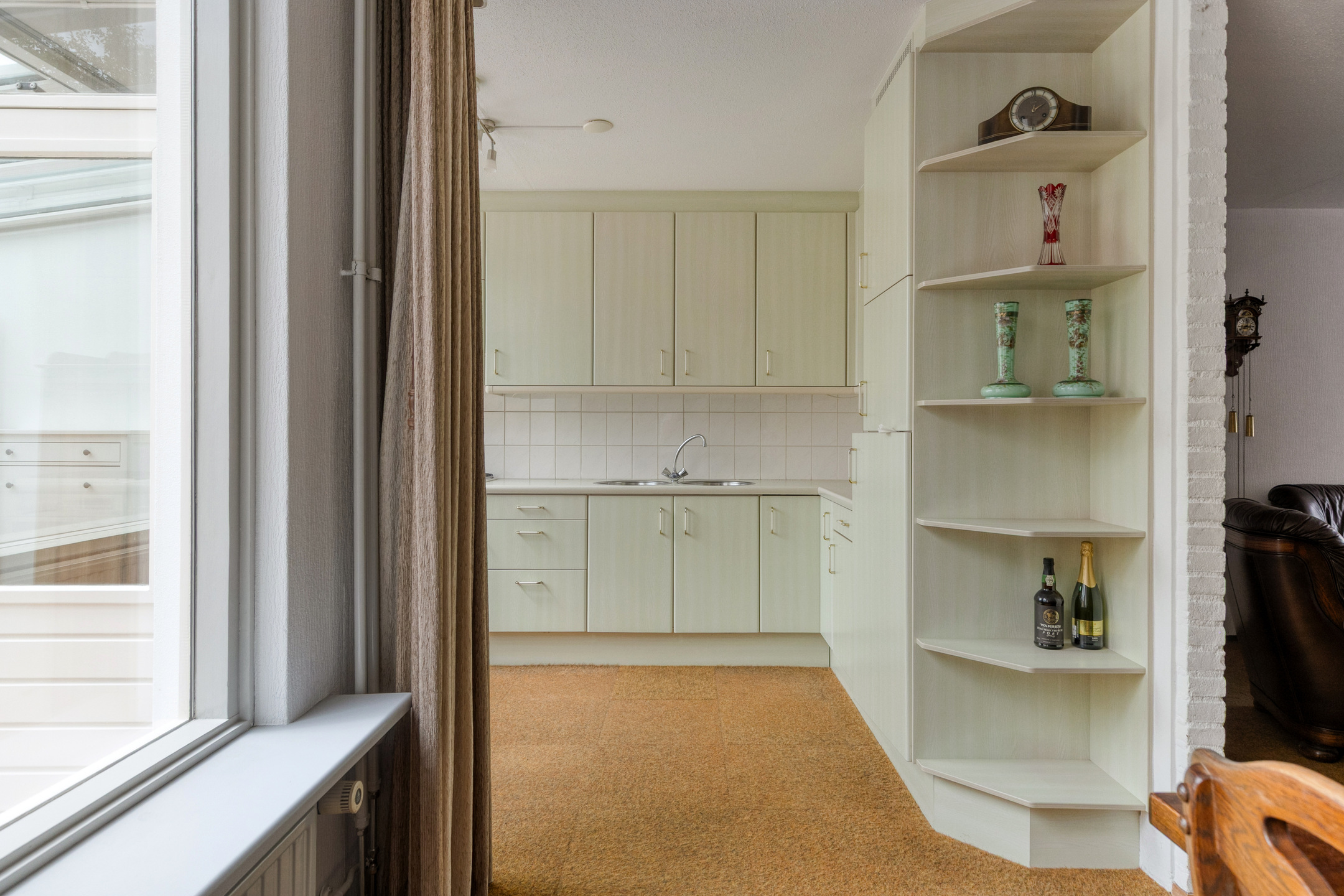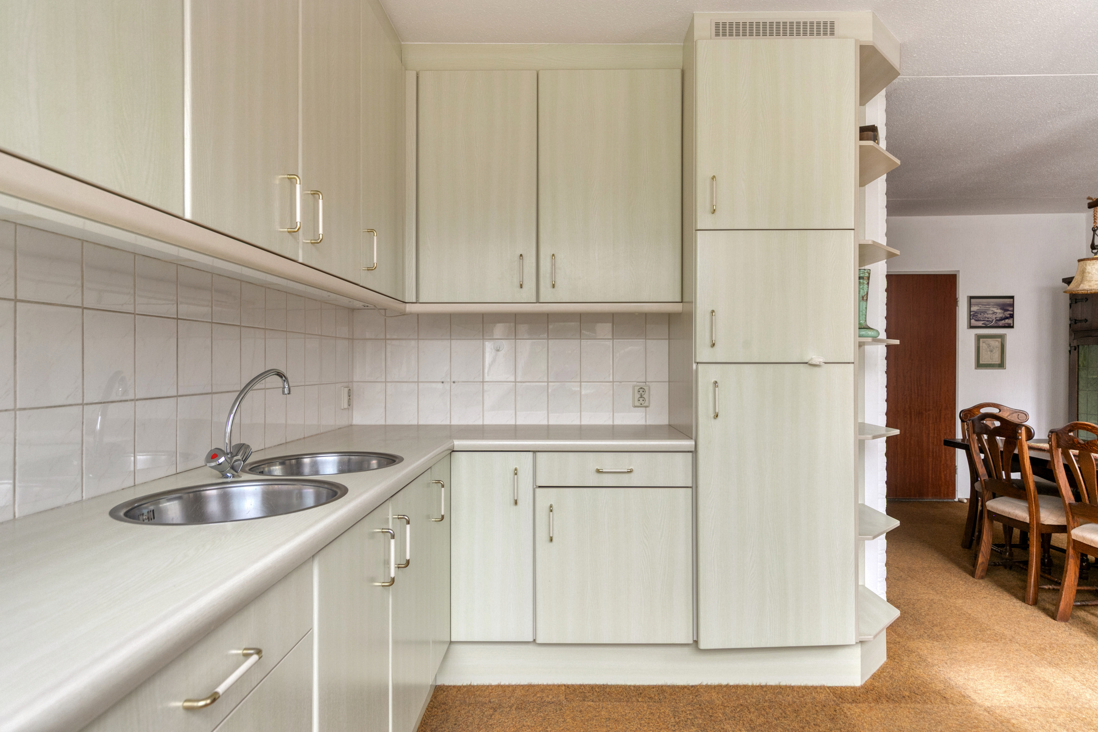 Keuken Aan de achterzijde van de woning bevindt zich een ruime keuken. Het L-vormige aanrechtblad is voorzien van inbouwapparatuur, waaronder een gasfornuis, oven, dubbele spoelbak met close-in boiler en koelkast. De keuken is functioneel, met veel werk- en opbergruimte, en vormt een goede basis voor een eventuele upgrade naar een moderne kookruimte.