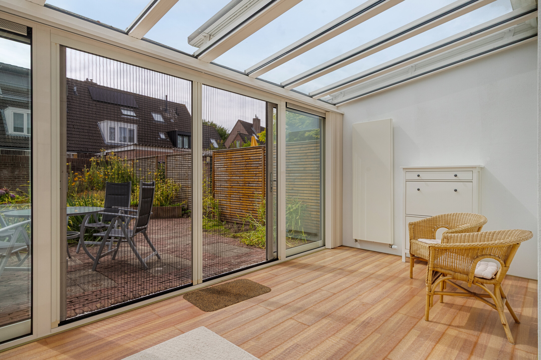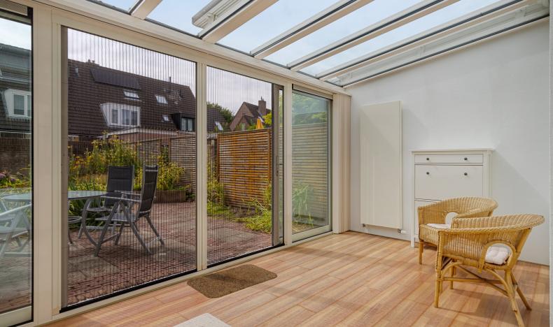 Serre Een lichte serre sluit naadloos aan op zowel de keuken als de woonkamer. Dankzij de ramen rondom geniet u hier het hele jaar door van een zee aan daglicht. Deze ruimte vormt een heerlijke plek om te lezen, te borrelen of simpelweg te genieten van het uitzicht op de tuin. De serre is om te bouwen naar een volledige uitbouw van de woonkamer annex keuken, daar het aan beider zijde eigen spouwmuren heeft. Daardoor kunnen dus geheel binnen het eigen perceel aanpassingen gemakkelijk worden gerealiseerd.