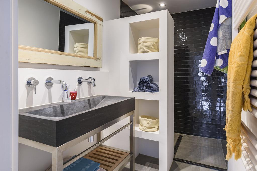 1e verdieping Via de overloop bereikt u de badkamer, toiletruimte en vier slaapkamers, waarvan één met een badkamer en suite. Deze slaapkamer is ruim, licht, voorzien van een houten vloer en bevindt zich aan de voorzijde van de woning. De badkamer en suite is volledig betegeld en voorzien van een ligbad, inloopdouche, wastafelmeubel met natuurstenen spoelbak en geïntegreerde kranen, inbouwspots, designradiator en raam. De drie overige slaapkamers zijn eveneens ruim en hebben een fijne lichtinval door de raampartijen. Twee van deze kamers zijn voorzien van een houten vloer en de derde van een laminaatvloer. De tweede badkamer is volledig betegeld en uitgerust met een inloopdouche, wastafelmeubel met natuurstenen spoelbak, geïntegreerde kranen, inbouwspots en designradiator.