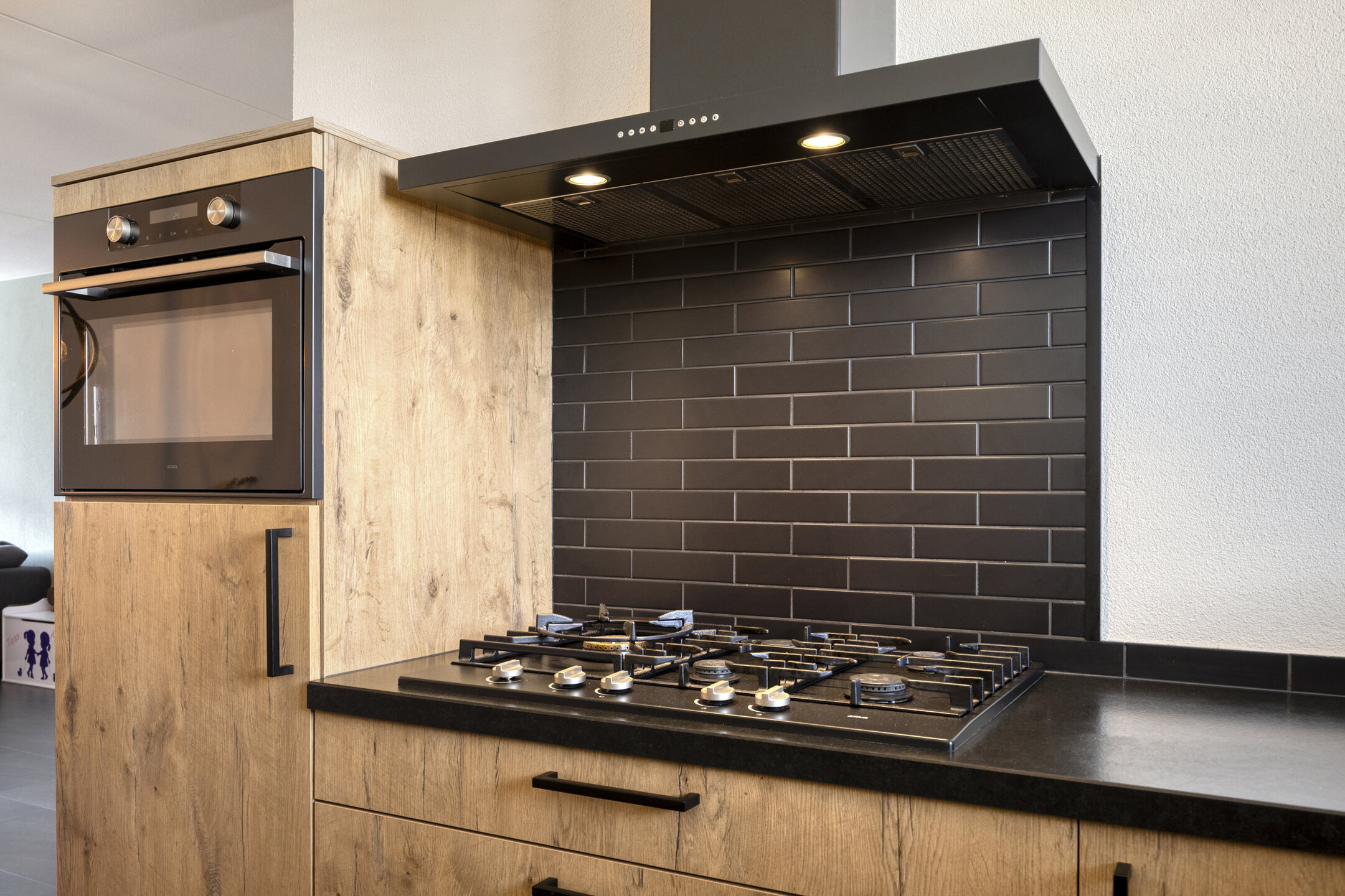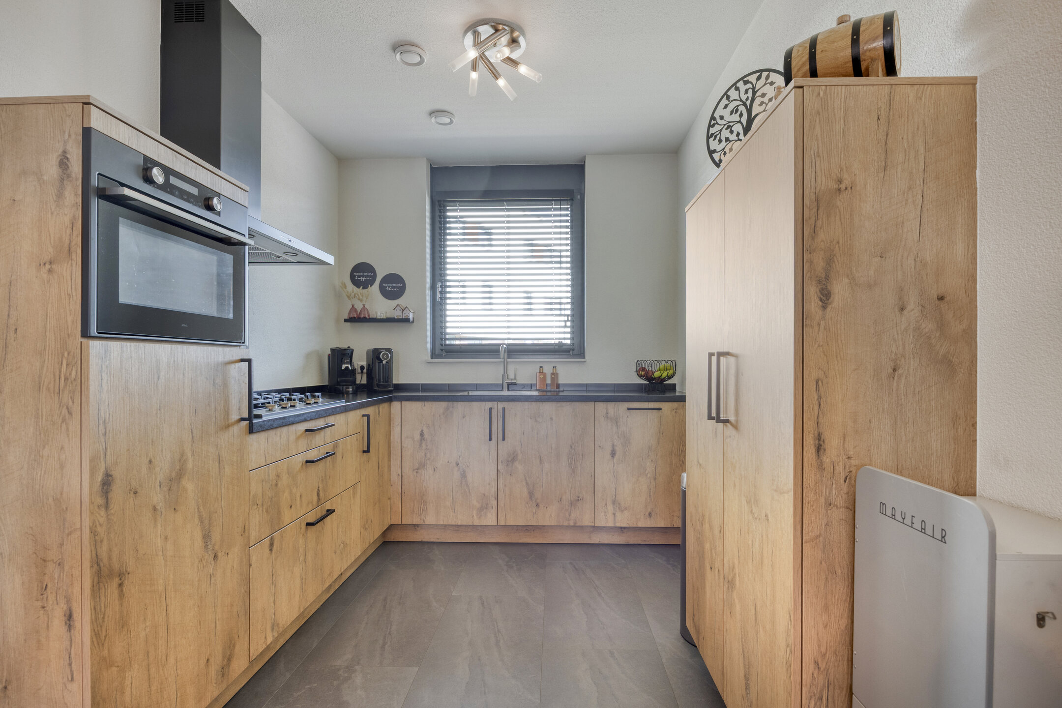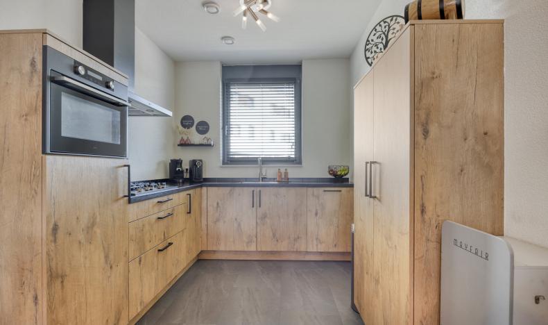 Keuken: De keuken in landelijke houtlook sluit naadloos aan bij de woonkamer. Het ruime L-vormige aanrechtblad biedt veel werkruimte en is voorzien van een gasfornuis, afzuigkap, vaatwasser en spoelbak. Verder beschikt de keuken over een ovencombinatie, koelkast en veel opbergmogelijkheden, waardoor koken hier een plezierige bezigheid wordt.