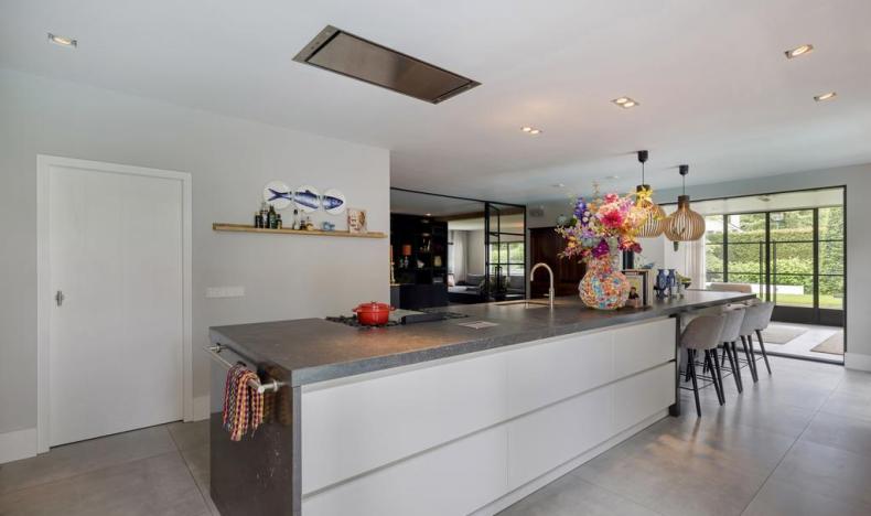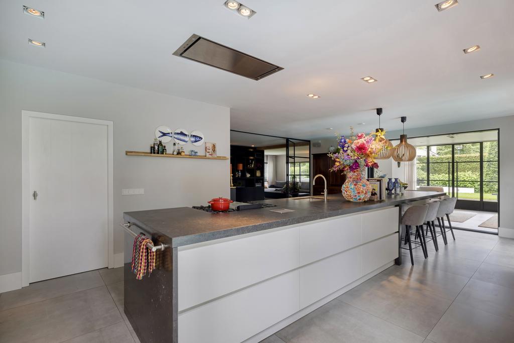 Direct na binnenkomst in de hal zorgt de natuurstenen vloer (met vloerverwarming) voor een moderne uitstraling, terwijl de metselwerk muur nog iets van het oorspronkelijke bouwjaar (1978) van het huis prijsgeeft. De strak gepleisterde trap met houten treden leidt naar de eerste verdieping en via een stalen deur wandelen we het woongedeelte binnen. Hoewel het verleidelijk is om meteen door de grote dubbele stalen deuren de woonkeuken te ontdekken, gaan we eerst rechts het kantoor binnen. Een comfortabele multifunctionele ruimte die bijvoorbeeld ook ideaal te gebruiken zou zijn als speelkamer voor kinderen. Voorbij de grote maatwerk kastenwand betreden we de woonkamer. Een plek waar ‘sfeer’ het sleutelwoord is. Een plek waar vanuit elke hoek zicht is op de omliggende tuin en waar de gashaard een extra sfeermaker is. De luxe maatwerk leefkeuken bestaat uit een groot kookeiland met een werkblad van Belgisch hardsteen. De grote wandkast, die voorzien is van kwaliteitsapparatuur, biedt tevens een zee aan bergruimte. Met een vaatwasser, een combi-oven, stoomoven, inbouw koffieapparaat, wijnklimaatkast, een Quooker en een breed 5-pits fornuis, is de keuken van alle kookgemakken voorzien. In de aangrenzende bijkeuken waar wasgelegenheid is gesitueerd, voorziet een ruime inbouwkast in extra bergruimte. Hier zijn ook de cv-ketel en de waterontharder ondergebracht. Er is genoeg ruimte overgelaten voor het plaatsen van een warmtepomp. De deur naar buiten brengt leidt ons enerzijds naar de berggarage aan de voorzijde van het huis en aan de andere zijde is de poort naar het tuingedeelte met zwembad, een extra bergruimte en de zwembadinstallatie.