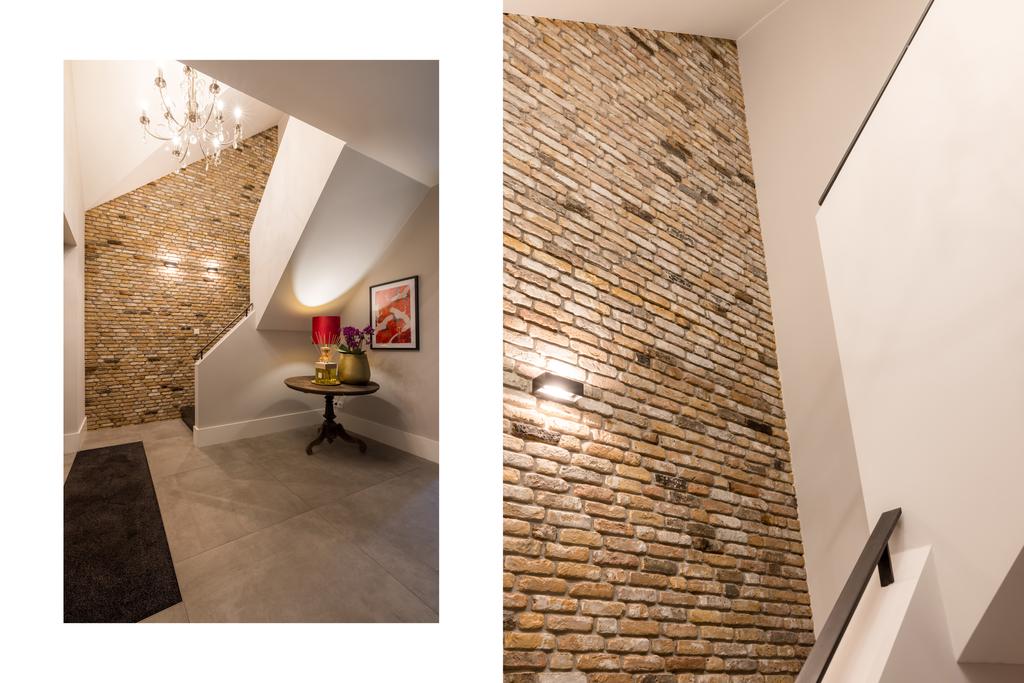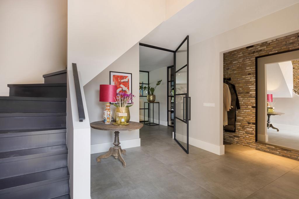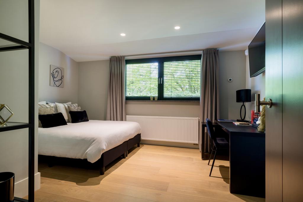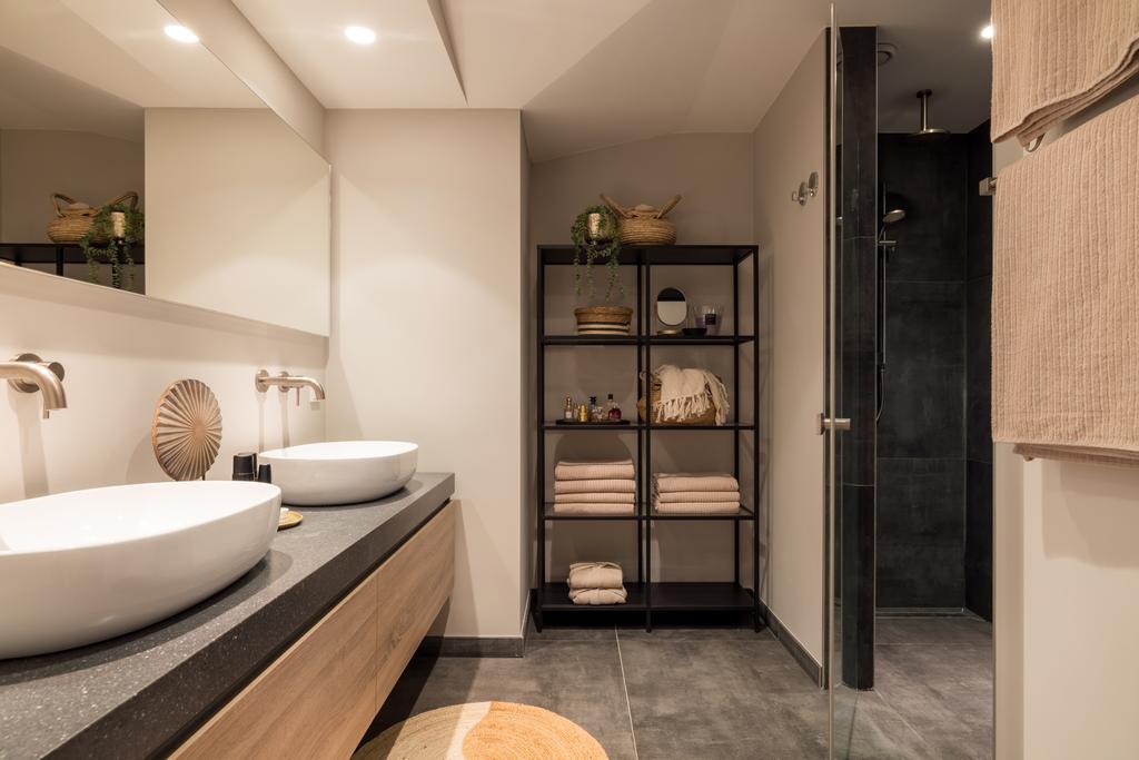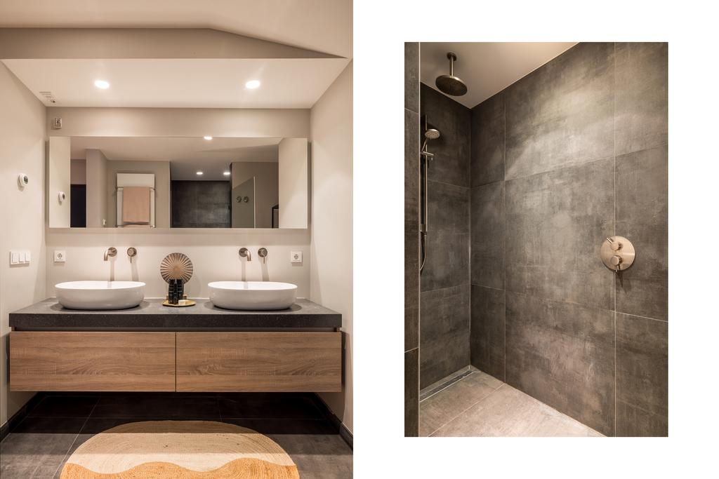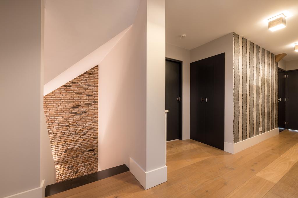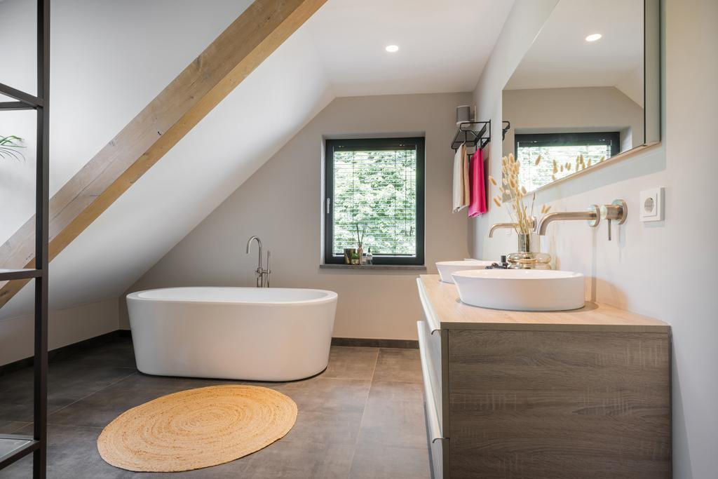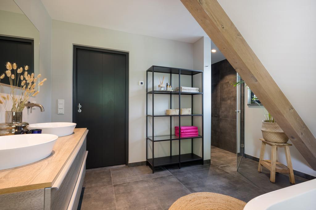 Terug in de hal nemen we de trap naar de eerste verdieping. Wat opvalt, is de verlichting die automatisch aan gaat. Zeer praktisch en luxe, maar ook veilig en energiebesparend. Doordat tijdens de zorgvuldige verbouwing maar liefst 21 meter dakkapel is geplaatst, zijn op deze verdieping enorm veel mooie lichte ruimtes gerealiseerd. Vijf slaapkamers, twee badkamers en een apart toilet om precies te zijn. De eerste (slaap)kamer bevindt zich meteen rechts van de trap. Het is weliswaar de kleinste van het stel, maar qua formaat uitstekend te gebruiken als bijvoorbeeld babykamer, kantoor/studeerkamer of strijkkamer. De drie daaropvolgende slaapkamers zijn met ieder 18 m² te omschrijven als ‘royaal’. Kenmerkend voor ‘de buitenste twee kamers’ is een extra raam en de zichtbare houten balken. Deze sfeermakers vinden we ook terug in de badkamer. Ze laten nog een glimp zien van hoe schuin het oorspronkelijke dak was. Na een drukke dag is het heerlijk tot rust komen in deze mooie badkamer. U kunt hier opfrissen in de ruime inloop-regendouche, of uitgebreid badderen in het vrijstaande bad. Ook in de masterbedroom zijn karakteristieke houten balken aanwezig. Kenmerkend voor dit slaapvertrek is de hoogte en de ruimtelijkheid, alsmede de fijne hoeveelheid daglicht dat aan beide zijden door de ramen naar binnen komt. De badkamer en suite heeft eveneens een inloop-regendouche en een fraai badmeubel met twee waskommen.