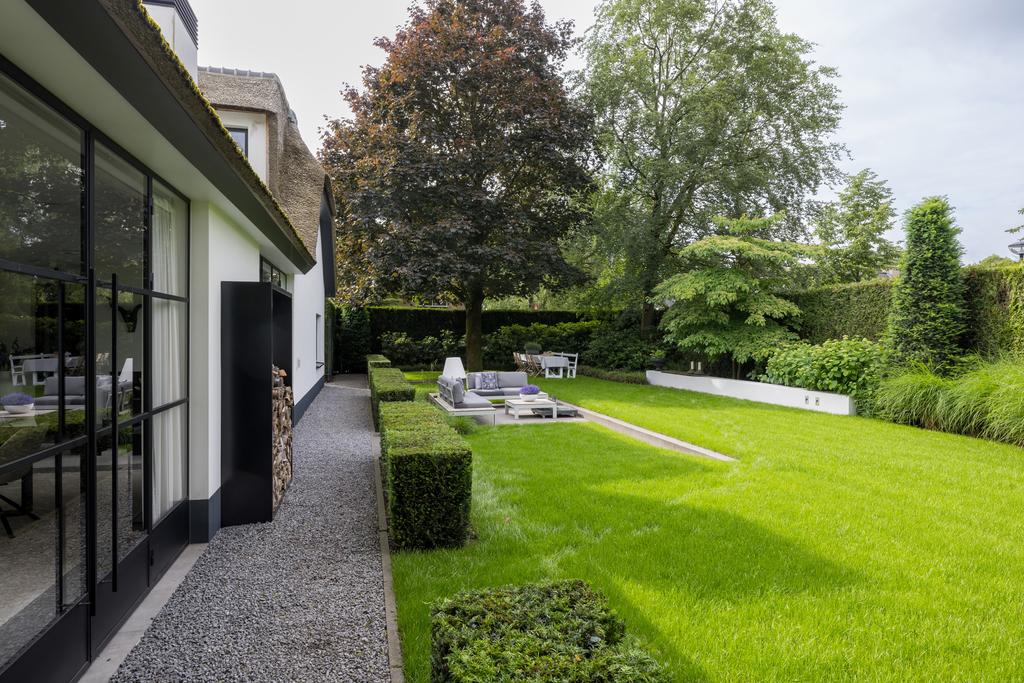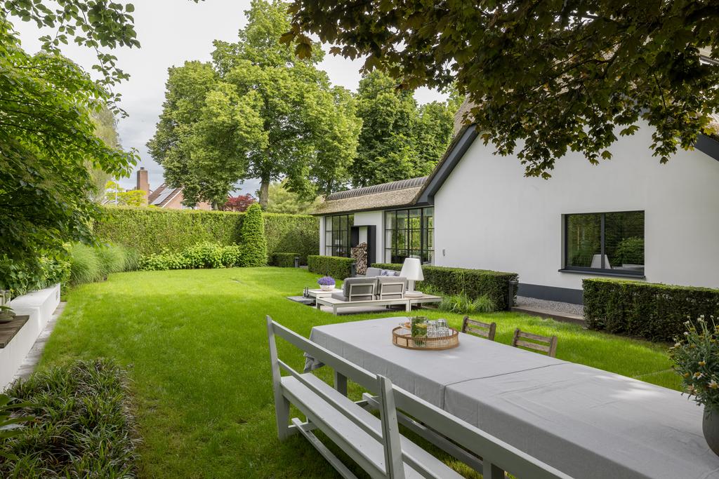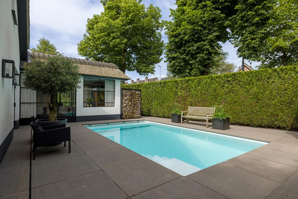 De tuin bestaat uit twee verbonden delen, met de fijne geïsoleerde tuinkamer als bruisend middelpunt. Dit is de plek waar de huidige bewoners van april tot oktober het liefst vertoeven. Zodra de eerste zonnestralen zich aandienen, is het hier namelijk al snel heel aangenaam. Door de aanwezigheid van een sfeervolle open haard, heaters en openslaande deuren is er een zeer prettige multifunctionele ruimte ontstaan. Een ruimte die ook vaak als verlengstuk van het huis fungeert wanneer familie en vrienden over de vloer zijn. Maar ook is het een ruimte waar bewoners zich in alle rust terug kunnen trekken. Wanneer de deuren naar de woonkeuken gesloten zijn, en de deuren naar de tuin wagenwijd open wanen zij zich hier in een andere wereld. Helemaal wanneer vogeltjes en eekhoorns ongestoord door de tuin struinen. Vaak gaat hier 's avonds de sfeervolle open haard aan. Soms ook de heaters, zodat het hier tot in de late uurtjes behaaglijk van het buitenzijn genieten is. En in alle privacy, want het perceel is omsloten door hoge hagen. Naast de tuinkamer ervaren de huidige bewoners ook het zwembad als pluspunt van de tuin. Thuiskomen op mooie dagen betekent hier namelijk snel zwemkleding aantrekken en direct een verfrissende duik nemen. Na het zwemmen is het heerlijk loungen langs de rand van het zwembad, terwijl rustige muziek uit de Sonos-boxen klinkt. Dankzij verwarmde dek met verwarmende functie hoeft