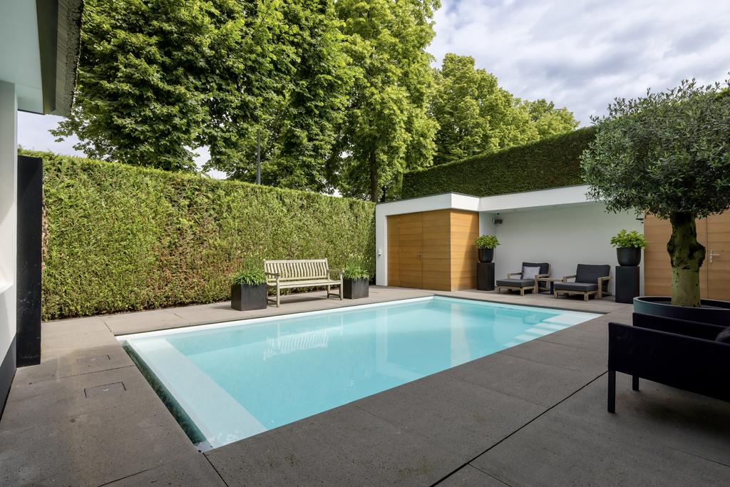 Privacyvolle tuin met zwembad en tuinkamer als kloppend hart