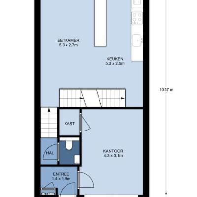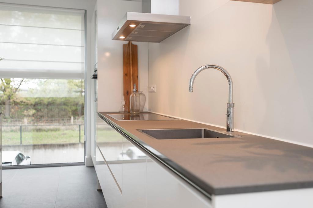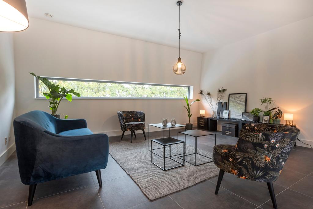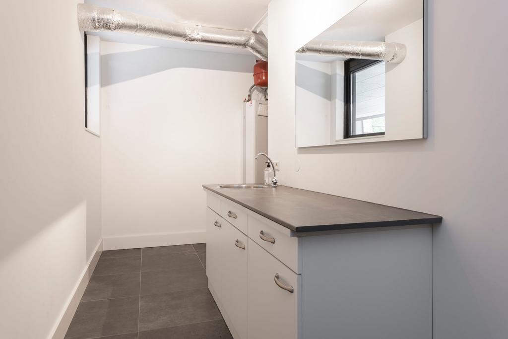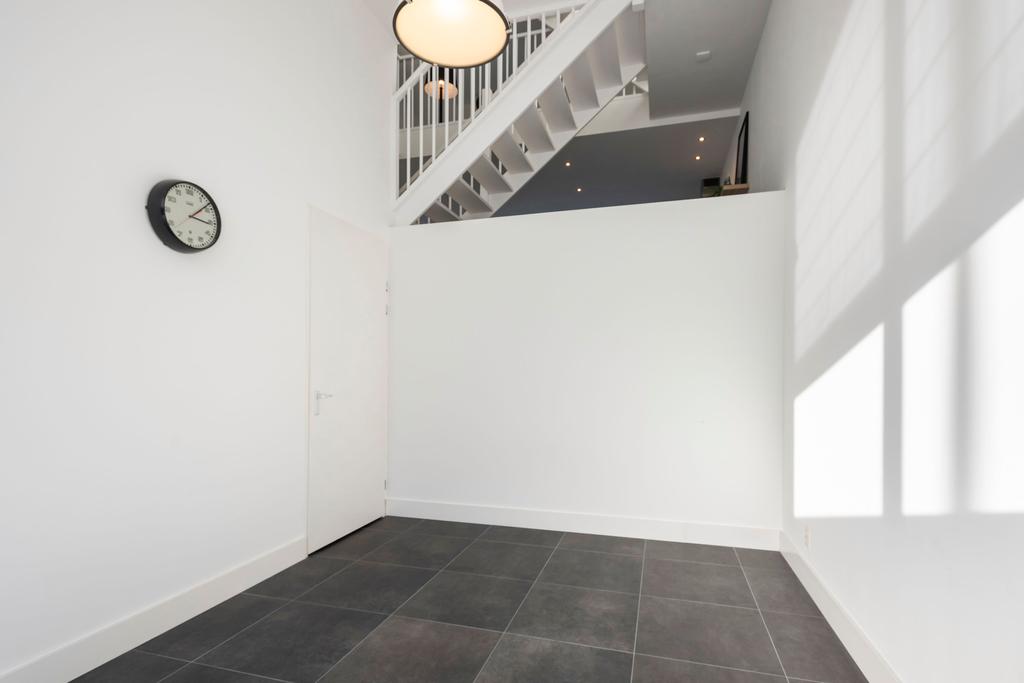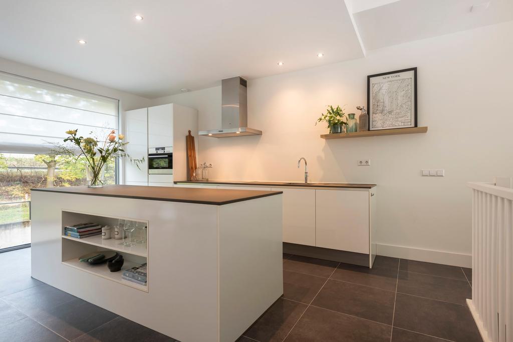 Begane grond U betreedt de woning via de hal met meterkast, garderobe, nette toiletruimte en halve trapopgang naar de woonkeuken. Rechts treft u een ruim vertrek voorzien van grote raampartijen met zicht op de voortuin, plavuizenvloer en toegang tot een grote inbouwkast. De woonkeuken met plavuizenvloer en spotverlichting ligt een halve verdieping hoger en kijkt via grote raampartijen uit aan de noordzijde, tevens kijkt u door de vide uit op het kantoor beneden. In de keuken vindt u een recht keukenmeubel en een kookeiland, elk met een dun stenen werkblad. Apparatuur betreft een inductiekookplaat, afzuigkap, vaatwasser, combi-oven, koelkast en vriezer. Daarnaast is er plaats voor een grote eettafel.