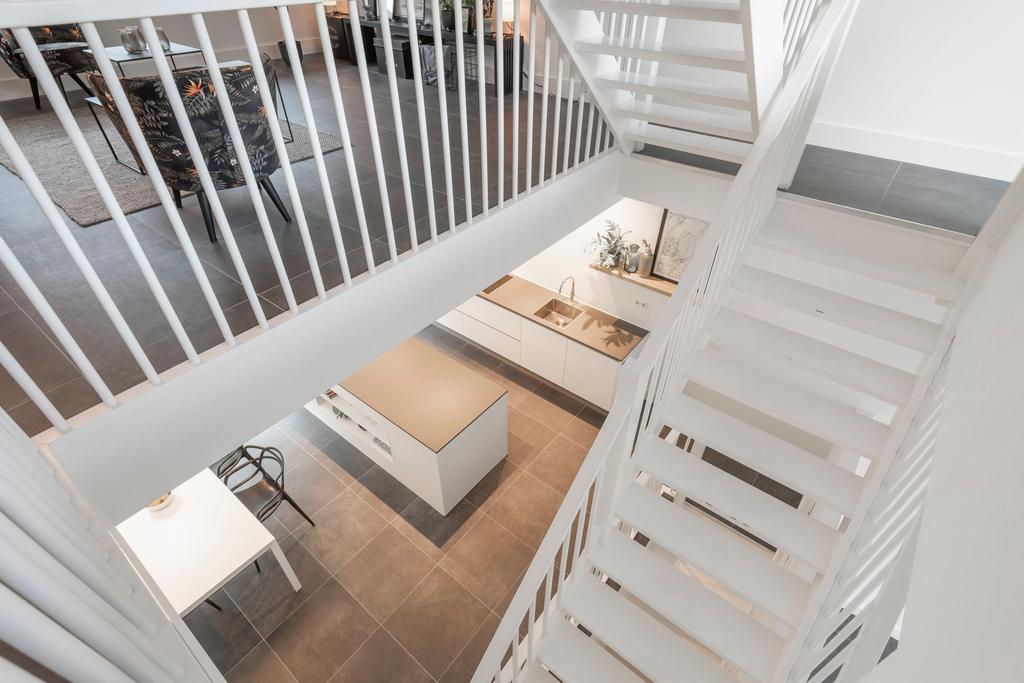 Eerste verdieping De volledige eerste verdieping wordt beslagen door de woonkamer. Deze is erg ruim en heeft een open karakter door raampartijen aan weerszijden, aan de zuidzijde kijkt u via de schuifpui op het terras. Het trappenhuis in het midden van de ruimte geeft een speelse uitstraling en maakt ruimte voor verschillende zithoeken. Ook dit vertrek is uitgerust met een plavuizenvloer.