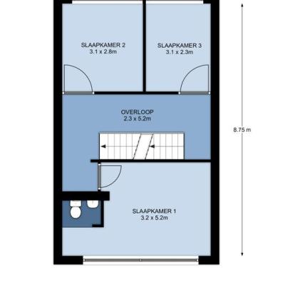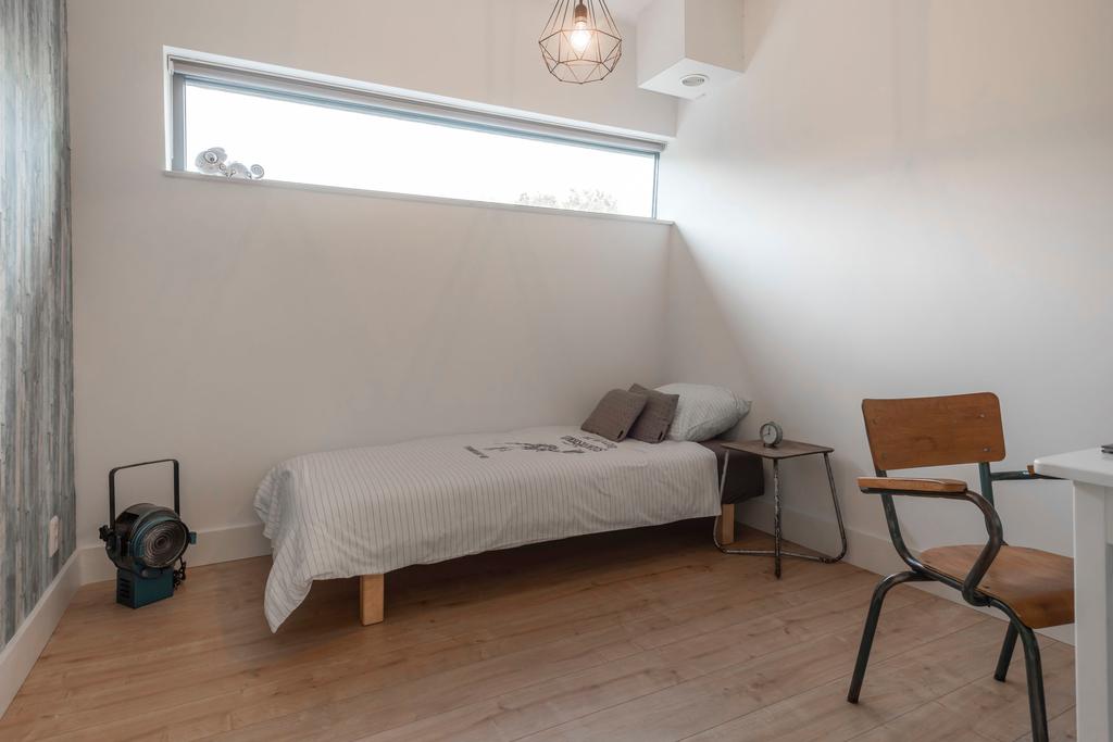 Tweede verdieping Via de ruime overloop heeft u toegang tot drie riante slaapkamers, elk met raampartijen, een lichte vloer in houtlook, strak afgewerkte wanden, mechanische ventilatie en een bovenlicht. De grote kamer aan de zuidzijde is voorzien van een schuifpui over de volledige breedte met balustrade aan de binnenzijde en geeft toegang tot een eigen toiletruimte.