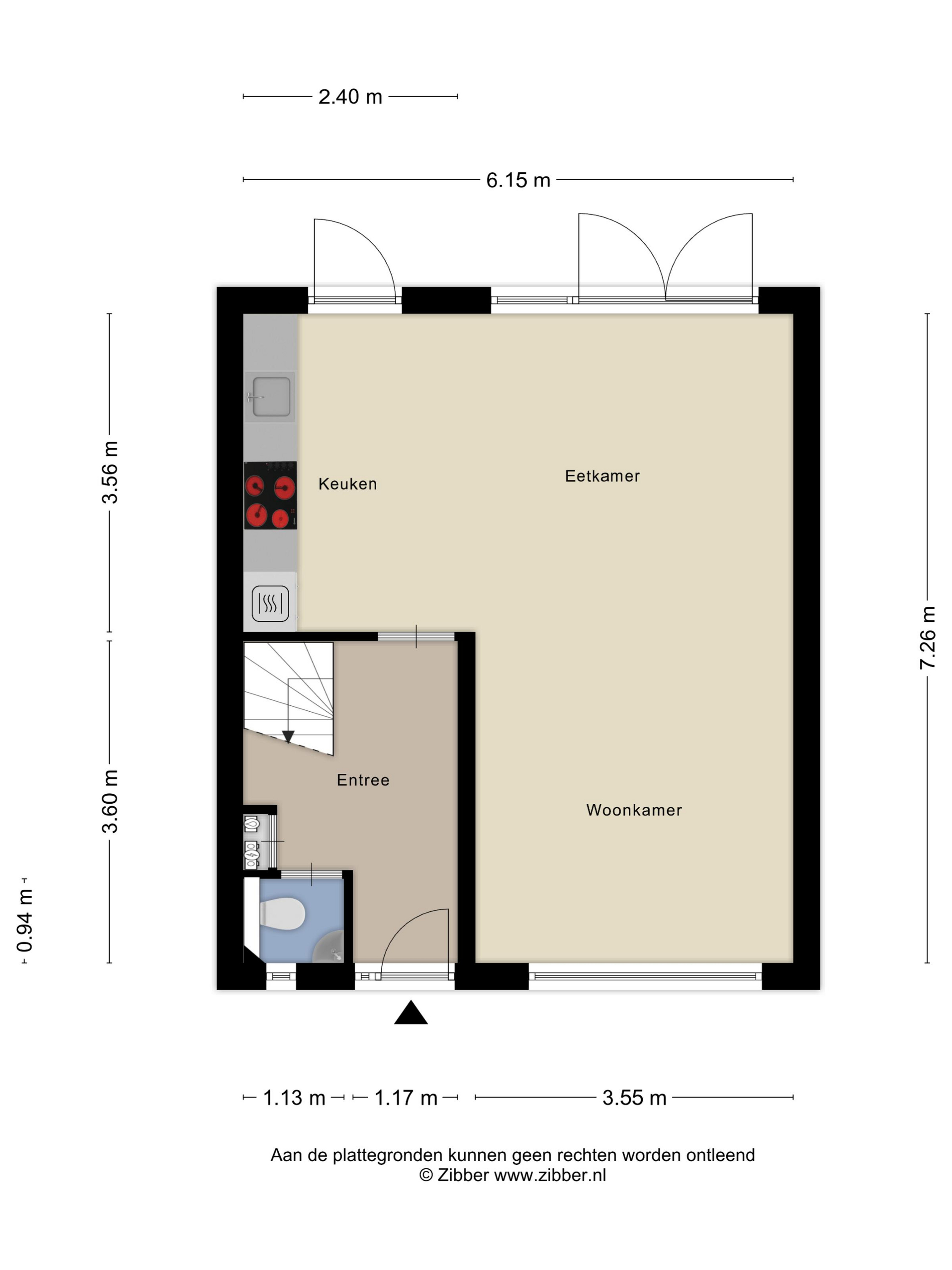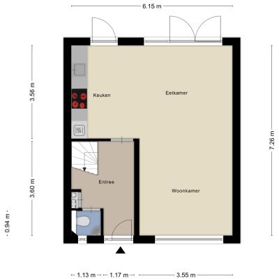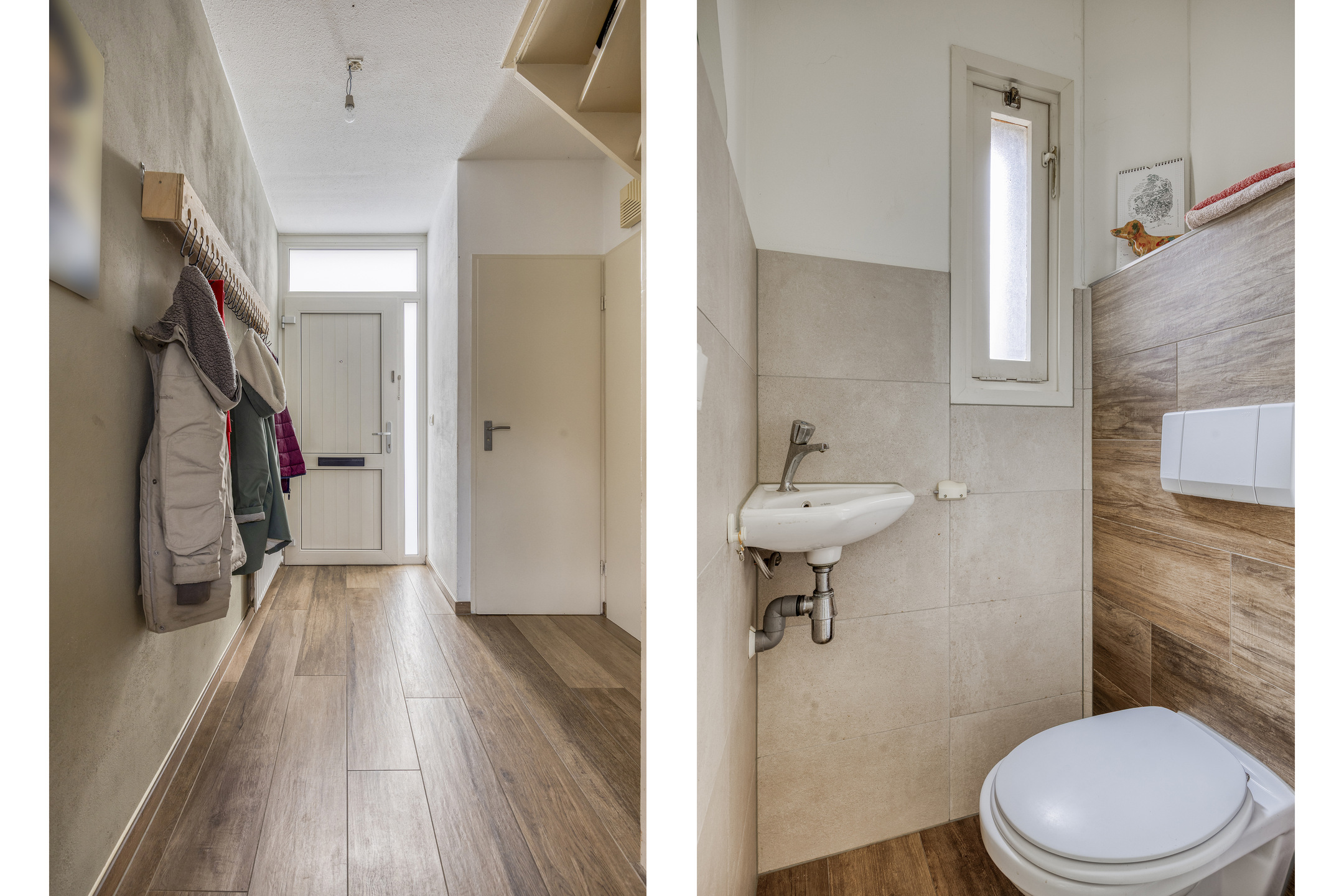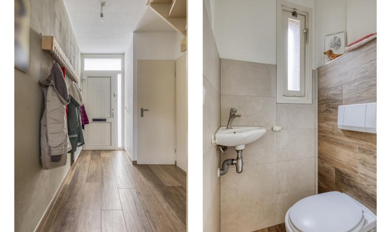 Entree: Via de ruime voortuin betreedt u de woning en komt u in de hal terecht. Hier ervaart u direct de praktische indeling: voldoende ruimte voor een kapstok en een opbergmeubel, een toiletruimte en de trap naar de 1e verdieping. De hal vormt een prettige overgang naar de rest van de woning en geeft een gevoel van ruimte en openheid bij binnenkomst.
