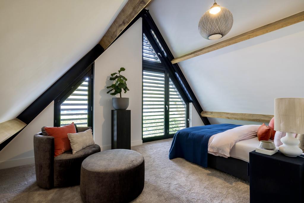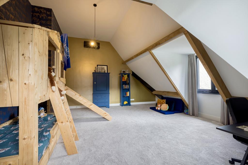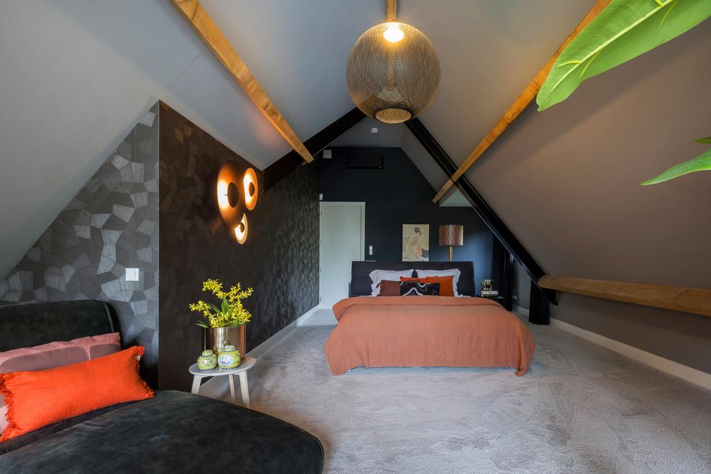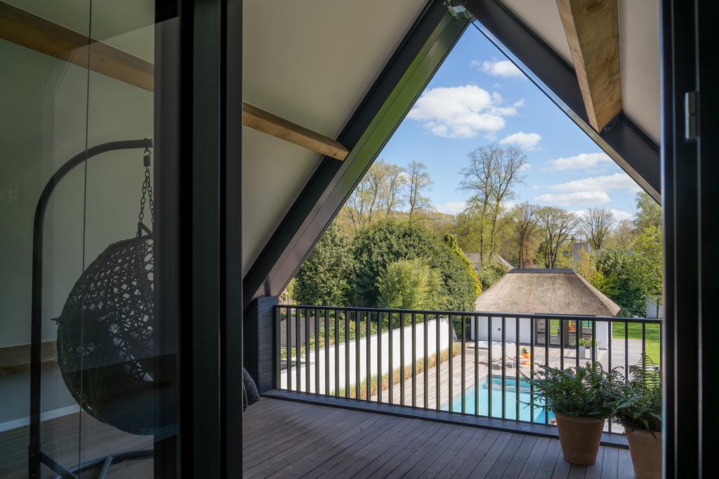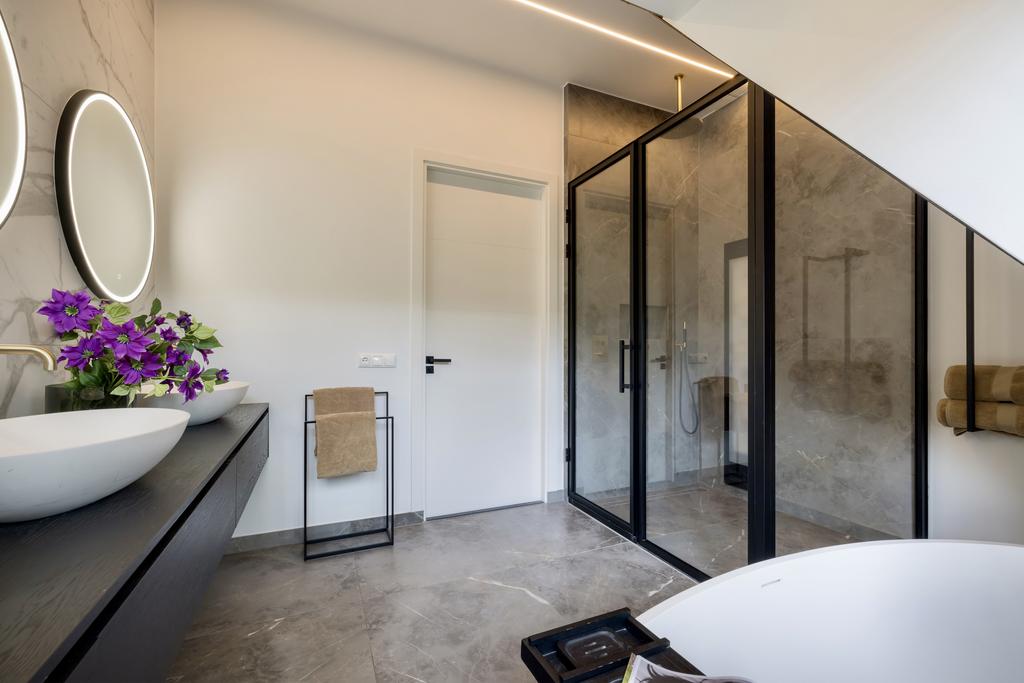 Op de verdieping aangekomen vallen twee dingen op. De hoeveelheid daglicht die via het raam boven de trap naar binnen valt en de enorme hoogte. De overloop geeft toegang tot een apart toilet, de badkamer, een technische ruimte en maar liefst vier royale slaapkamers. Met marmeren tegels, een vrijstaand bad, waskommen op een maatwerkmeubel en een royale inloopdouche met ‘Sunshower’ straalt de badkamer luxe en elegantie uit. Kenmerkend voor alle slaapvertrekken is de fijne hoeveelheid daglicht, de grootte, de hoogte en de aanwezigheid van karakteristieke eikenhouten balken. Drie van de vier slaapkamers zijn voorzien van airconditioning voor extra comfort en het mooiste details van de masterbedroom is het balkon. Met een waanzinnig uitzicht op de diepe achtertuin.