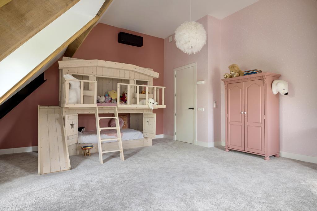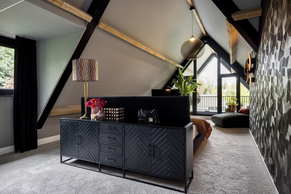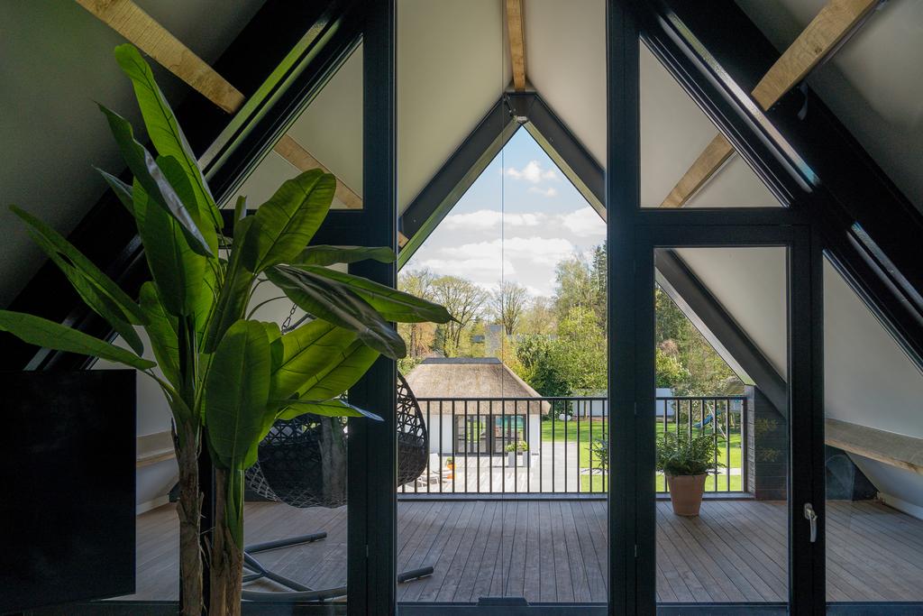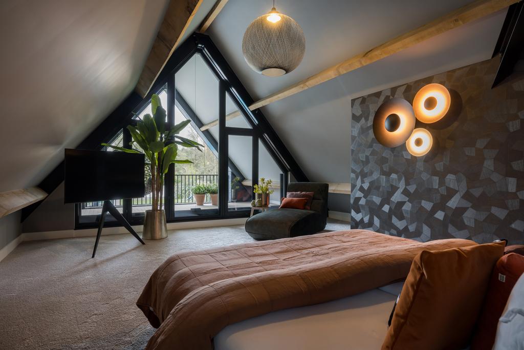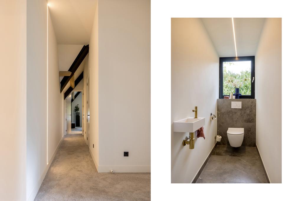 Op de verdieping aangekomen vallen twee dingen op. De hoeveelheid daglicht die via het raam boven de trap naar binnen valt en de enorme hoogte. De overloop geeft toegang tot een apart toilet, de badkamer, een technische ruimte en maar liefst vier royale slaapkamers. Met marmeren tegels, een vrijstaand bad, waskommen op een maatwerkmeubel en een royale inloopdouche met ‘Sunshower’ straalt de badkamer luxe en elegantie uit. Kenmerkend voor alle slaapvertrekken is de fijne hoeveelheid daglicht, de grootte, de hoogte en de aanwezigheid van karakteristieke eikenhouten balken. Drie van de vier slaapkamers zijn voorzien van airconditioning voor extra comfort en het mooiste details van de masterbedroom is het balkon. Met een waanzinnig uitzicht op de diepe achtertuin.