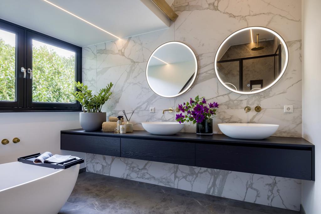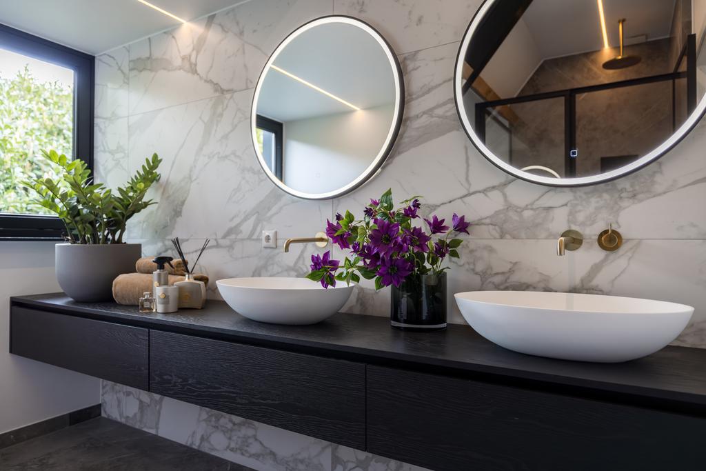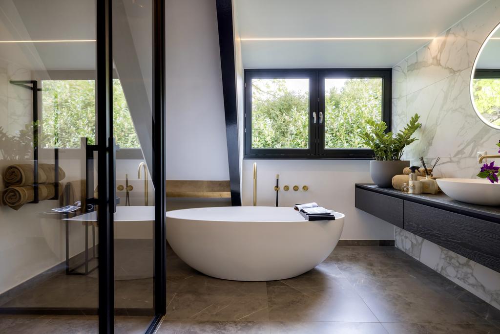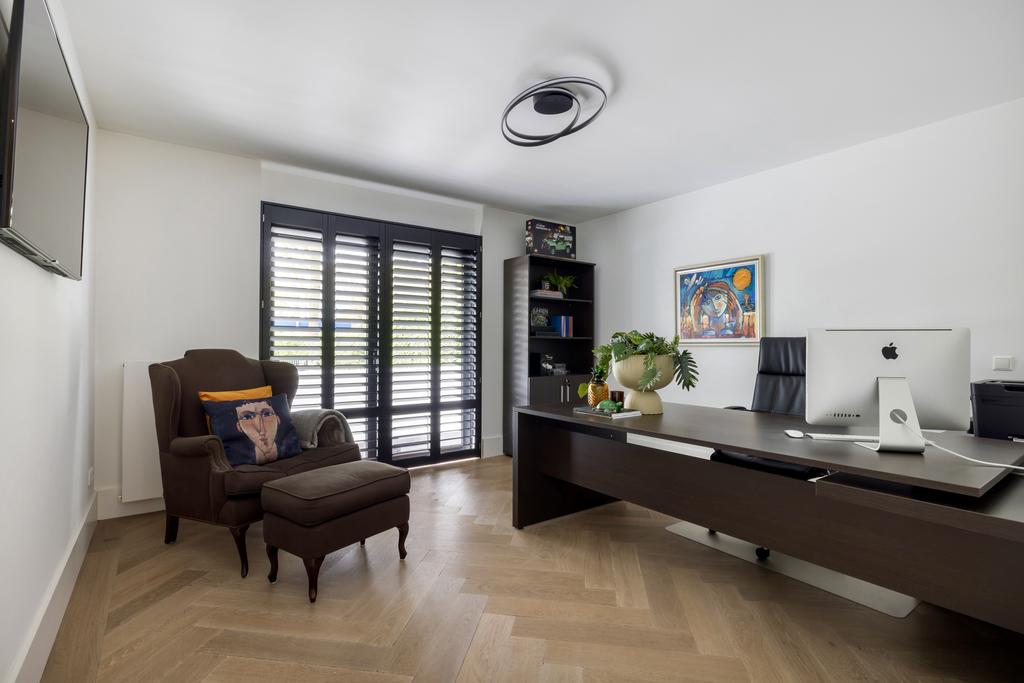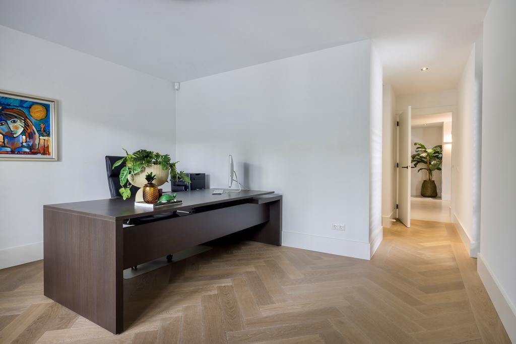 Bij binnenkomst nemen we in de hal allereerst de trap naar beneden naar de ondergrondse garage (met laadbox voor het laden van een elektrische auto). Hier is ruimte voor in ieder geval drie auto’s. “Wat vooral heel erg fijn is op regenachtige dagen of wanneer het vriest. We lopen naar beneden, gaan in de auto zitten, openen één van de garagedeuren en rijden zo weg.” Verderop bevindt zich een voormalige wijnkelder, nu omgetoverd tot een praktische opbergruimte voor schoonmaakspullen en proviand. Terug boven lopen we via de hal de voormalige masterbedroom aan de voorzijde van de villa binnen. De ruimte, met eikenhouten visgraat parket, is nu in gebruik als kantoor met balkon en uitzicht op de fraaie voortuin. Al is hier in een handomdraai weer een slaapvertrek op de begane grond van te maken. Er is namelijk een walk-in closet gerealiseerd met daarnaast een royale badkamer met inloopdouche en twee wastafels.
