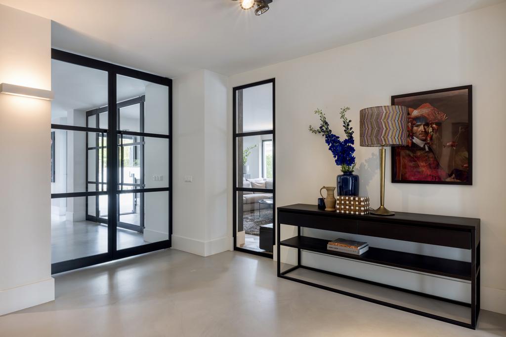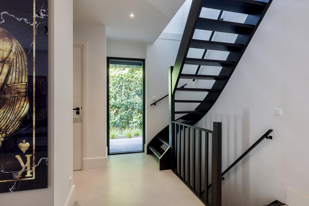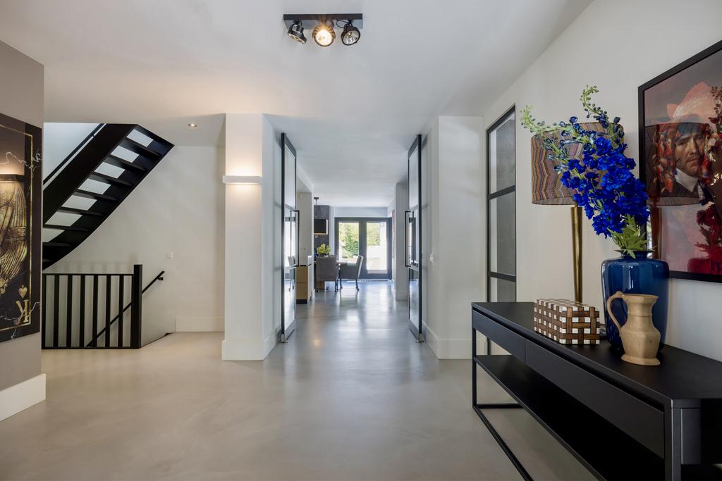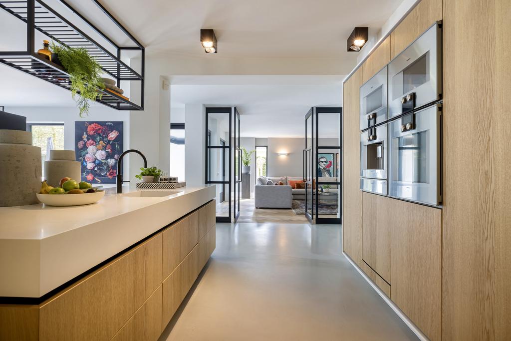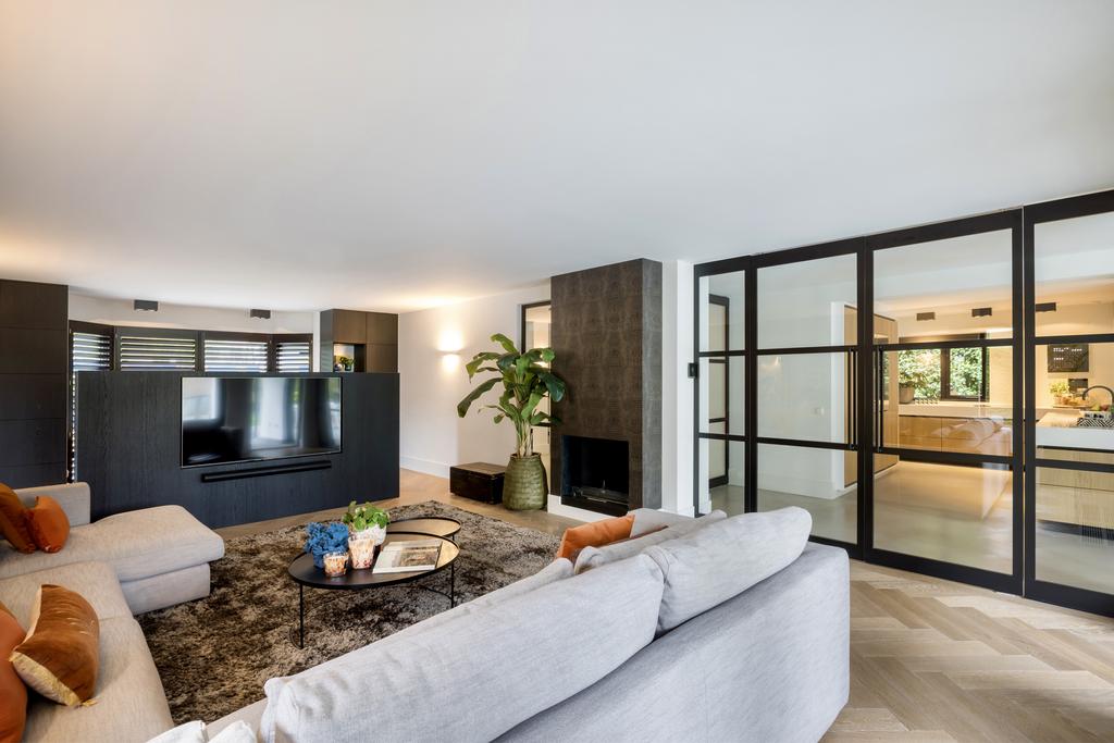 Op maat gemaakte stalen taatsdeuren in de hal geven toegang tot de woonkeuken. Een ruimte waar de huidige bewoners naar eigen zeggen veel tijd doorbrengen. Onder andere vanwege de overgang tussen binnen en buiten. De gietvloer met vloerverwarming en de op bio-ethanol werkende open haard voegen extra comfort, luxe en sfeer toe aan de ruimte. De door een interieurdesigner ontworpen keuken biedt ruimte aan een scala aan moderne apparatuur. Van een combi-oven, een stoomoven en een magnetron tot een inbouwkoffieapparaat en een warmhoudlade. Saillant detail is het aanrecht van ergoline, dat is gegoten uit één stuk. In de living heeft dezelfde interieurbouwer een comfortabele leefruimte gecreëerd waar esthetiek en functionaliteit mooi samenkomen. Een voorbeeld is de roomdivider die aan de ene zijde functioneert als televisiemeubel en aan de andere kant momenteel in gebruik is als speelhoek voor de kinderen. Met aan weerszijden van de raampartij vaste maatwerk kasten met verlichting die reageert op beweging. De houten visgraat parketvloer en open haard creëren een gezellige ambiance in de living. Hier genieten bewoners van een uitzicht op de diepe achtertuin dat nooit verveeld.