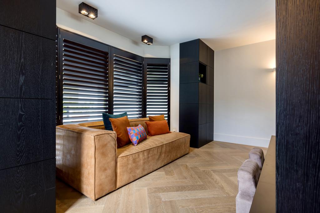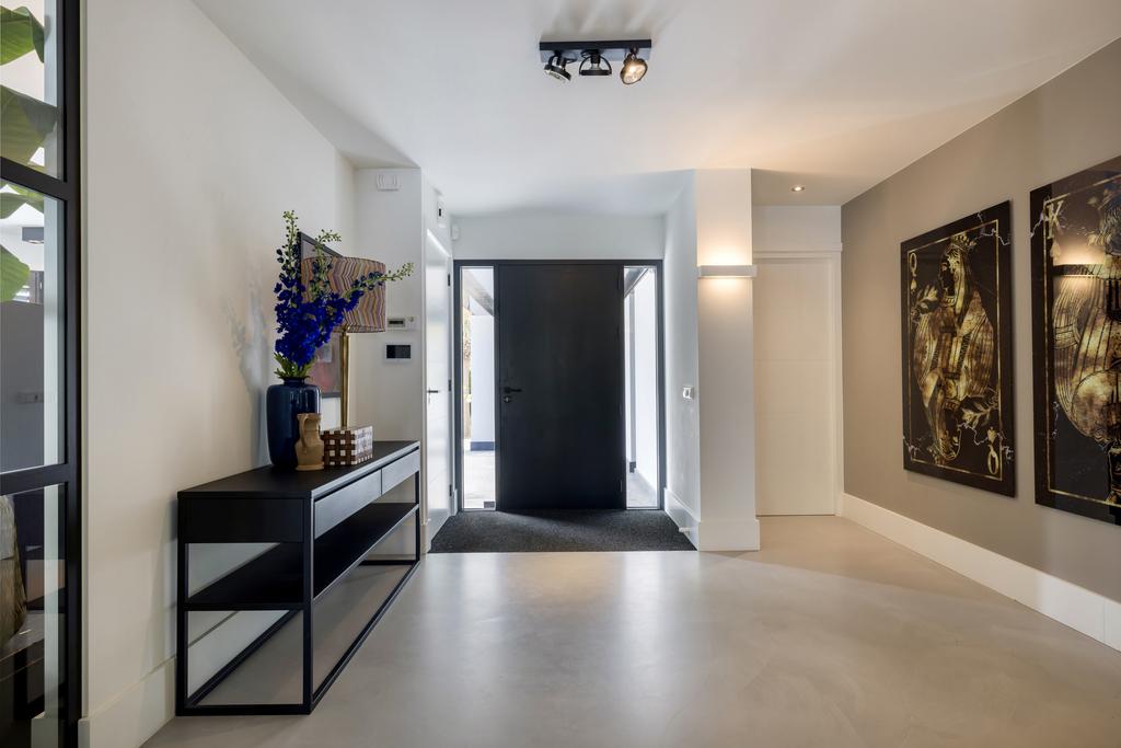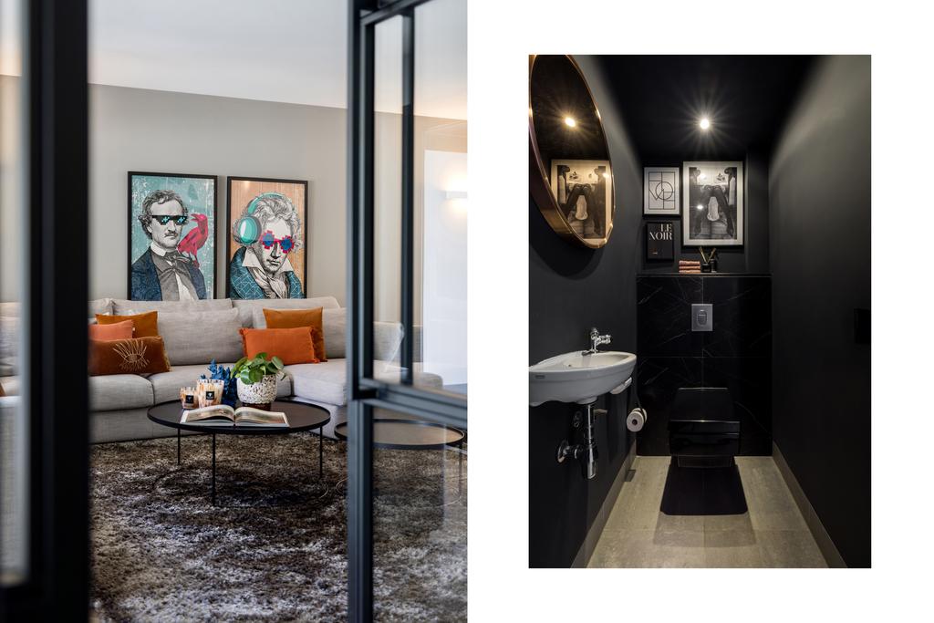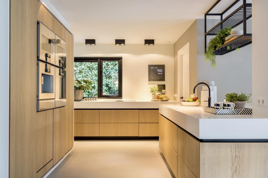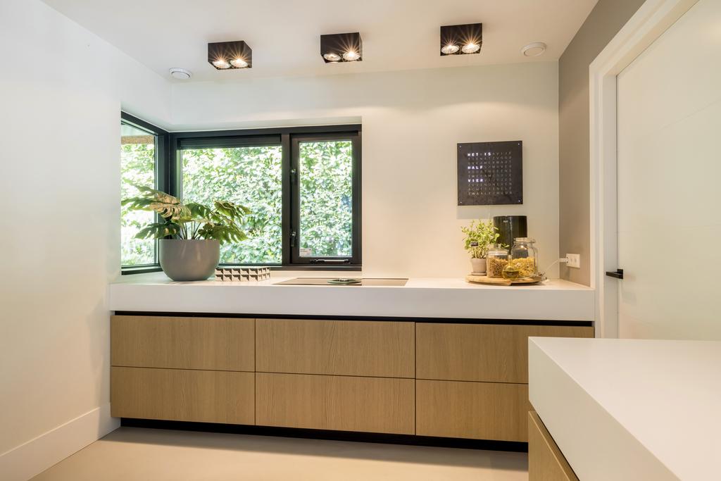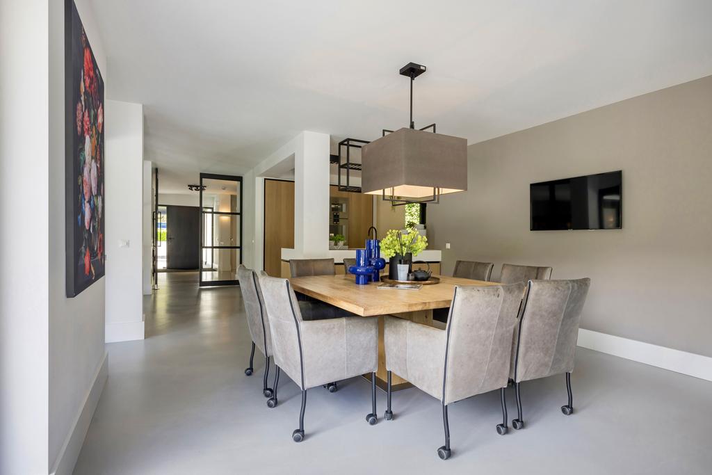 Op maat gemaakte stalen taatsdeuren in de hal geven toegang tot de woonkeuken. Een ruimte waar de huidige bewoners naar eigen zeggen veel tijd doorbrengen. Onder andere vanwege de overgang tussen binnen en buiten. De gietvloer met vloerverwarming en de op bio-ethanol werkende open haard voegen extra comfort, luxe en sfeer toe aan de ruimte. De door een interieurdesigner ontworpen keuken biedt ruimte aan een scala aan moderne apparatuur. Van een combi-oven, een stoomoven en een magnetron tot een inbouwkoffieapparaat en een warmhoudlade. Saillant detail is het aanrecht van ergoline, dat is gegoten uit één stuk. In de living heeft dezelfde interieurbouwer een comfortabele leefruimte gecreëerd waar esthetiek en functionaliteit mooi samenkomen. Een voorbeeld is de roomdivider die aan de ene zijde functioneert als televisiemeubel en aan de andere kant momenteel in gebruik is als speelhoek voor de kinderen. Met aan weerszijden van de raampartij vaste maatwerk kasten met verlichting die reageert op beweging. De houten visgraat parketvloer en open haard creëren een gezellige ambiance in de living. Hier genieten bewoners van een uitzicht op de diepe achtertuin dat nooit verveeld.