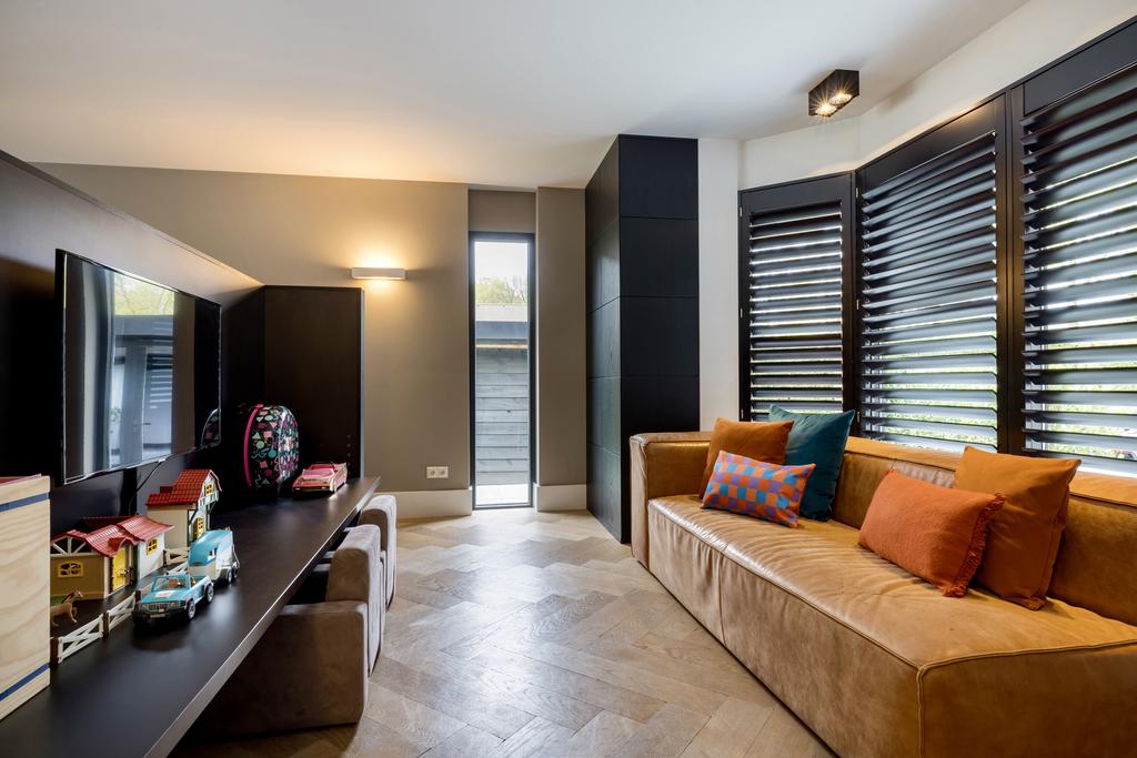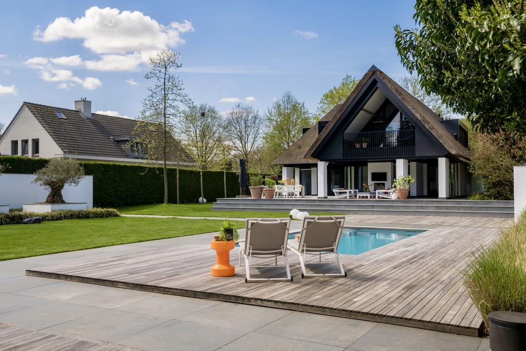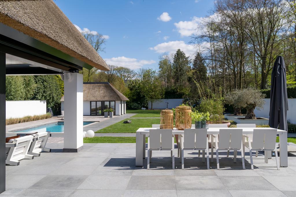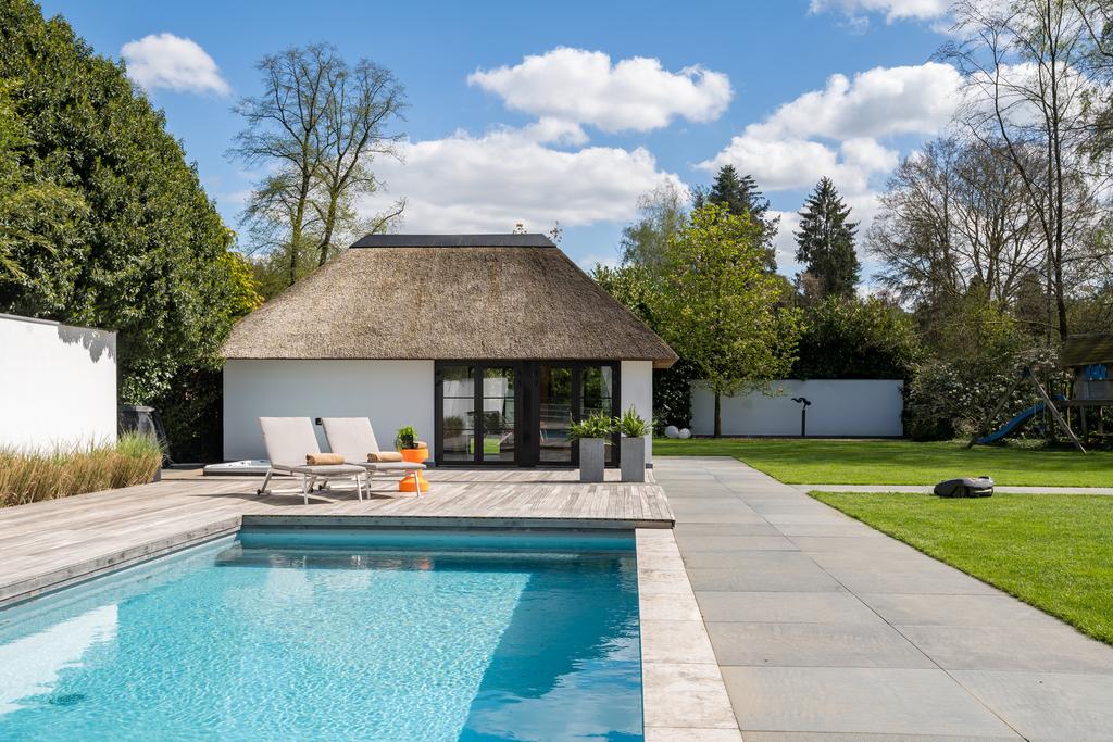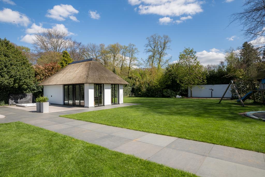 Vanaf het balkon van de masterbedroom vingen we al een glimp op van de enorme achtertuin. Beneden, bij het openen van de deuren in de woonkeuken, ontvouwt de tuin zich recht voor onze ogen. Knops Tuindesign heeft hier een schitterende buitenruimte gecreëerd. Een plek met een serene sfeer waar bewoners volledig tot rust komen. Onder andere door de privacy die is gecreëerd. Een eigenschap waar de bufferzone van tien meter achter in de tuin een rol in speelt. In deze villatuin komen luxe, comfort, wellness en design harmonieus samen. Zowel op de terrassen, bij het verwarmde zwembad en de jacuzzi, als in het multifunctionele poolhouse. Deze ruimte, die naadloos aansluit op de architectuur van de villa, is multifunctioneel en kan dienen als gastenverblijf of onderkomen voor oudere kinderen, met voorzieningen zoals een slaapkamer, keuken, toilet en airconditioning. Maar het is ook gewoon een heel fijne plek om te ontspannen na een verfrissende duik in het zwembad. Net zoals het overdekte terras aan huis, dat met de aanwezige haard en glazen wand ook tijdens koelere momenten een comfortabele plek is om van de tuin te genieten. Zelfs ’s avonds, wanneer de buitenverlichting de tuin een extra dimensie geeft.