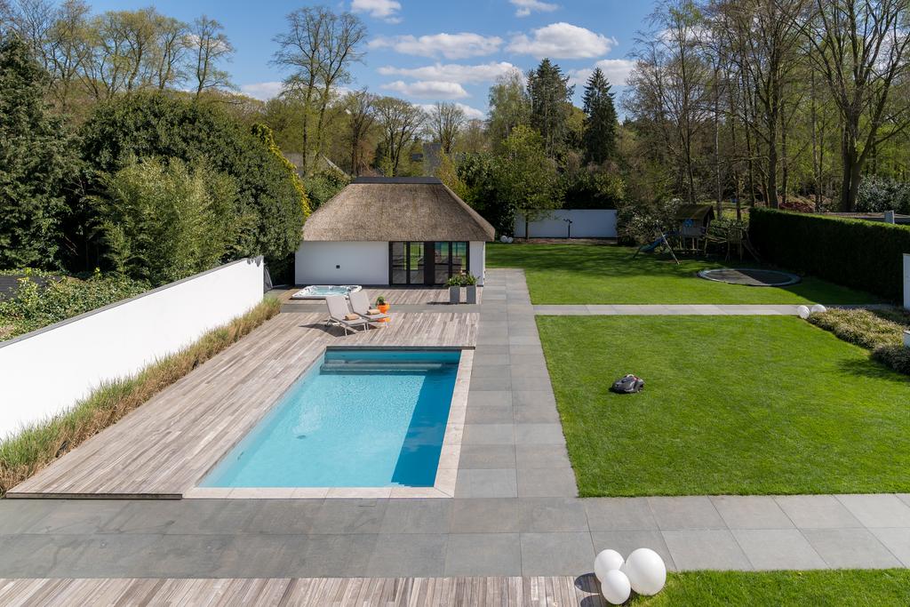 Onder architectuur ontworpen tuin met verwarmd zwembad