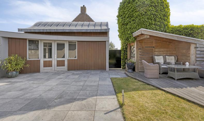 De buitenruimte - een heerlijke privacyrijke plek! De tuin rondom de woning is met zorg en stijl aangelegd. De achtertuin is onderhoudsvriendelijk én veelzijdig met sierbestrating, een gazon en meerdere terrassen. Onder de houten veranda kunt u heerlijk loungen, zelfs als het weer wat minder is. In het houten tuinhuis aan de zijkant vindt u extra bergruimte of een fijne plek voor hobby’s. De vrijstaande garage is voorzien van een grote bovenverdieping en openslaande deuren, en biedt plek voor auto, fietsen of werkruimte. De tuin is volledig omheind en biedt volop privacy – een heerlijke plek om in alle rust te genieten.