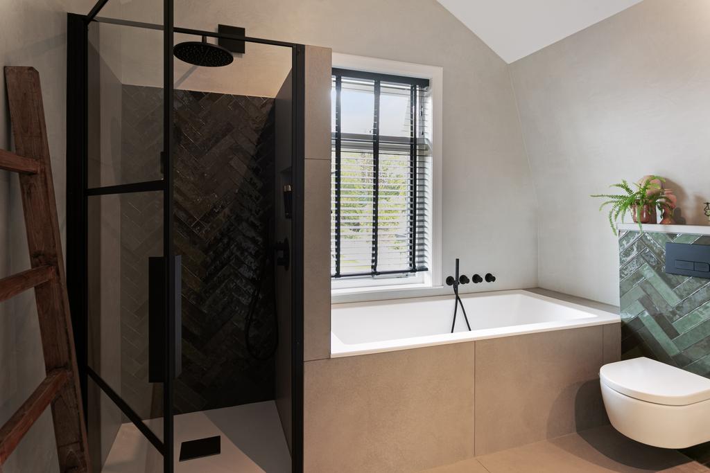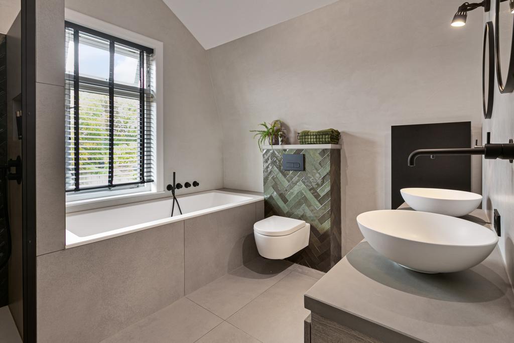 Op de eerste verdieping bevinden zich drie ruime slaapkamers, prachtig afgewerkt en heerlijk licht, dankzij de mooie raampartijen met glas in loodraampjes. De moderne badkamer is een echte oase van luxe, voorzien van een groot raam dat zorgt voor een natuurlijke lichtinval. De betonlook tegels, het tweepersoons ligbad, de separate regendouche, het grote badmeubel met dubbele waskom, de geïntegreerde kranen, designradiator en het hangende toilet maken dit tot een ultieme badkamer.