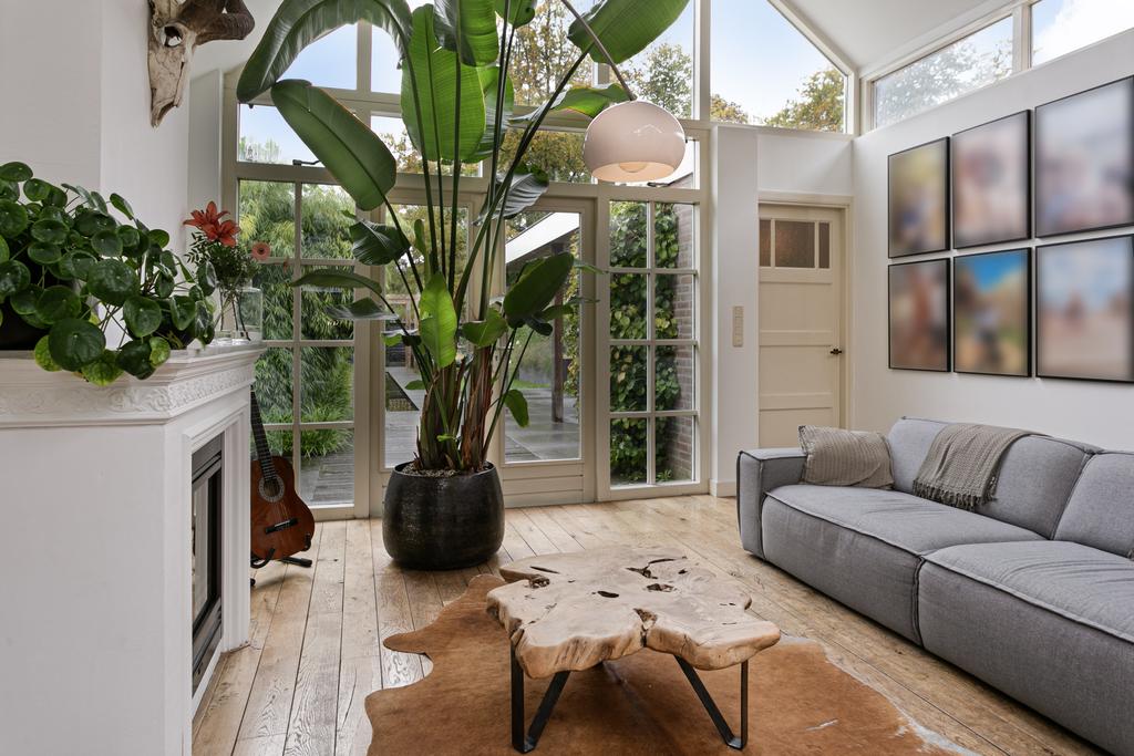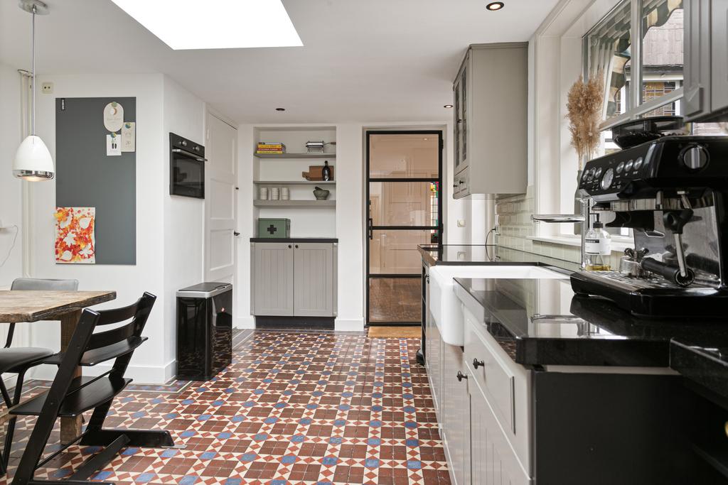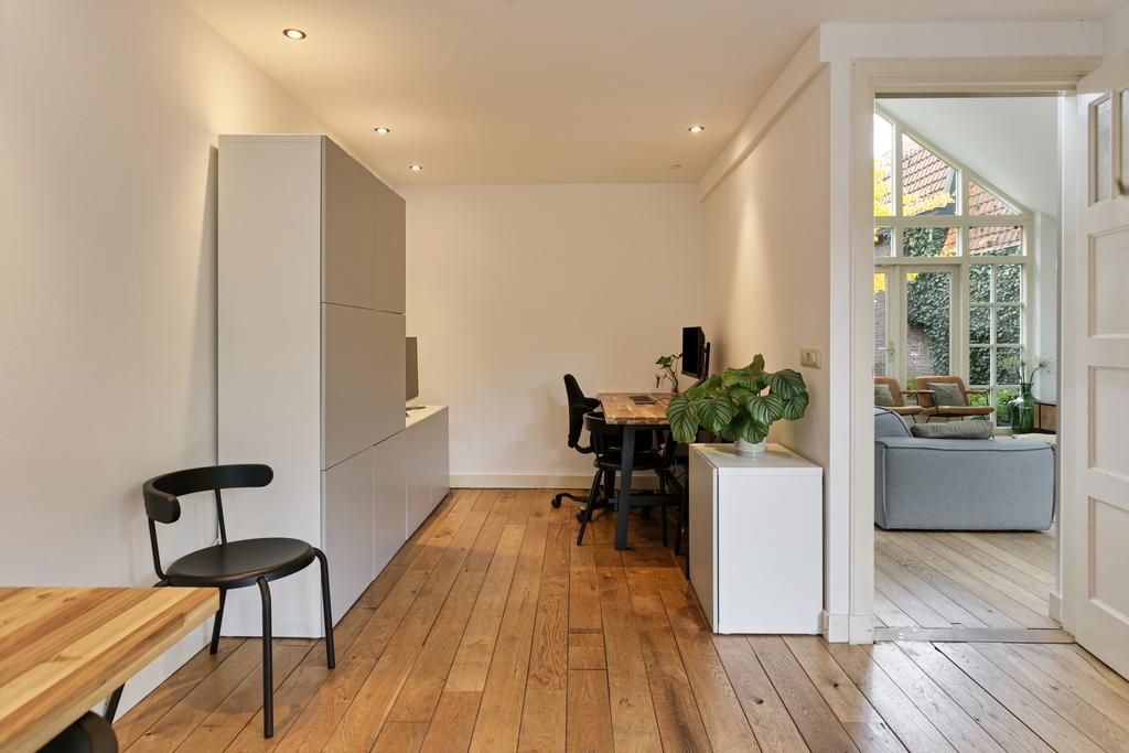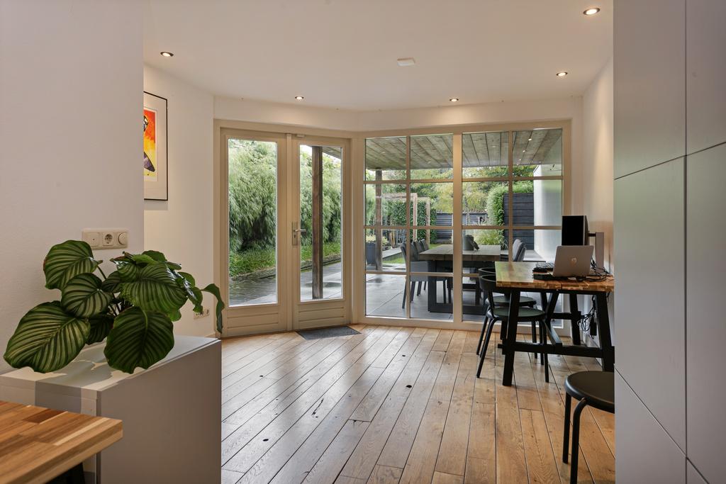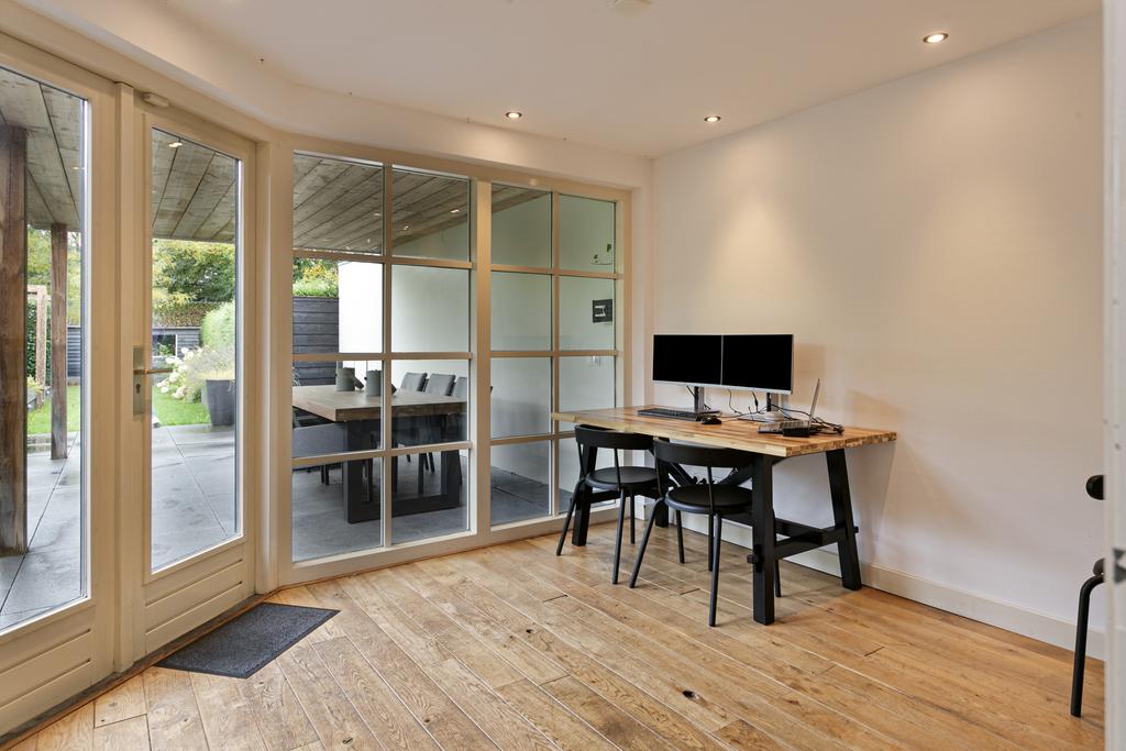 De royale keuken is een harmonie tussen oud en nieuw, met een prachtige authentieke tegelvloer en een modern keukenmeubel met een granieten werkblad. Hier vindt u alles wat u nodig heeft, zoals een stoomoven, koelkast, vaatwasser, een nisje voor het fornuis met oven en afzuigkap, en tevens toegang tot de kelderruimte en een bergkast. Via een mooie taatsdeur bereikt u de tuinkamer. De prachtige tuinkamer is royaal, en overgoten met licht door de prachtige glazen gevel. Waar de hoge nok extra ruimte toevoegt, zorgt de houten vloer voor een warme sfeer. Breng hier rustgevende momenten door terwijl u geniet van het zicht op de tuin en de gezelligheid van de sfeerhaard. Aan beiden zijden vindt u openslaande tuindeuren, waarmee u buiten naar binnen haalt. De airconditioning zorgt voor de nodige verkoeling, en de kantoorruimte is vanuit de tuinkamer bereikbaar. Het royale kantoor op de begane grond, met een grote raampartij en openslaande deuren naar de tuin, is uw perfecte werkplek.