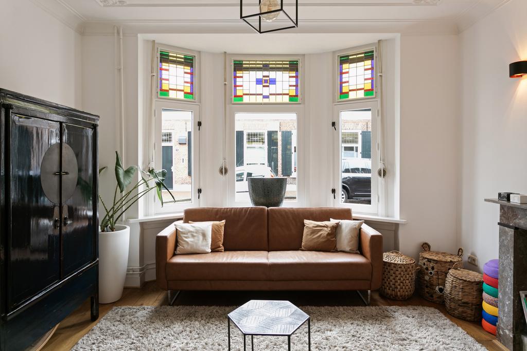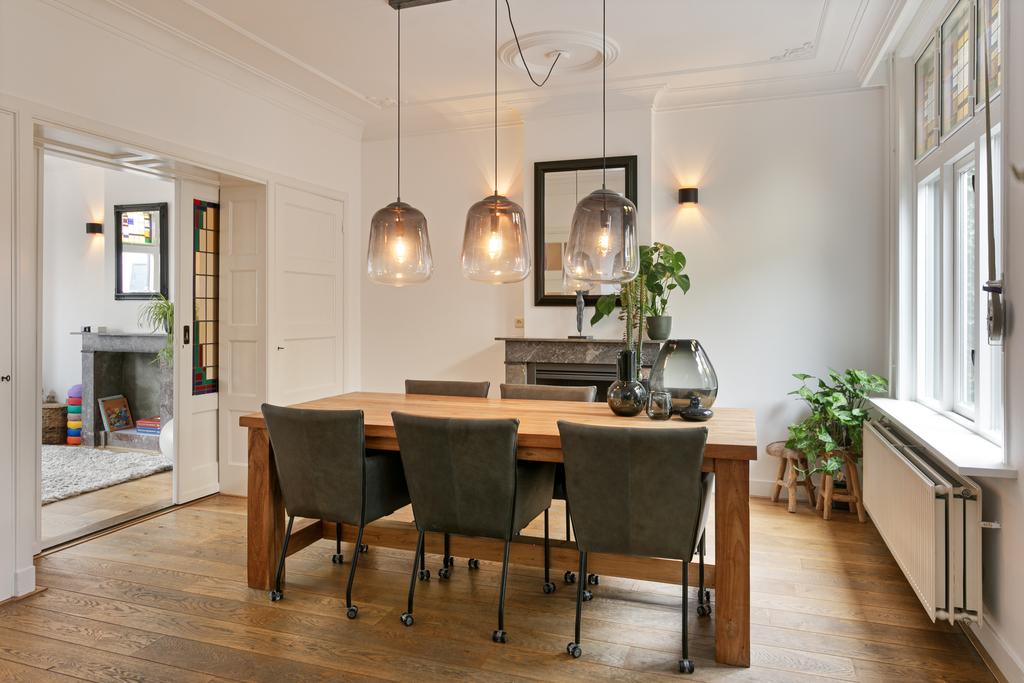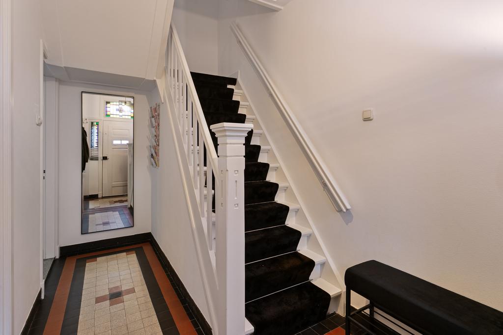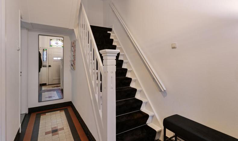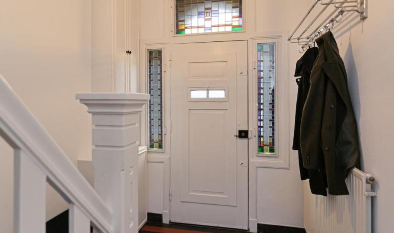 Bij binnenkomst wordt u direct begroet door een ruime en lichte entree met een hoog plafond en een authentieke tegelvloer. De hal is voorzien van een mooie trapopgang richting de volgende verdieping en verleent u toegang tot de woonkamer en eetkamer. De woonkamer is lekker ruim en heerlijk licht, met een hoog plafond voorzien van sierlijsten en een erker die zorgt voor veel lichtinval. Geniet van de gezelligheid van de open haard, en bewonder de prachtige houten vloer en de authentieke details, zoals de en suitedeuren met glas in loodramen. De ruime en lichte eetkamer beschikt over sfeervolle haard, een tweetal vaste kasten, heeft een mooi zicht op de tuin en geeft u toegang tot de keuken.