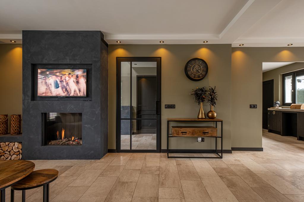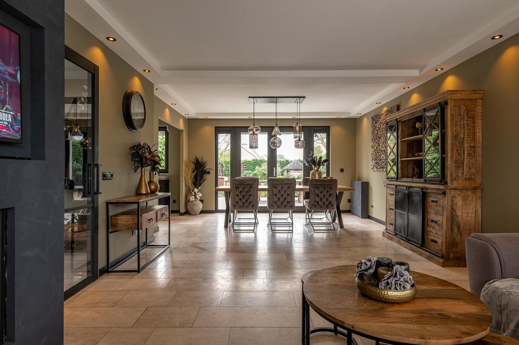 U betreedt de woning via de entree met gastentoilet. Links van de entree bevindt zich een ruime kamer (ca. 19m²) deze kan perfect als slaapkamer/speelkamer/kantoor dienen. Vanuit de entree heeft u toegang tot de ruime leefruimte (ca.35,5m²) met semi open keuken (ca.11,5m²). De leefruimte is voorzien van een gezellige gashaard en geniet van veel natuurlijk daglicht met daarbij mooi zicht in eigen tuin door de raampartijen. De keuken is van alle nodige kwaliteitstoestellen voorzien. Vanuit de keuken is er toegang tot de wasplaats die de verbinding geeft naar de inpandige garage met elec. poort. Verder bevindt zich op de begane grond nog de badkamer die voorzien is van douche, wastafel en toilet.