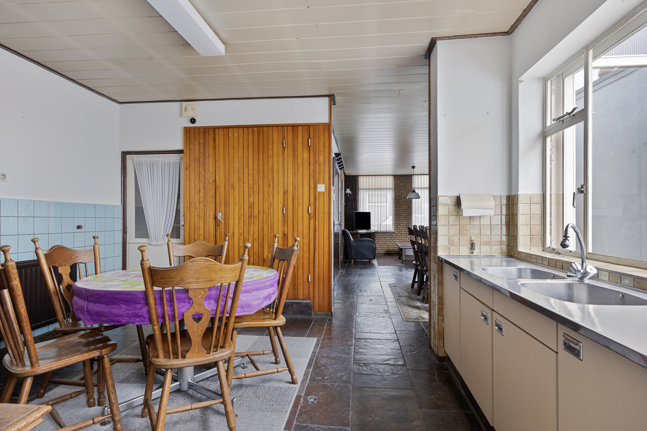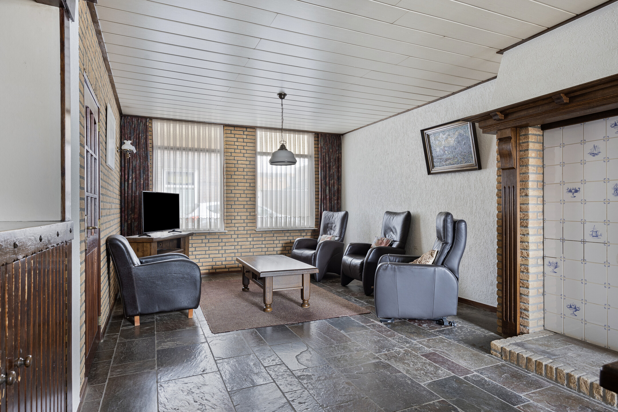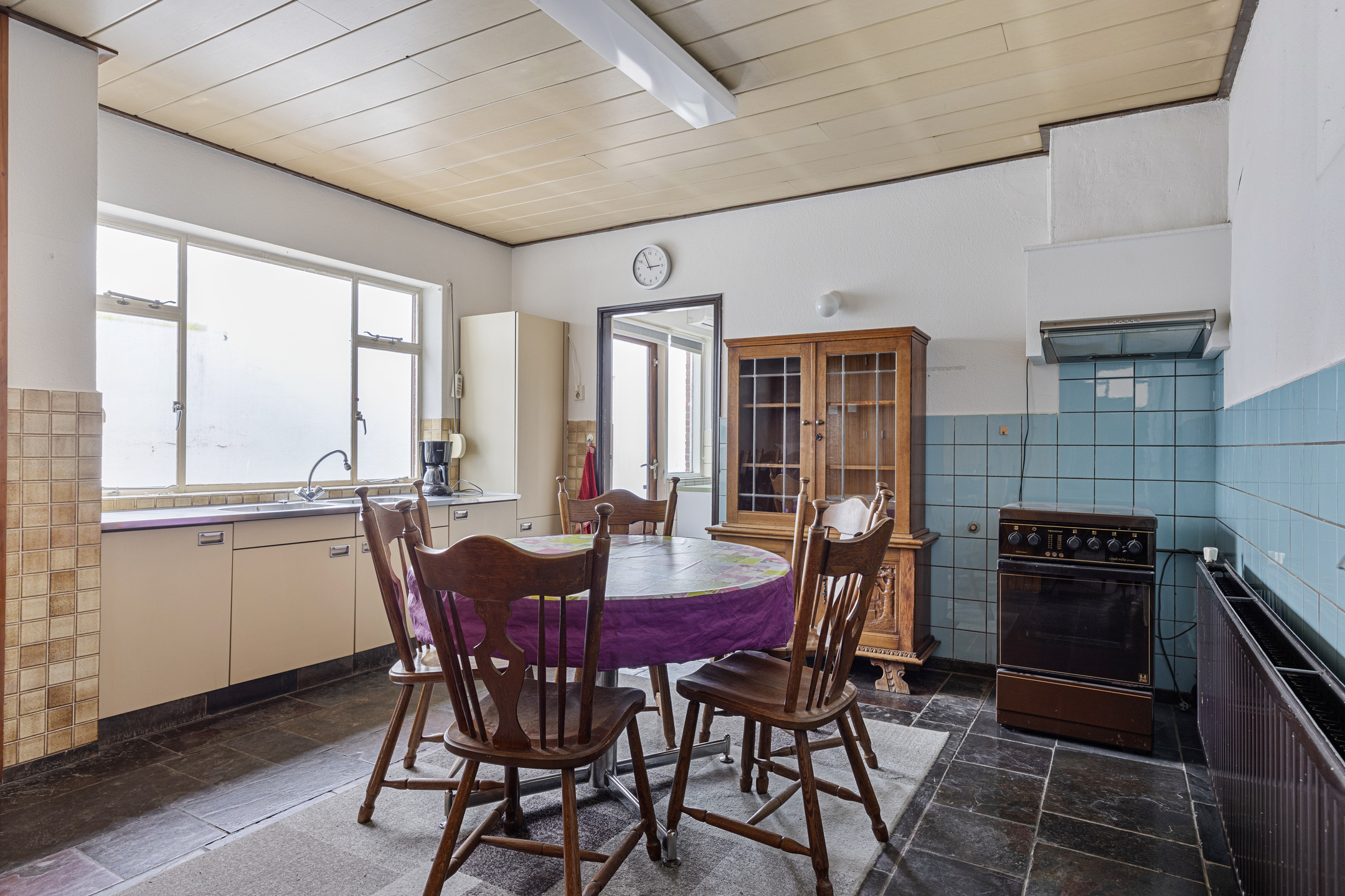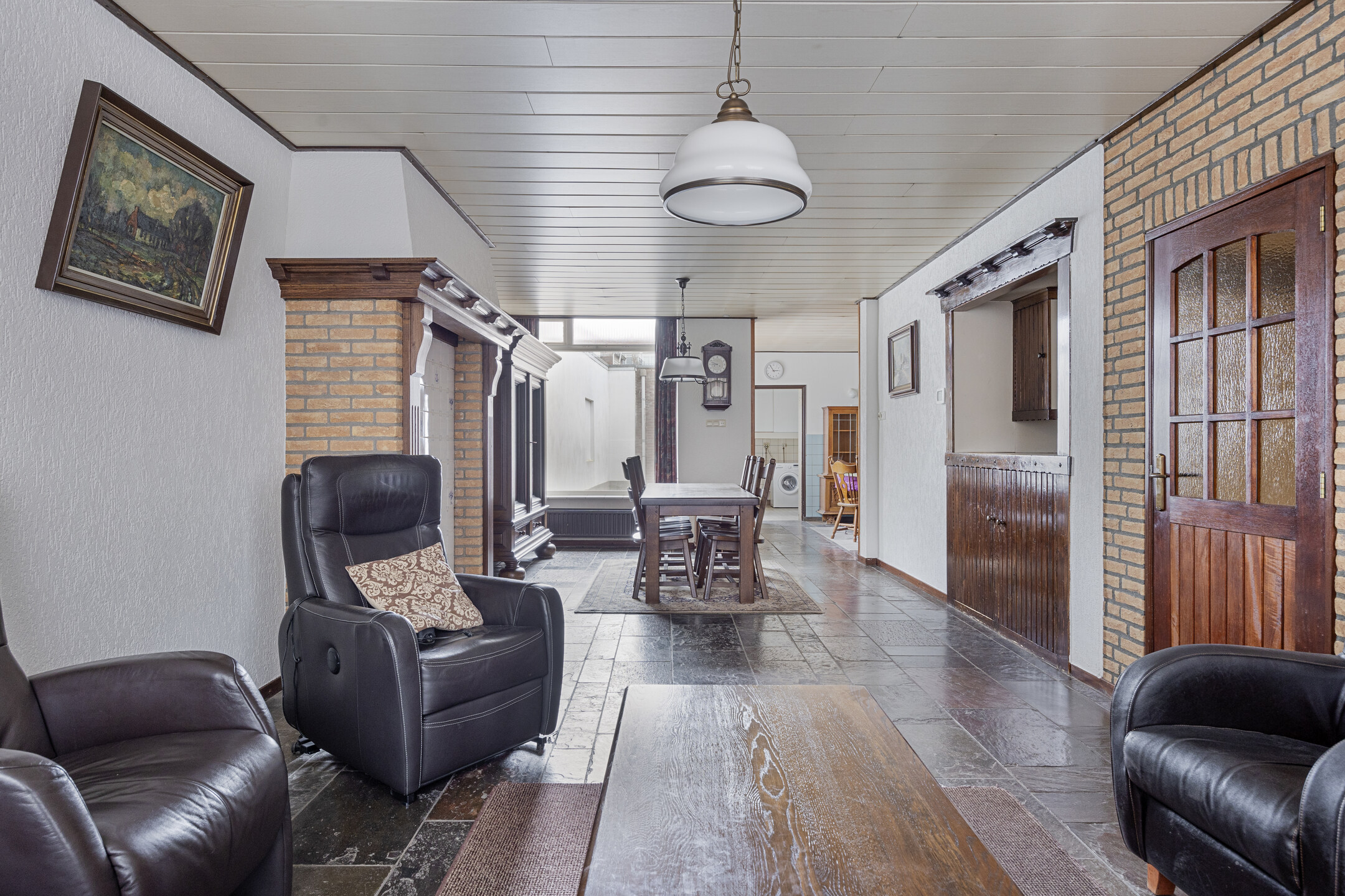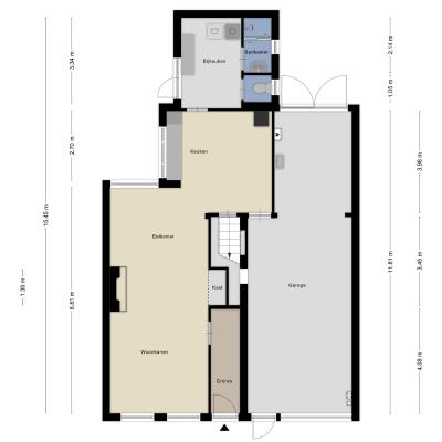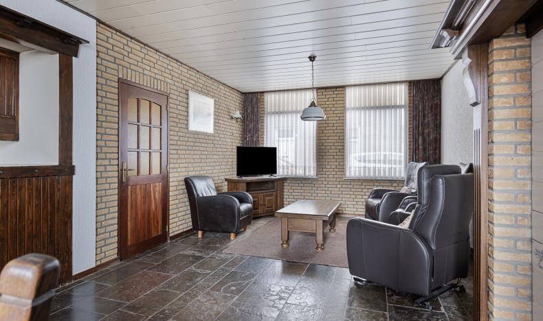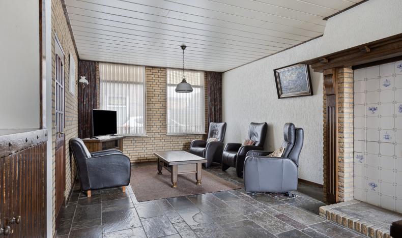 U betreedt de woning via de hal, waar u voldoende ruimte vindt voor een garderobe en toegang krijgt tot de royale woonkamer. De woonkamer is diep en voorzien van grote raampartijen aan de voorzijde, waardoor er veel daglicht binnenvalt. De sfeervolle ruimte is afgewerkt met een leistenen vloer en een karakteristieke schouw met betegeling. Aan de achterzijde van de woning bevindt zich de ruime keuken met eenvoudig keukenblok, gaskookplaat en afzuigkap. Hier is voldoende ruimte voor uw droomkeuken en een grote eettafel. Vanuit de keuken is er toegang tot de trap naar boven, een loopdeur richting de garage, en de praktische bijkeuken met witgoedaansluitingen, het toilet en een eenvoudige badkamer met douche en wastafel.