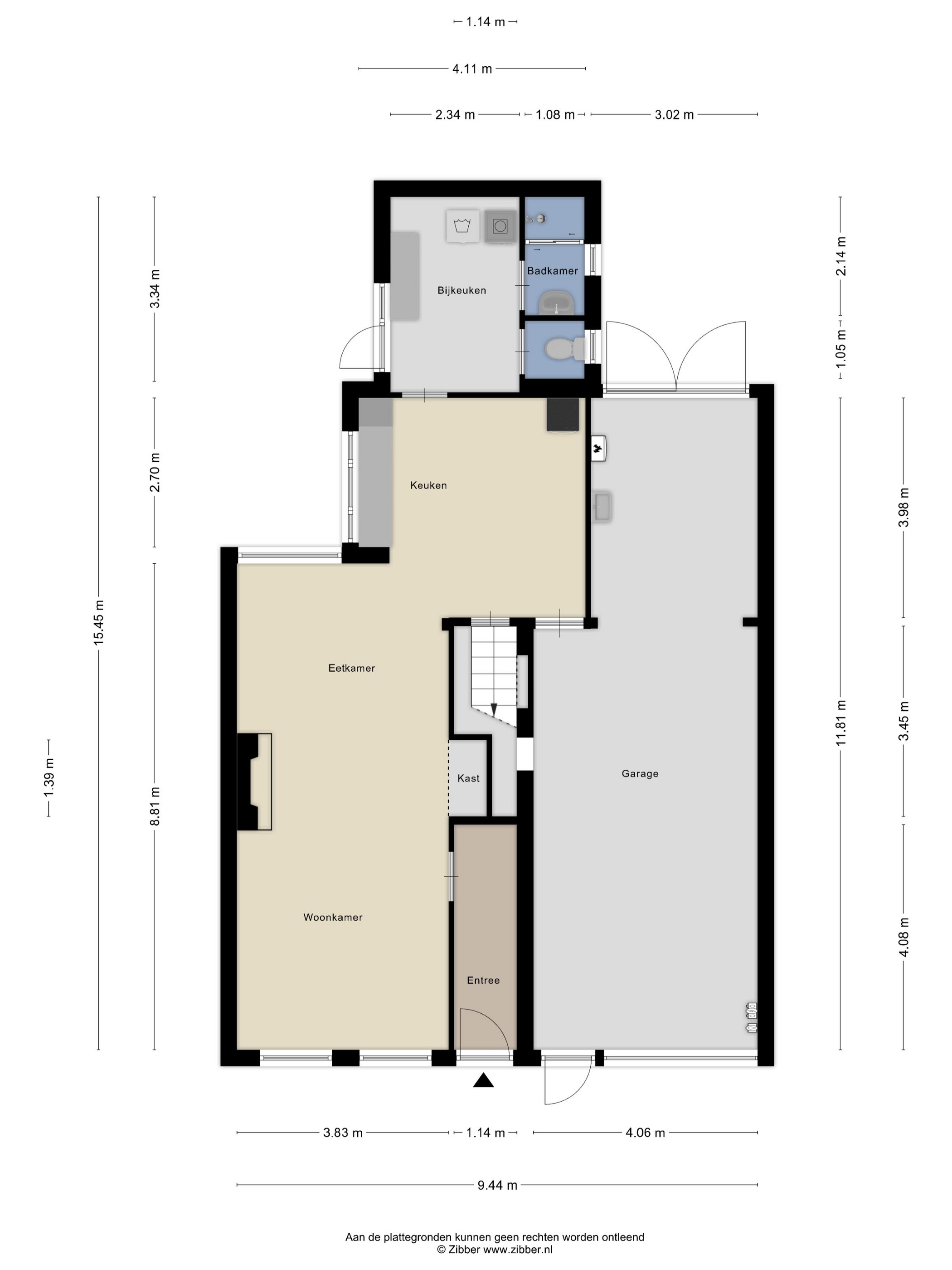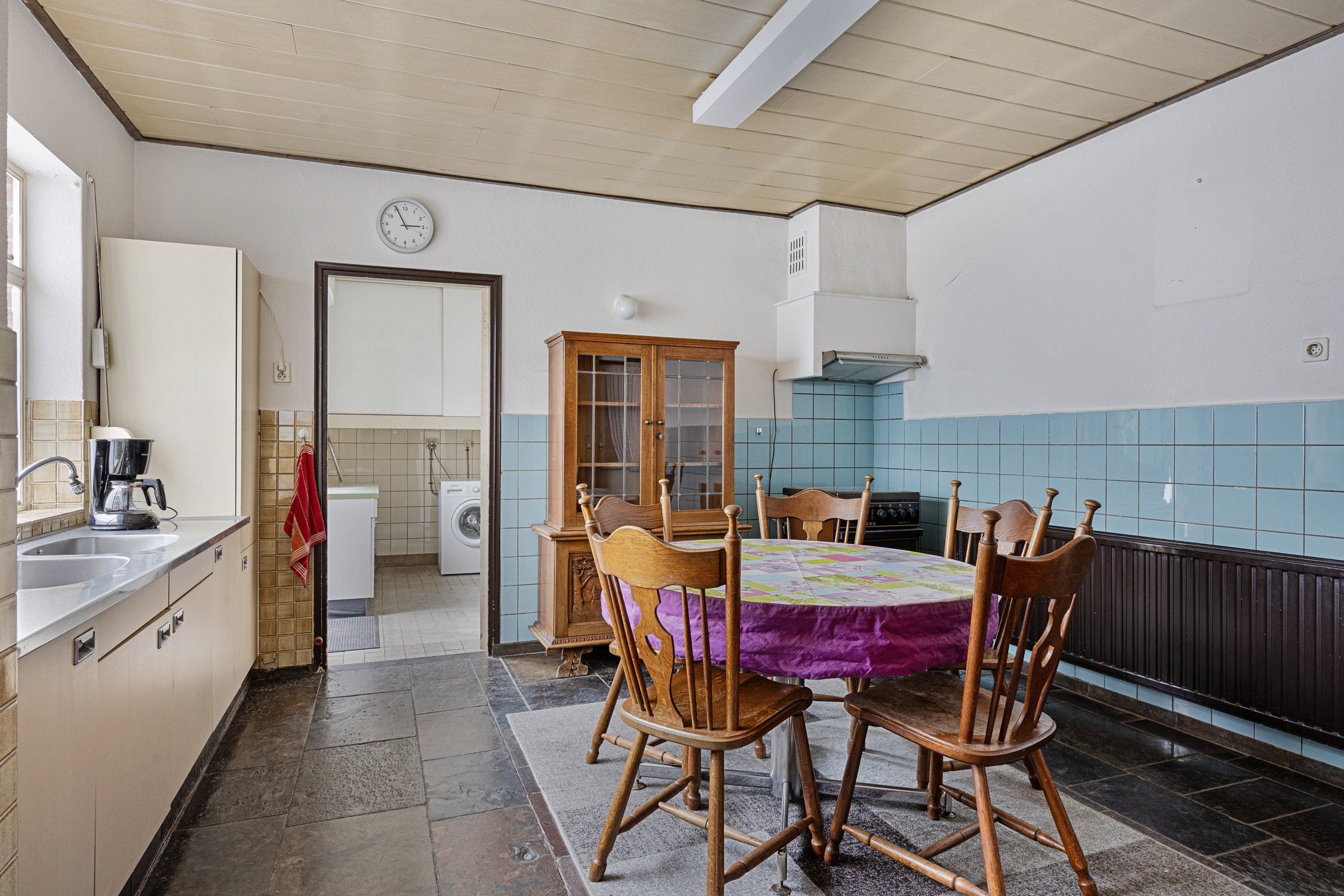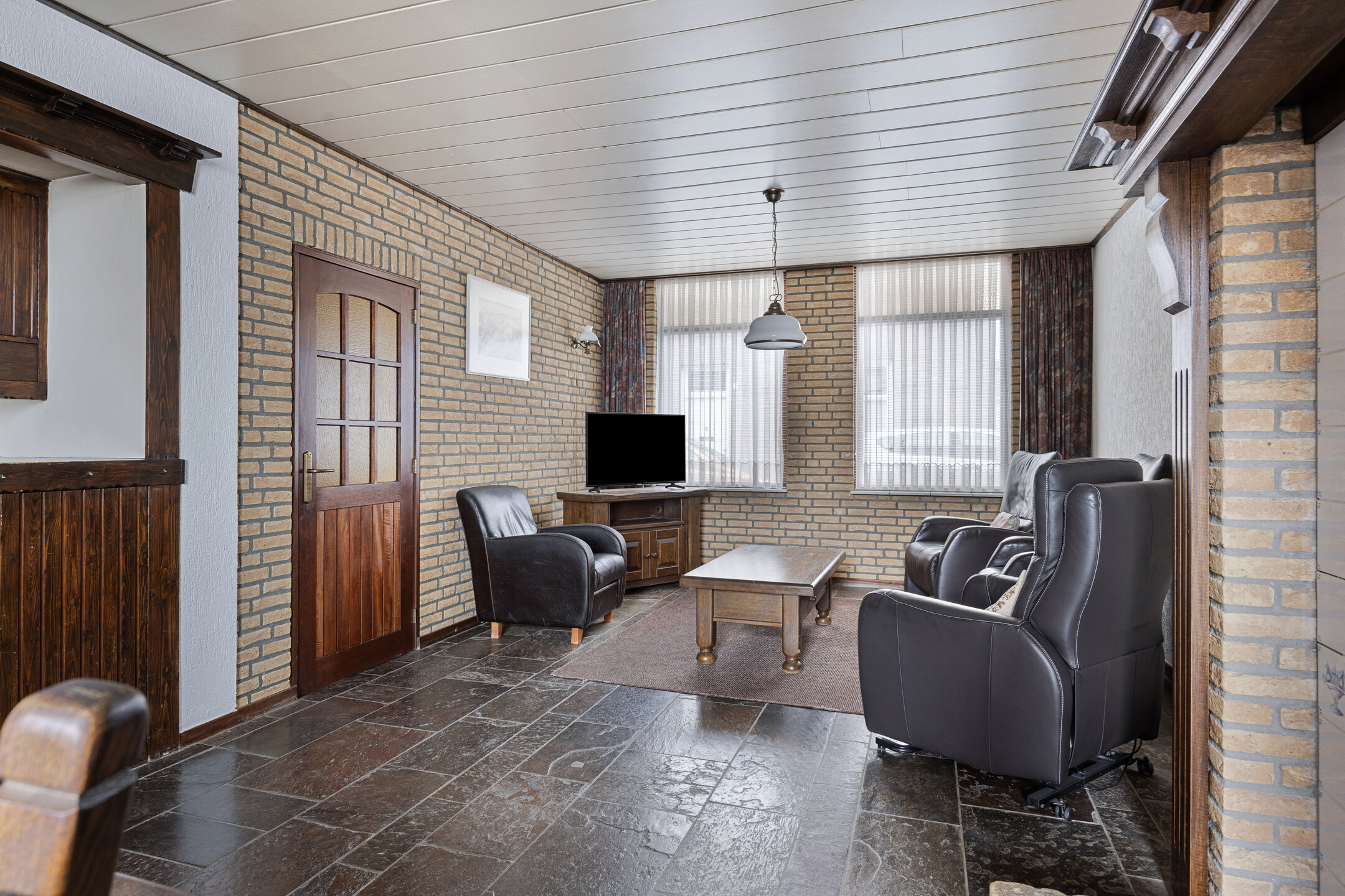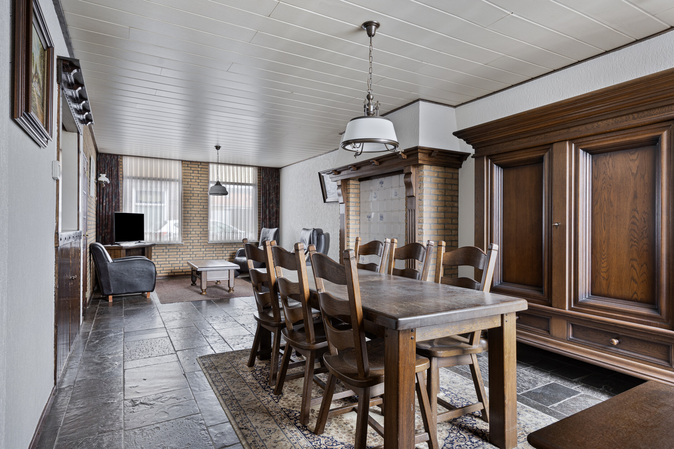 U betreedt de woning via de hal, waar u voldoende ruimte vindt voor een garderobe en toegang krijgt tot de royale woonkamer. De woonkamer is diep en voorzien van grote raampartijen aan de voorzijde, waardoor er veel daglicht binnenvalt. De sfeervolle ruimte is afgewerkt met een leistenen vloer en een karakteristieke schouw met betegeling. Aan de achterzijde van de woning bevindt zich de ruime keuken met eenvoudig keukenblok, gaskookplaat en afzuigkap. Hier is voldoende ruimte voor uw droomkeuken en een grote eettafel. Vanuit de keuken is er toegang tot de trap naar boven, een loopdeur richting de garage, en de praktische bijkeuken met witgoedaansluitingen, het toilet en een eenvoudige badkamer met douche en wastafel.