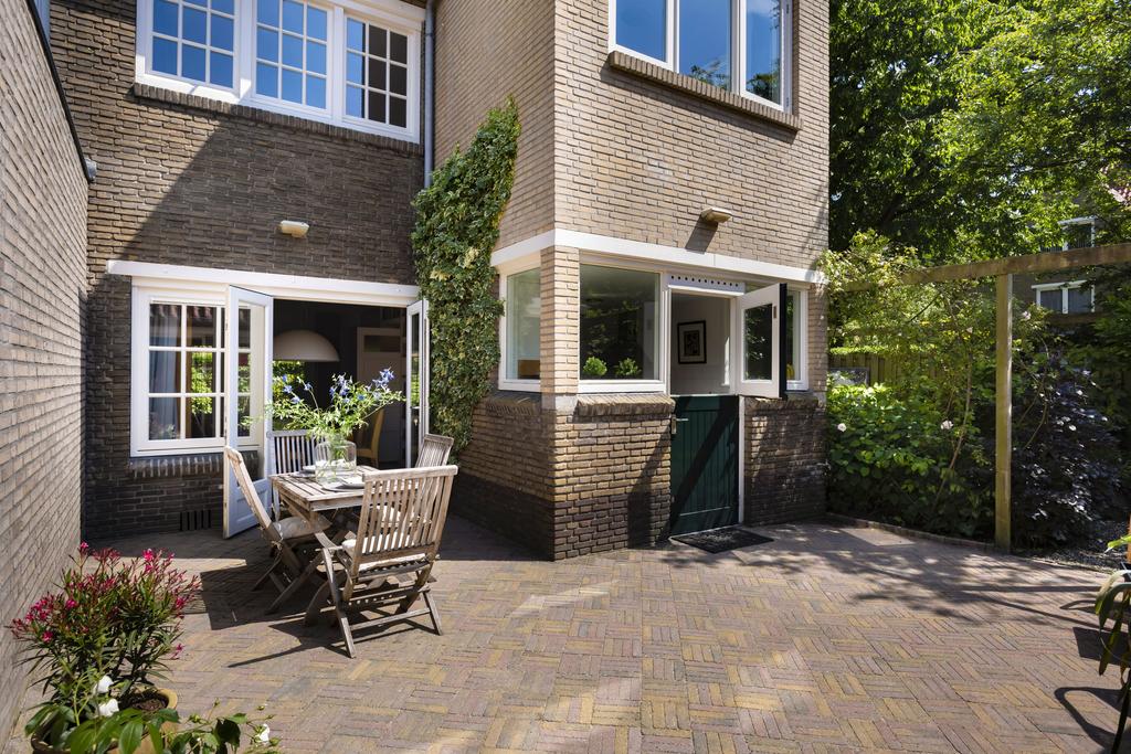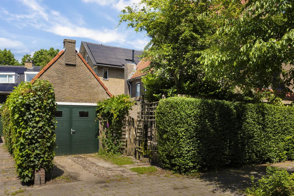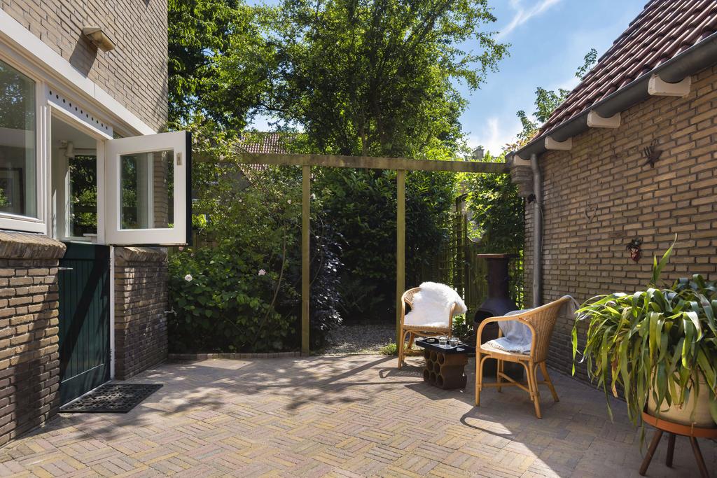 Buiten: De riante tuin is te bereiken via de openslaande deuren in de woonkamer of een deur in de keuken. De tuin is voor een deel keurig bestraat en u kunt hier volop van de zon en het buitenleven genieten. Aan de zijkant van de woning loopt de tuin door en hier vindt u een combinatie van allerlei soorten beplanting en verschillende terrassen. Hierdoor is er altijd zowel een plek in de zon, als in de schaduw te vinden. Door omheiningen rondom geniet u bovendien van optimale privacy. Aangrenzend bevindt zich de garage met plek voor uw auto, fietsen en andere opbergspullen.