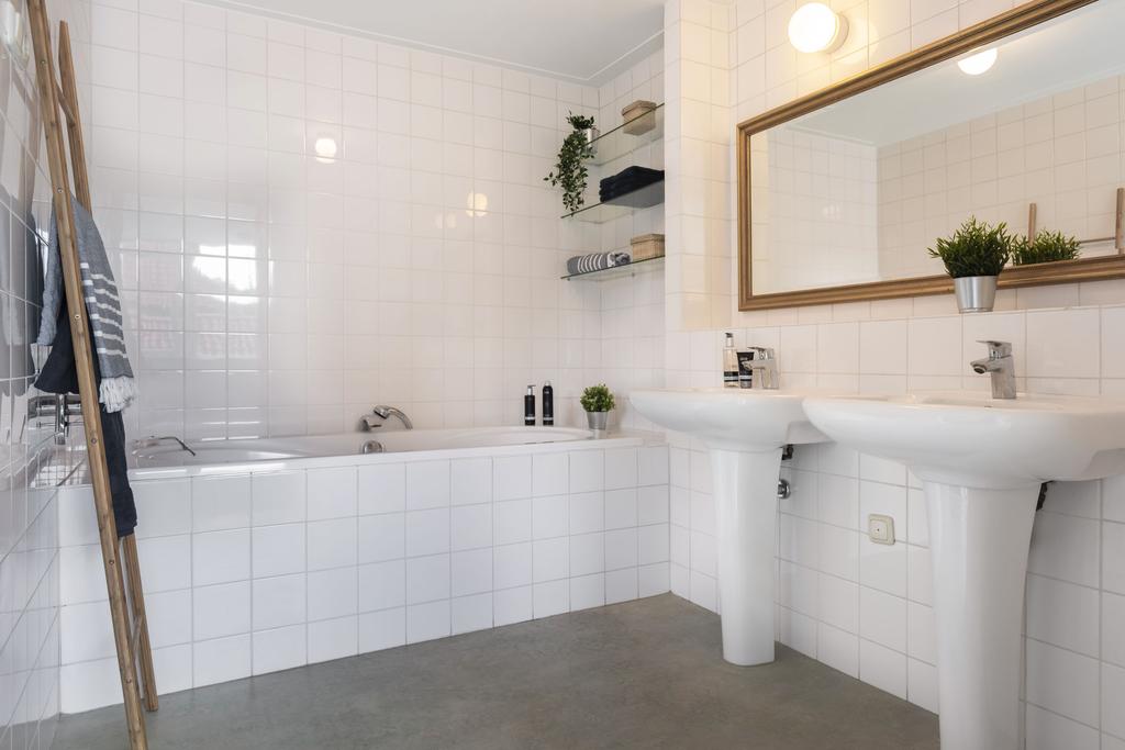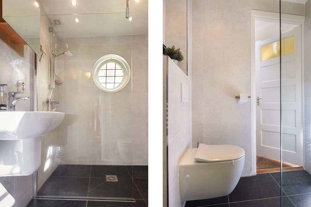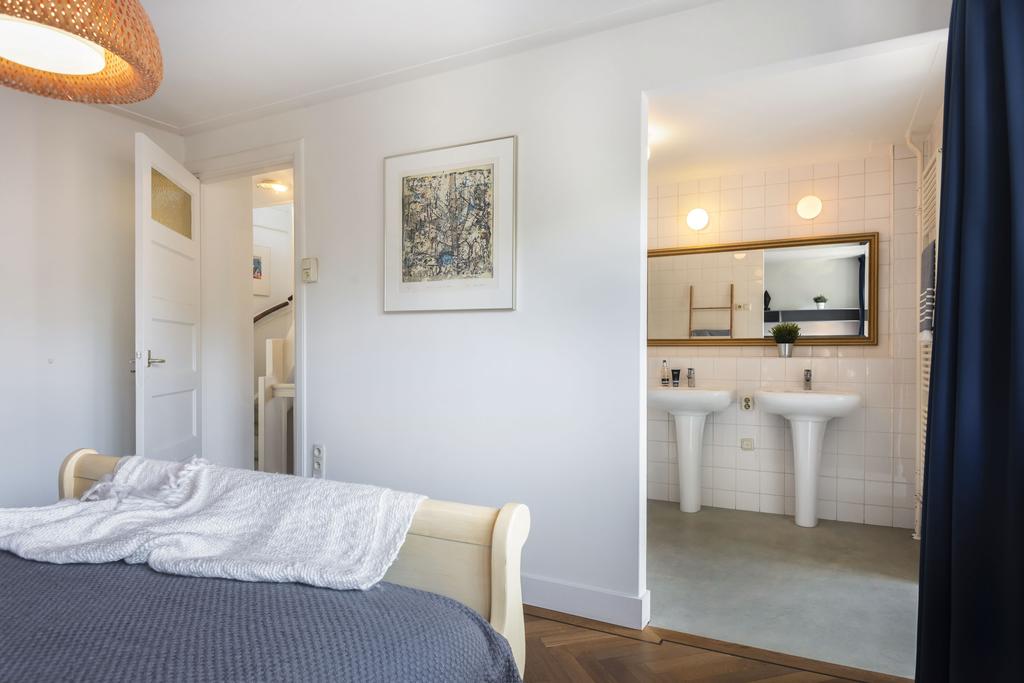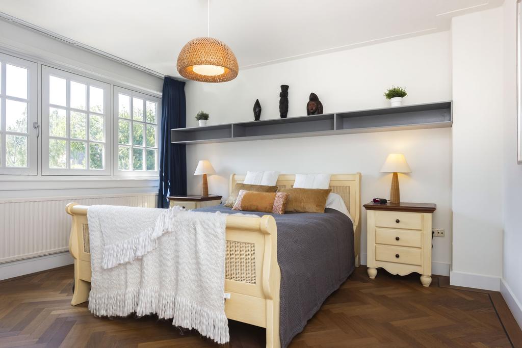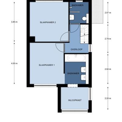Eerste verdieping: Via de trapopgang bereikt u de overloop op de eerste verdieping. Hier geven deuren toegang tot twee royale slaapkamers en een badkamer. De slaapkamers profiteren van veel lichtinval door raampartijen over de gehele breedte en zijn voorzien van een fraaie visgraatparketvloer. De slaapkamer aan de achterzijde (de master bedroom) beschikt over een badkamer en suite en een ruime inloopkast. Beide slaapkamers zijn ongeveer 14 m² groot en wanden en plafonds zijn strak afgewerkt. De badkamer die via de overloop te bereiken is, is op moderne wijze betegeld en hier vindt u een ruime inloopdouche met glazen wand, wastafel en hangend toilet. De badkamer en suite is uitgerust met twee wastafels en een ligbad.