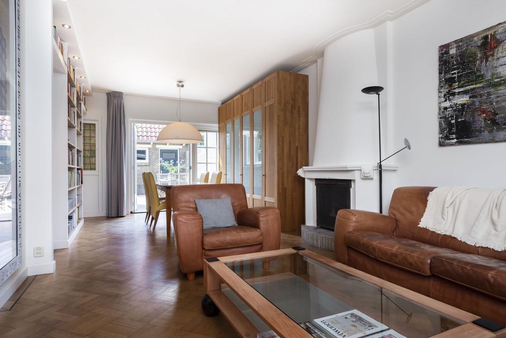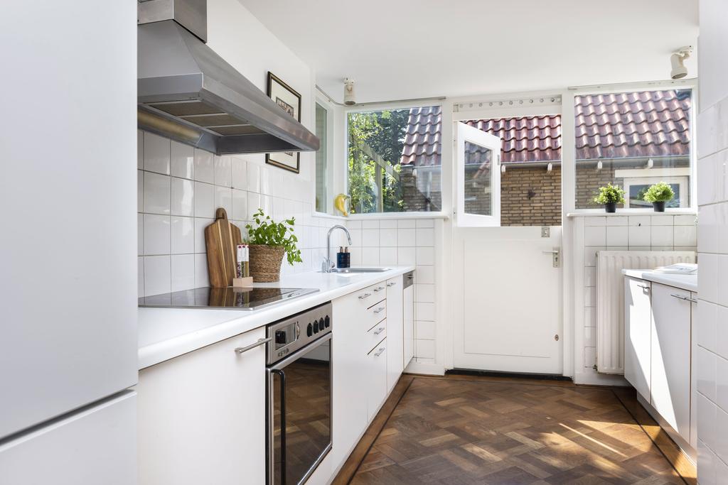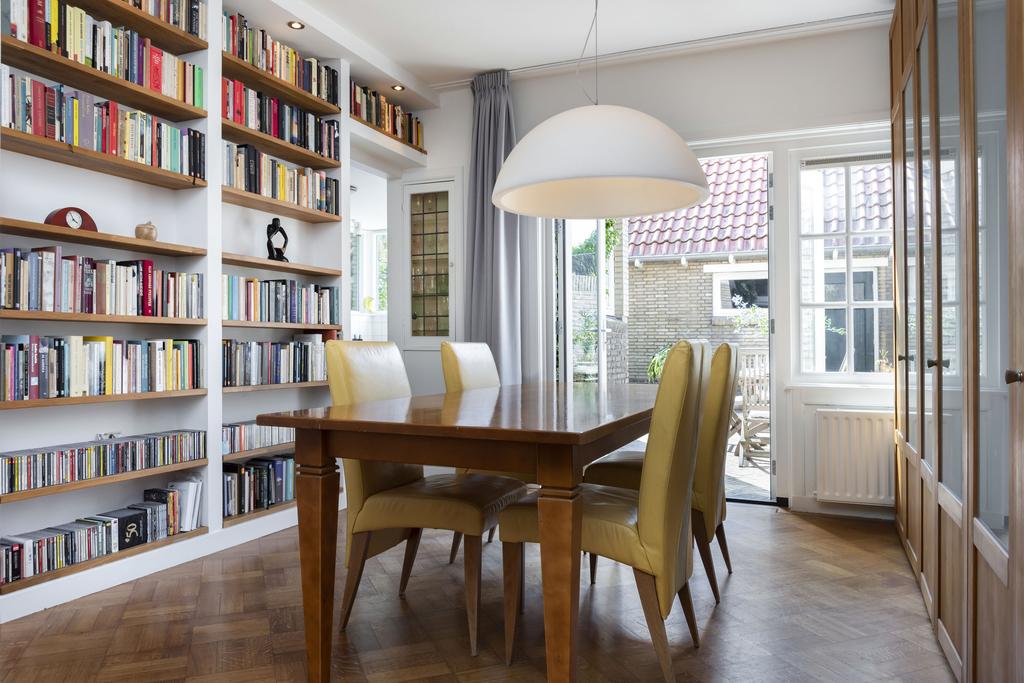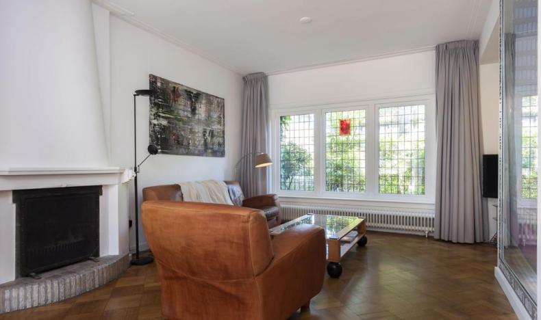 Indeling Begane grond: U betreedt de woning via een ruime hal. Bij binnenkomst maakt u kennis met een elegante plavuizenvloer. In de gang vindt u een toiletruimte, een grote kelderkast en de trapopgang. Een deur geeft toegang tot de royale woonkamer. De woonkamer representeert het unieke karakter van de woning: een combinatie van authentieke woonelementen en eigentijds comfort. Een karakteristieke schouw, een charmante erker en raampartijen met klassiek glas-in-lood springen direct in het oog, terwijl een prachtige eiken mozaïekvloer zich uitstrekt over het ruime oppervlak. Wanden en plafonds zijn strak afgewerkt met glad stucwerk. Een ingebouwde boekenkast met stijlvolle lichtspotjes in de eethoek geeft veel sfeer en u kijkt uit op de zonnige tuin, die te bereiken is via openslaande deuren. De woonkamer grenst aan de open keuken, die ruim is opgezet en uitgerust met diverse inbouwapparatuur. Ook vanuit de keuken heeft u een aangenaam uitzicht op de tuin.