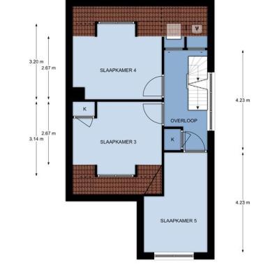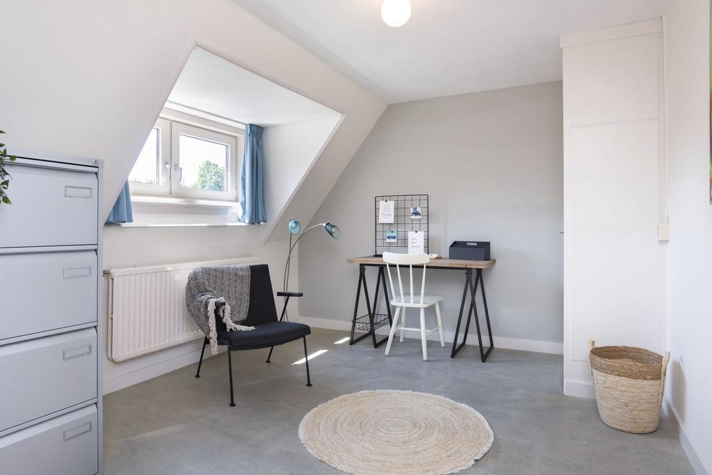 Tweede verdieping: Op de tweede verdieping heeft u toegang tot drie slaapkamers. Op de overloop bevinden zich de witgoedaansluitingen en een cv-installatie. De slaapkamers zijn ruim en uitstekend geschikt als kinderkamers. Dakramen laten veel licht binnen en hoge nokken maken de kamers ruimtelijk. Op alle slaapkamers ligt een keurige pvc-vloer.