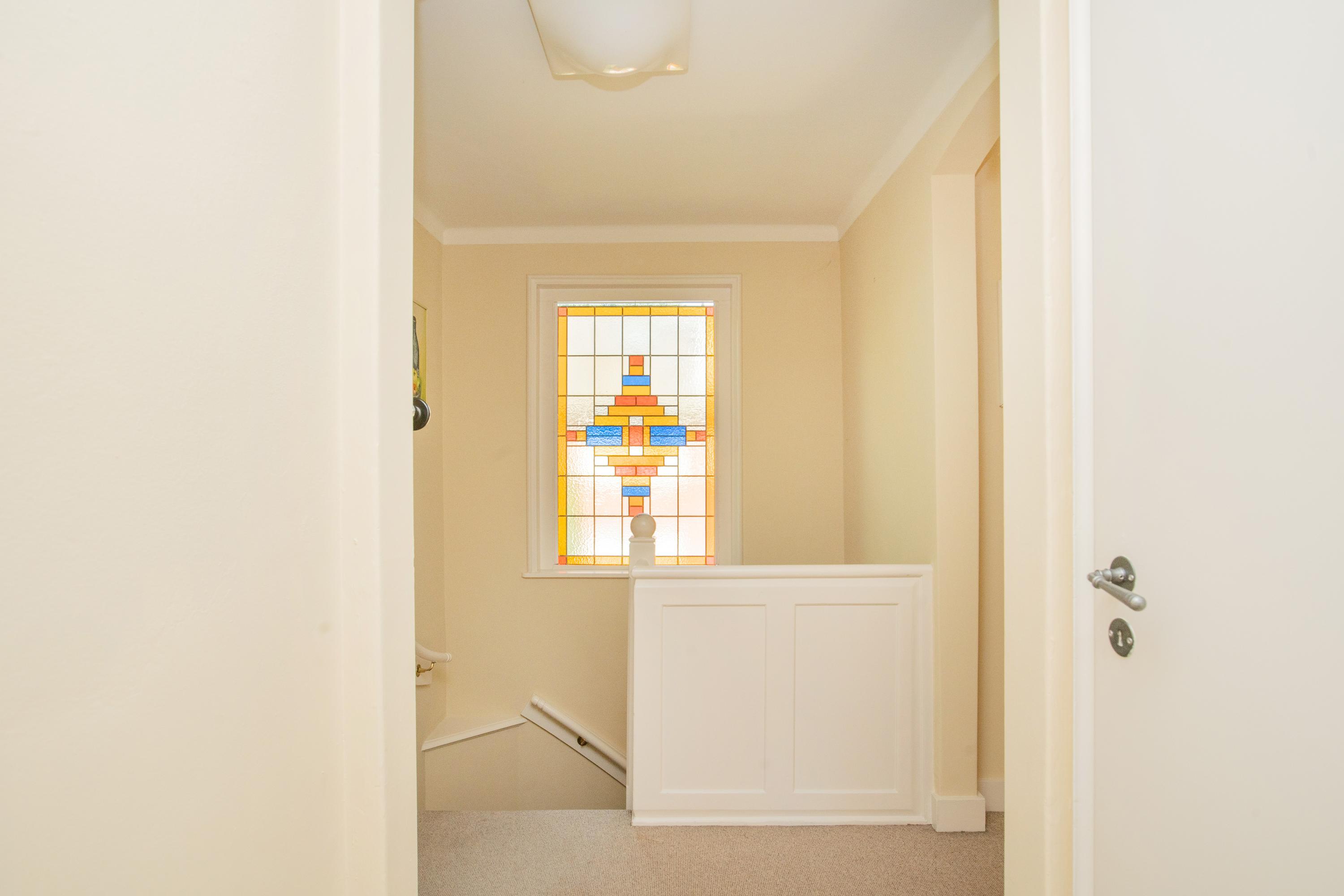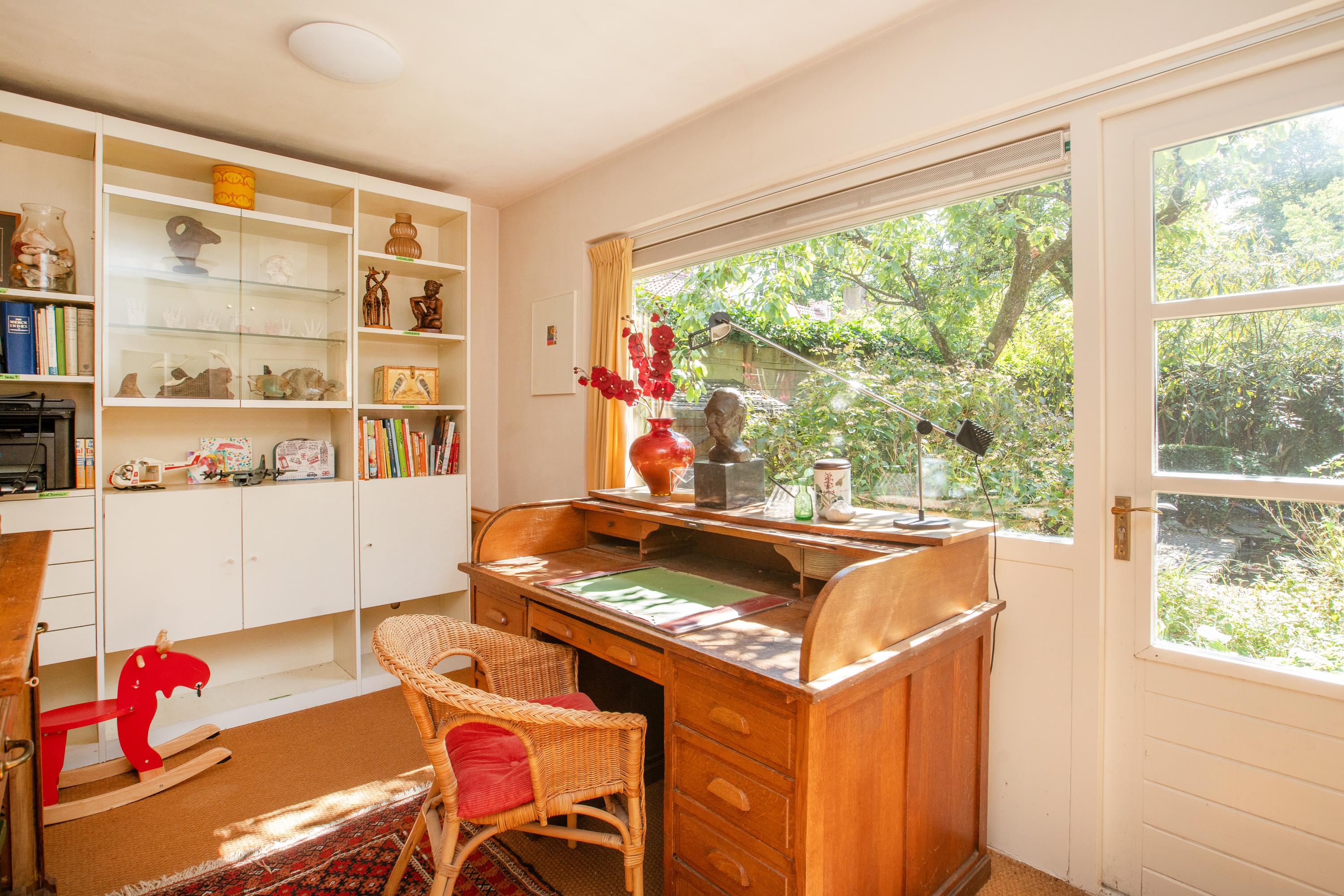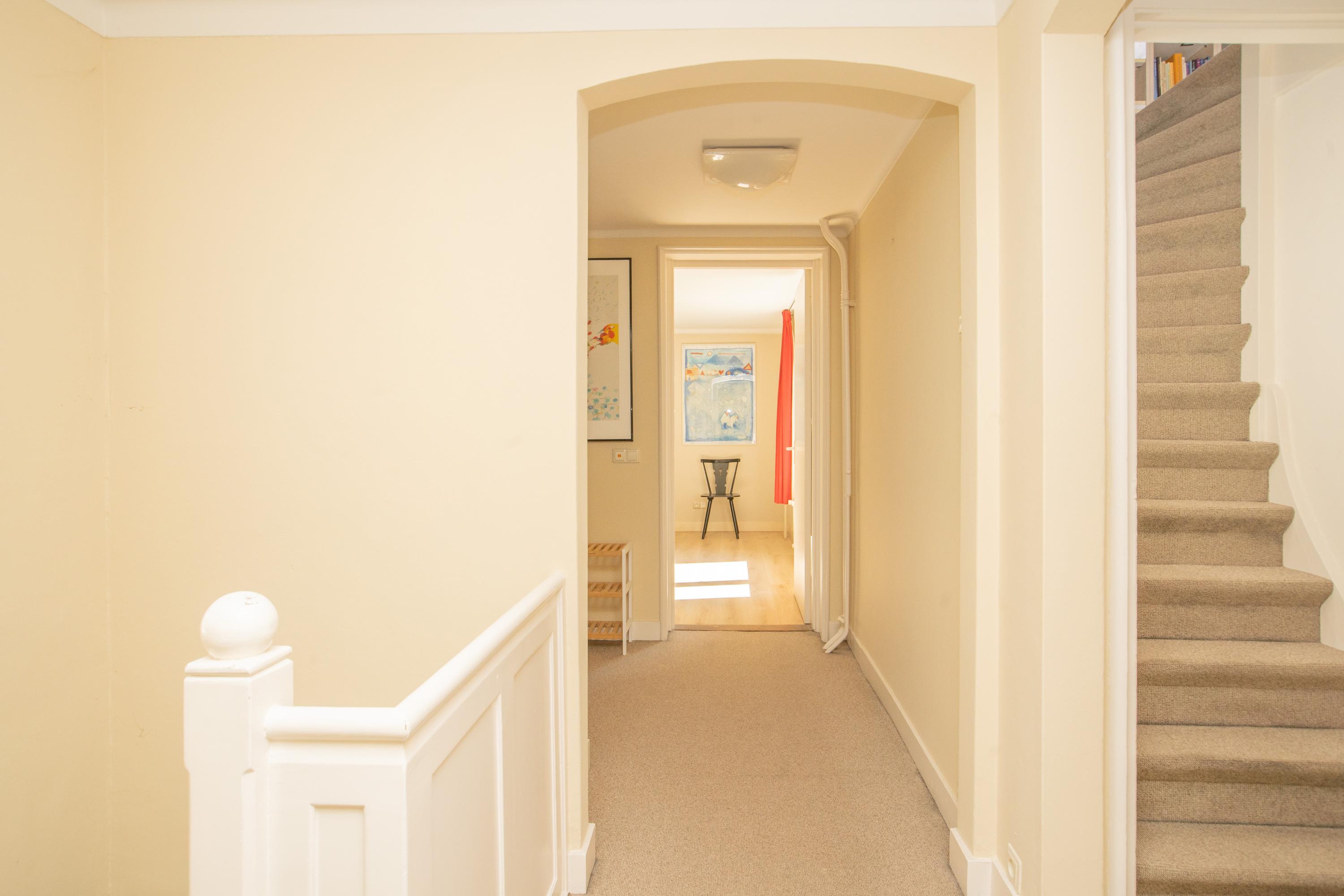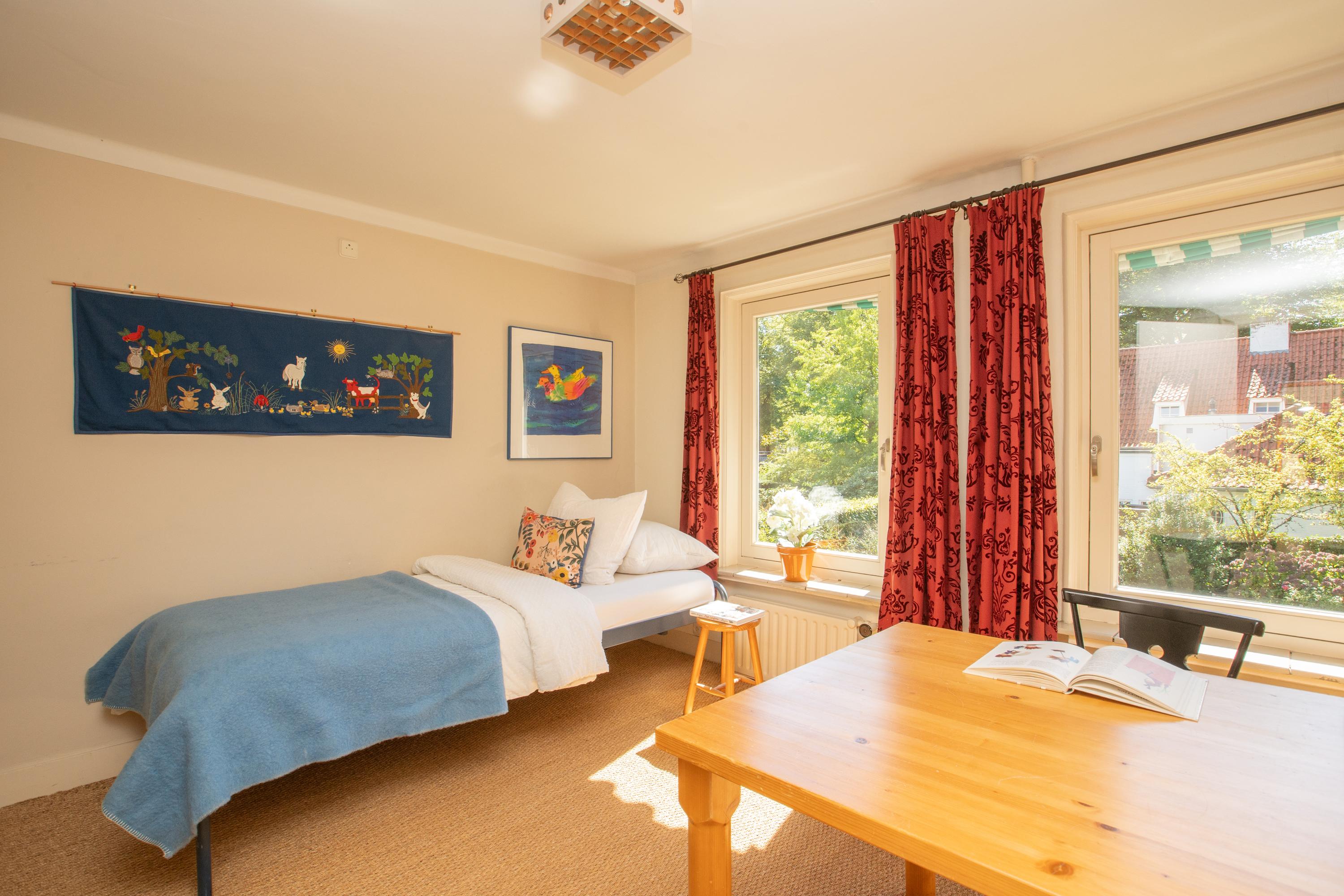 Eerste verdieping met meerdere slaapkamers Op de eerste verdieping wachten meerdere slaapkamers, elk met hun eigen karakter. De hoofdslaapkamer heeft twee inbouwkasten en uitzicht op de groene, rustige straat. Een tweede ruime kamer – met ramen aan beide zijden – biedt flexibiliteit als kantoor, logeerkamer of atelier. Hier is toegang tot een zolder, bereikbaar met een vlizotrap, waar de cv-ketel is ondergebracht. Er is een praktische linnenkast op de overloop. Twee badkamers maken het comfortabel voor grotere gezinnen: één met ligbad, douche, dubbele wastafel en de andere met een royale inloopdouche en wastafel. Daarnaast is er een apart toilet met daglicht. De derde slaapkamer met twee grote ramen op de tuin wordt nu ‘de mooiste’ genoemd. Deze kamer heeft een vaste kast en een eigen wastafel.