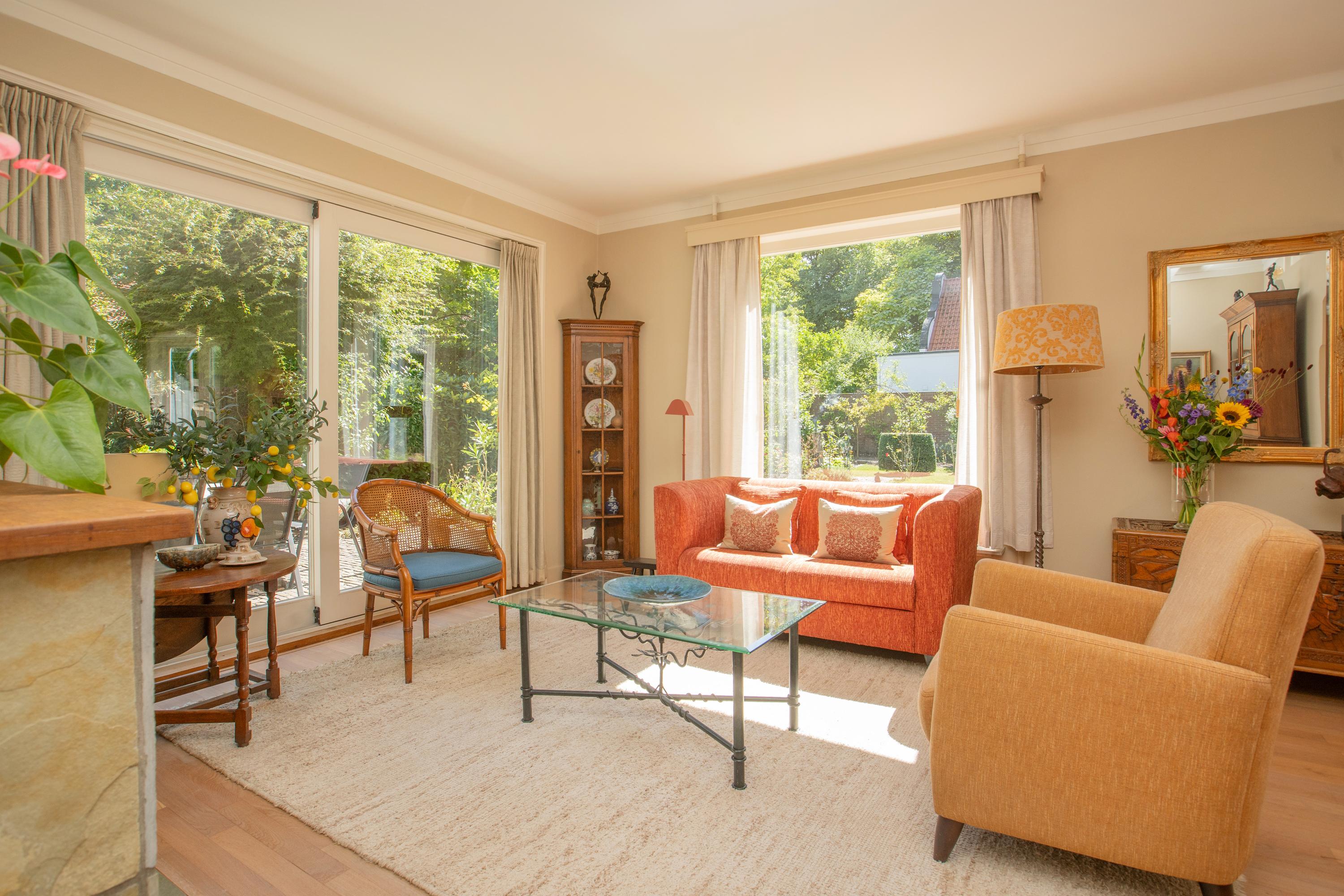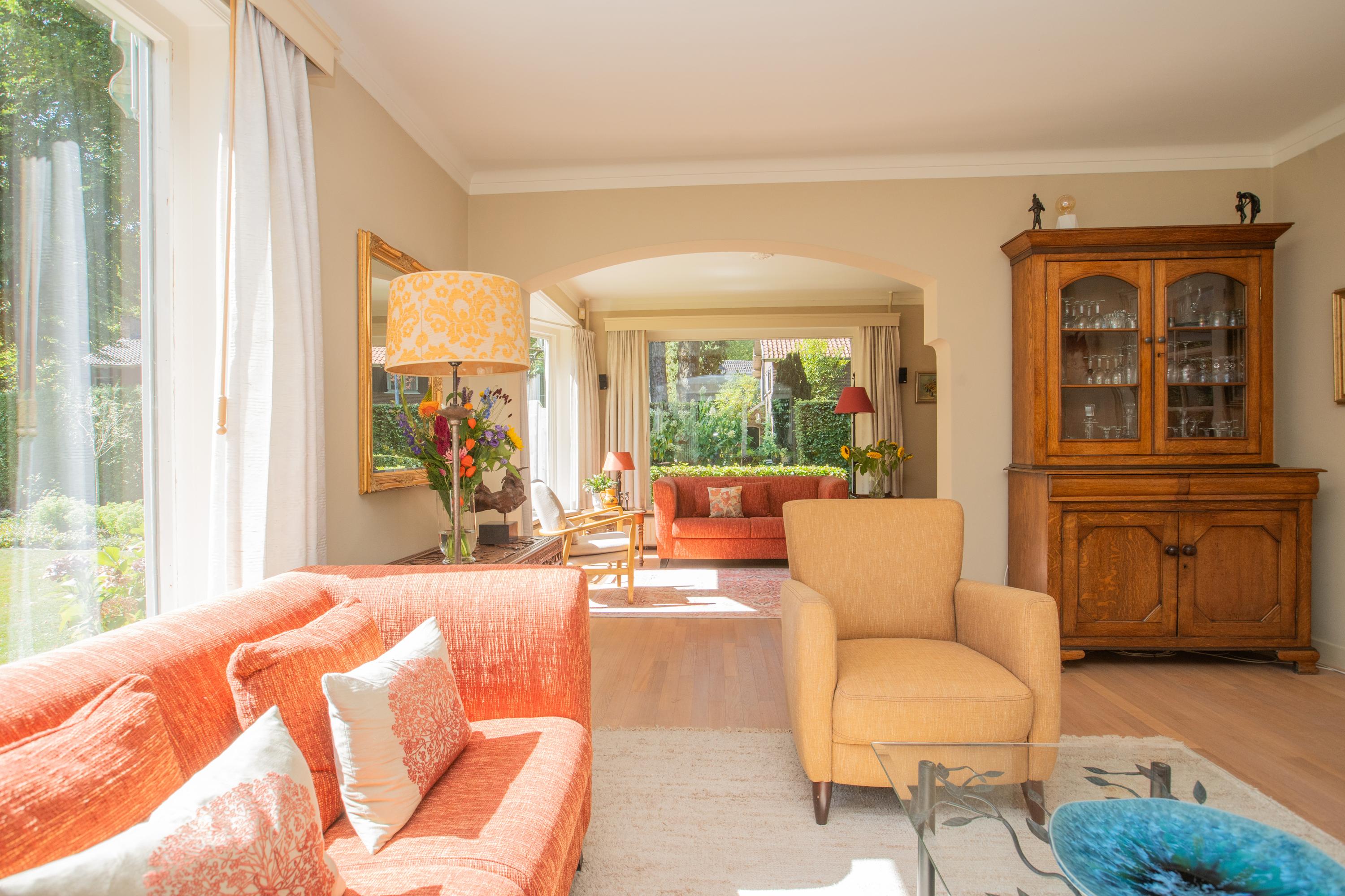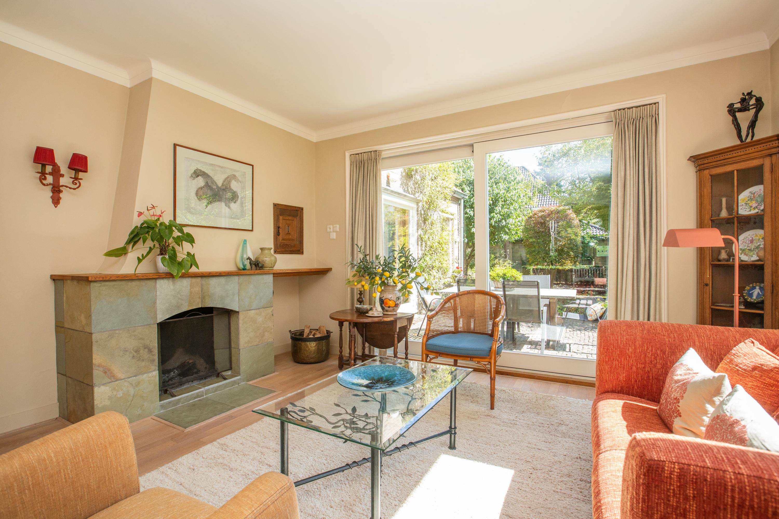 Comfortabele woonkamer met karakter en lichtinval In de woonkamer stroomt daglicht rijkelijk naar binnen, met grote ramen die zicht geven op de tuin. Deze kamer met houten parketvloer heeft twee zitgedeeltes en een gezellige open haard. Is het karakteristieke deurtje rechtsboven de haard opgevallen? Dit was ooit een pijpenkastje van de allereerste bewoner. De gezelligheid uit de keuken verplaatste zich vaak naar de woonkamer. Eveneens een heerlijke ruimte voor samenzijn, maar ook voor afzondering wanneer dat gewenst was. De screens en markiezen zorgen voor comfort op warme dagen.
